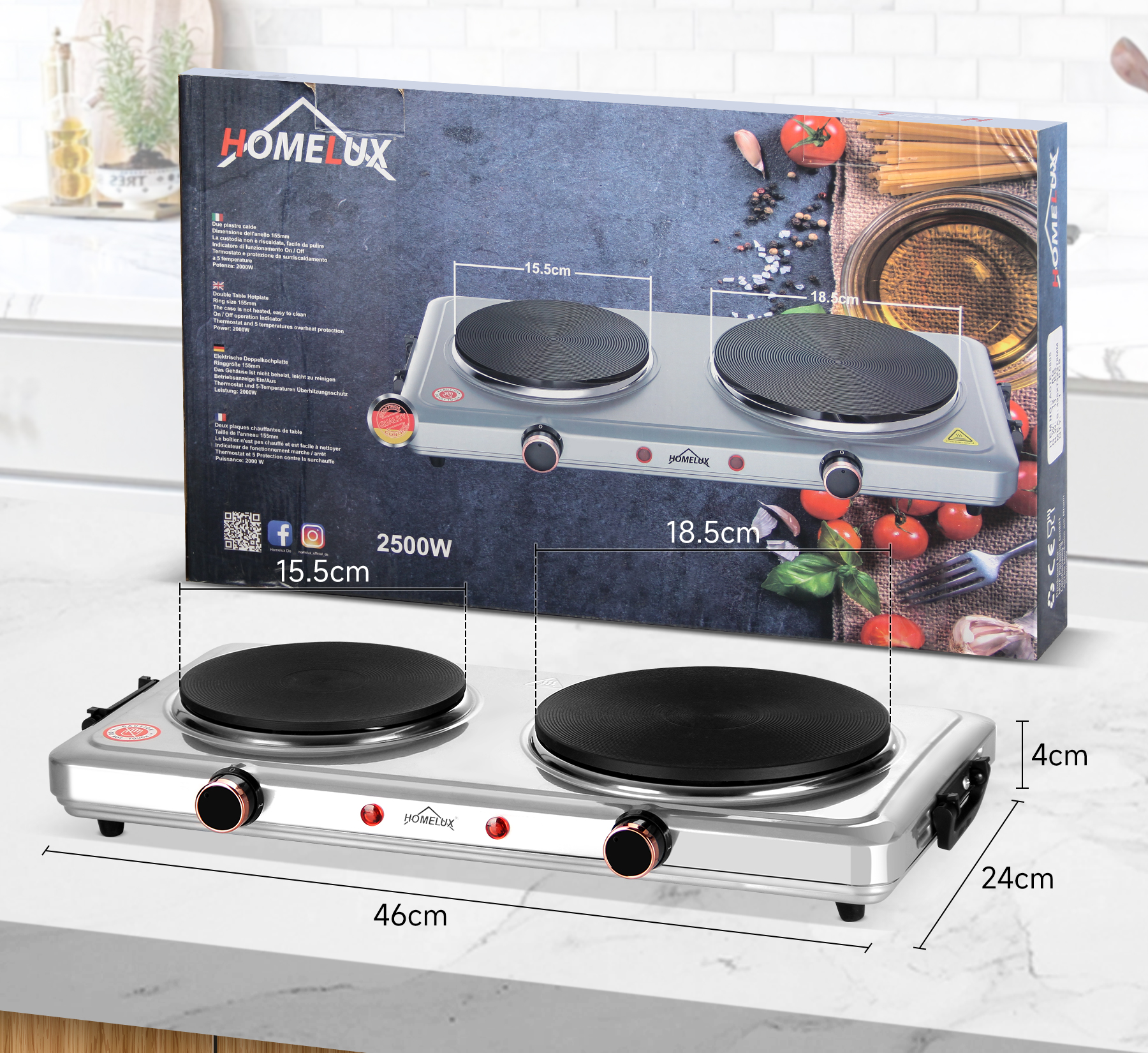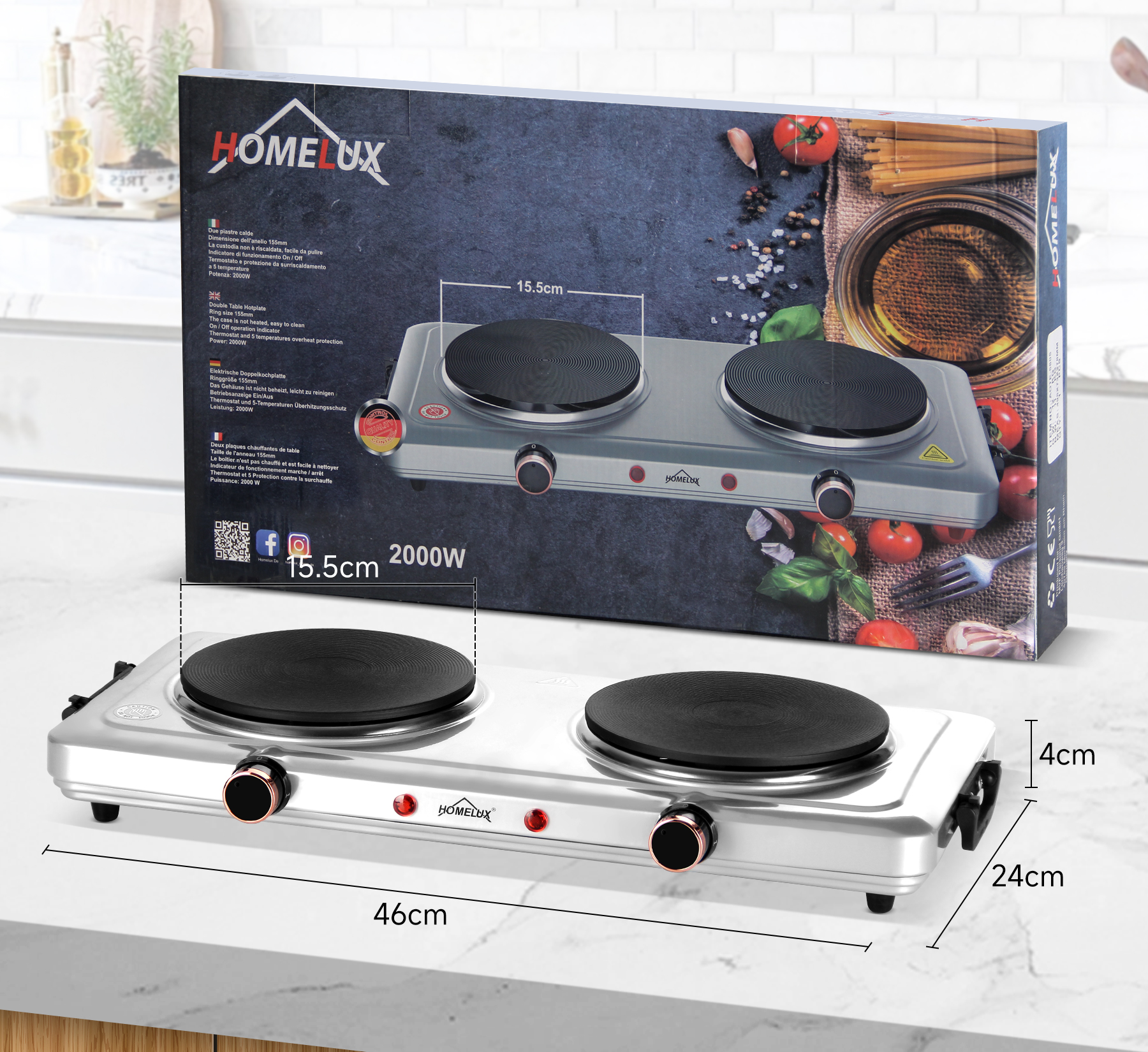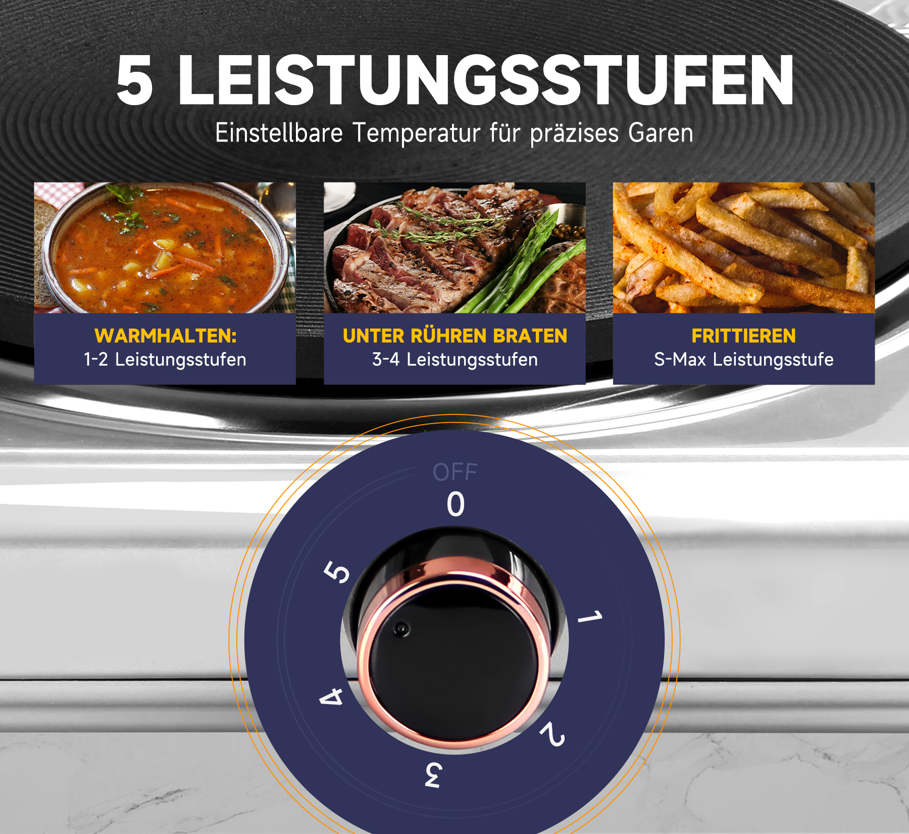 Mit einer kombinierten Wattzahl von 1000 W + 1000 W, zwei Kochplatten und individuellen Temperaturreglern können köstliche Mahlzeiten gleichzeitig zubereitet werden. Mit dem variablen Temperaturregler können Sie schnell die gewünschte Hitzeeinstellung LOW, MEDIUM oder HIGH erreichen und beibehalten, um Speisen warm zu halten oder heißes Wasser zu kochen.