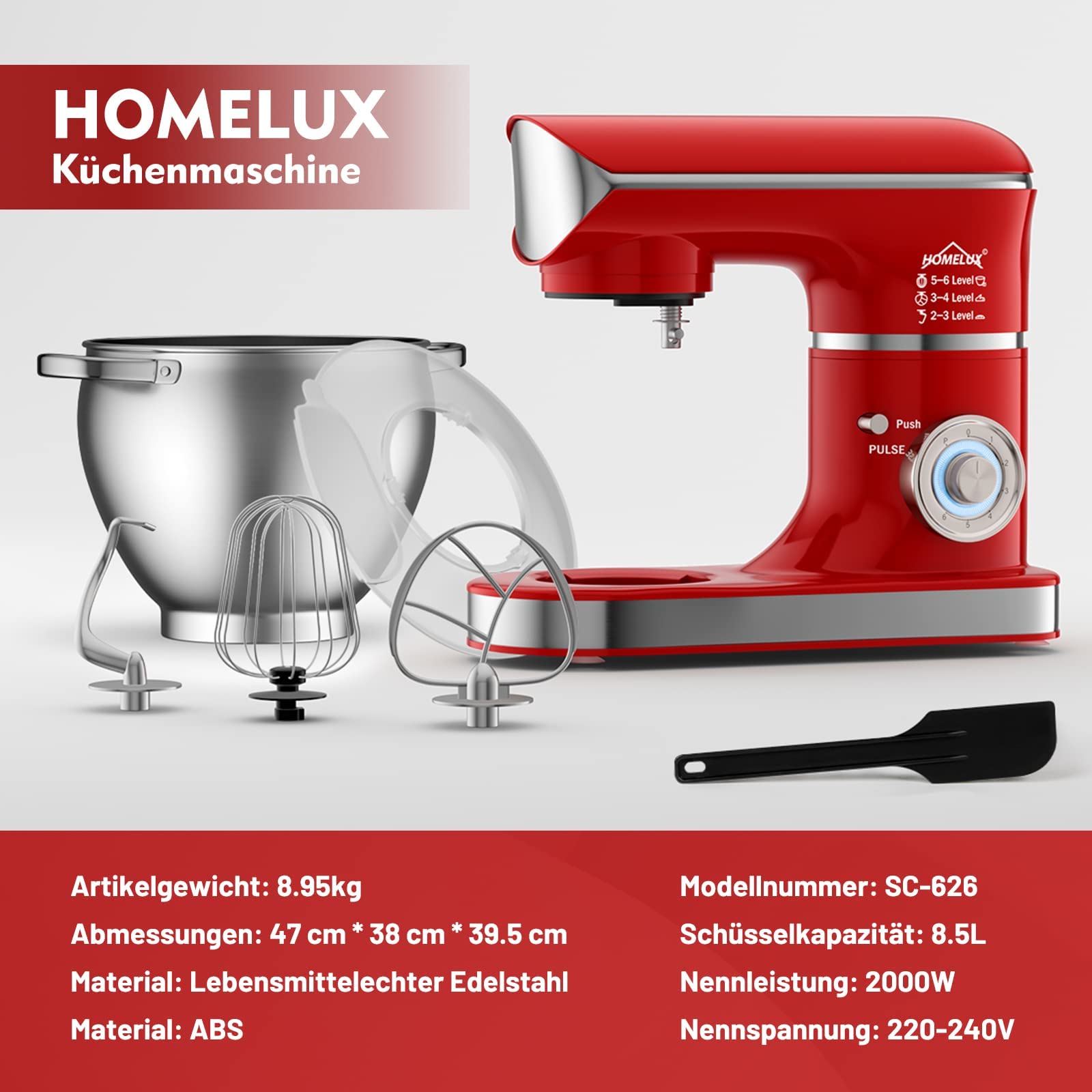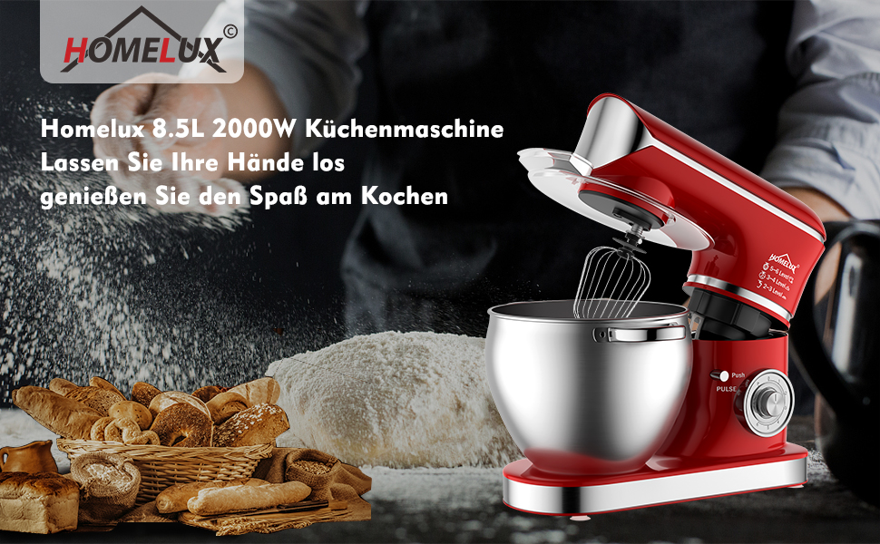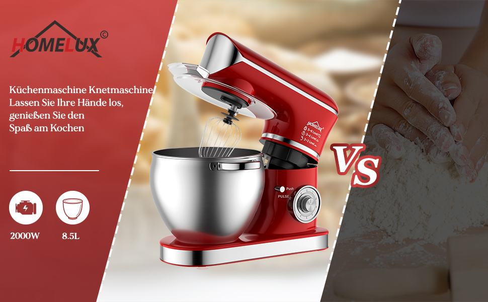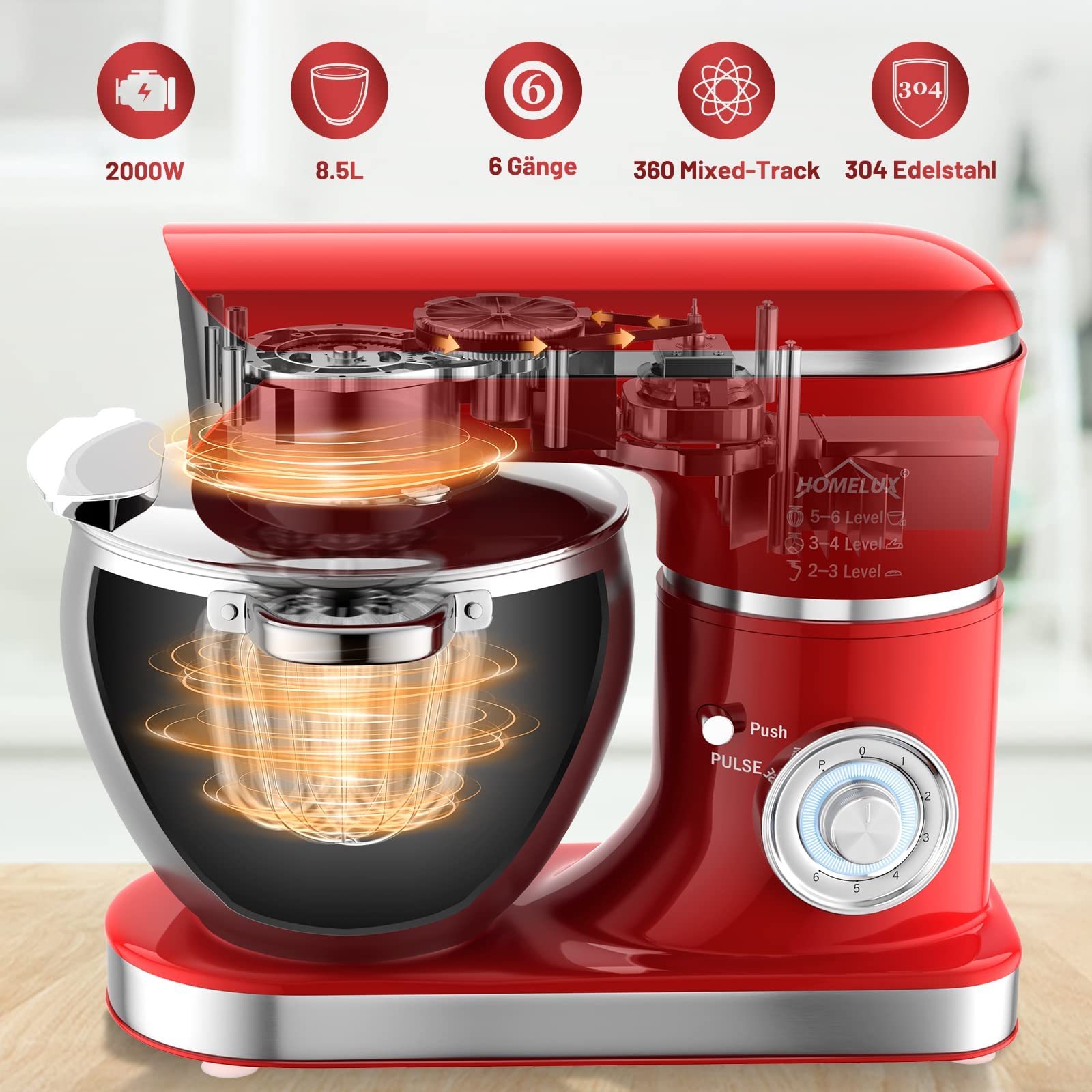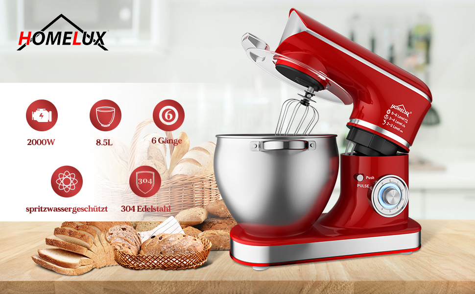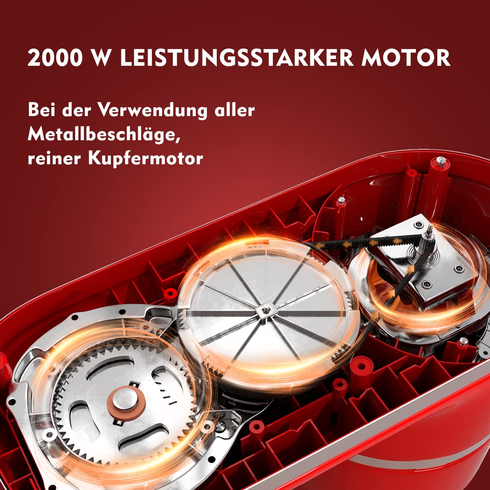 2000-W-Motor beendet das Kneten und Mixen schneller und gründlicher als menschliche Hände;Der Food Mixer verfügt über eine Federhebevorrichtung und ein blaues LED-Licht als Leistungsanzeige.Präziser 6-Geschwindigkeitsregler lässt Sie zwischen langsamem Rühren und schnellem Rühren wählen Die kraftvolle Leistung des planetarischen Mischvorgangs zum Mischen von Brotteig, dicken Teigen, Baiser und Schlagsahne.