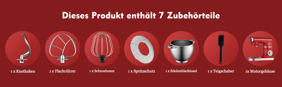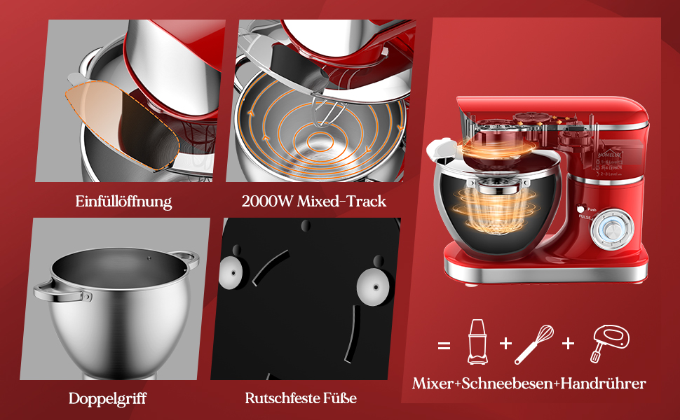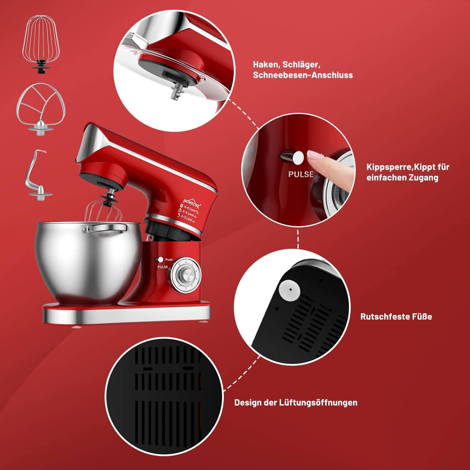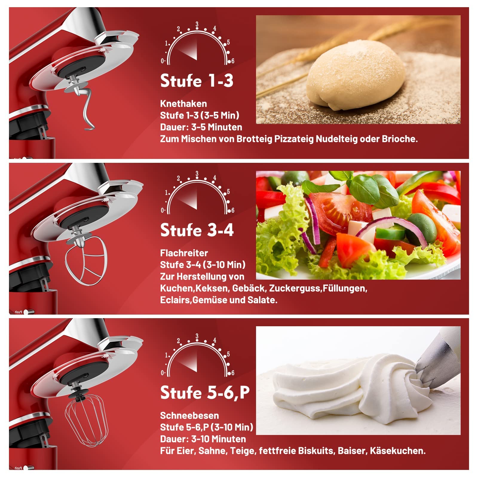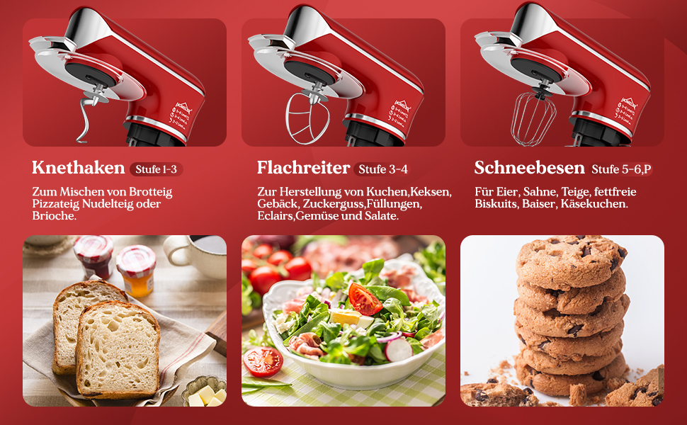 Der multifunktionale Standmixer wird mit 3 Zubehörteilen geliefert: Aluminium-Knethaken, Edelstahl-Drahtschneebesen und Aluminium-Rührbesen; die verschiedenen Zubehörteile eignen sich für verschiedene Küchenanforderungen, z. B. für die Zubereitung von Teig, Keksen, Gebäck, Waffeln usw. Sie helfen Ihnen bei allen Aufgaben, vom Kneten von Pizzateig über das Mischen von Plätzchenteig bis zum Schlagen von Sahne (Hinweis: Die Aufsätze sind nicht spülmaschinenfest)