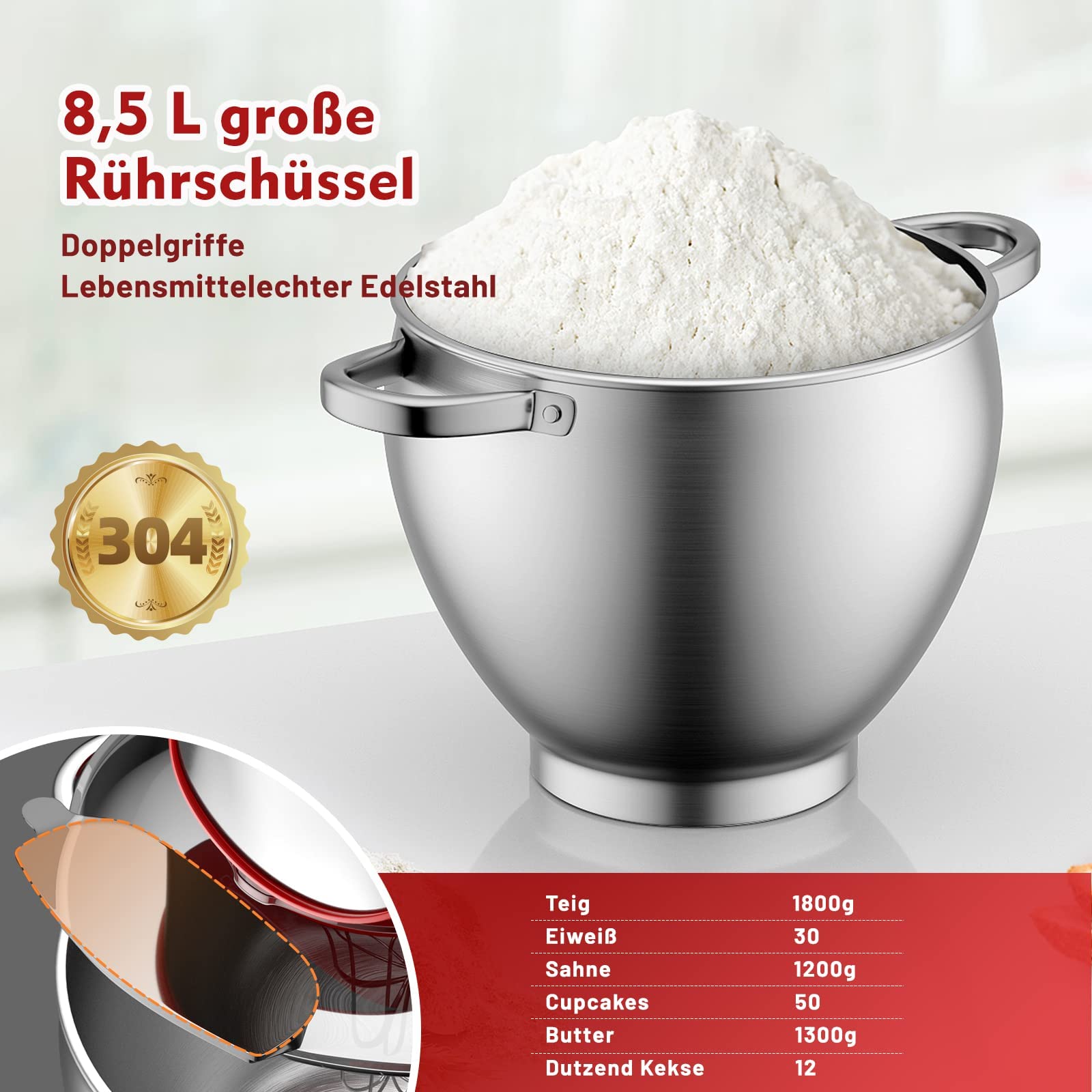 Dieser Mixer wird mit einer 8,5 l 304 großen Edelstahlschüssel geliefert, die genug Kapazität für eine Familie bietet. Der Doppelgriff an der Schüssel erleichtert das Halten und Rühren des Küchenmixers. Der elektrische Küchenmixer ist einfach zu bedienen für die Zubereitung von Kuchen, Brot, Keksen, Gebäck, Muffins, Waffeln, Kartoffelpüree, Salat usw. (Die Edelstahlschüssel ist für eine einfache Reinigung spülmaschinenfest.)