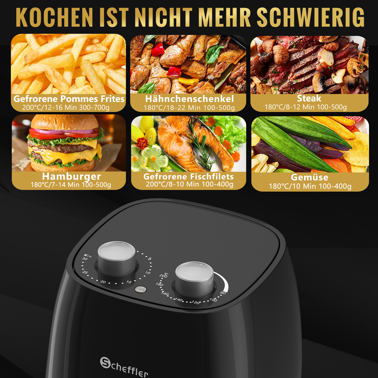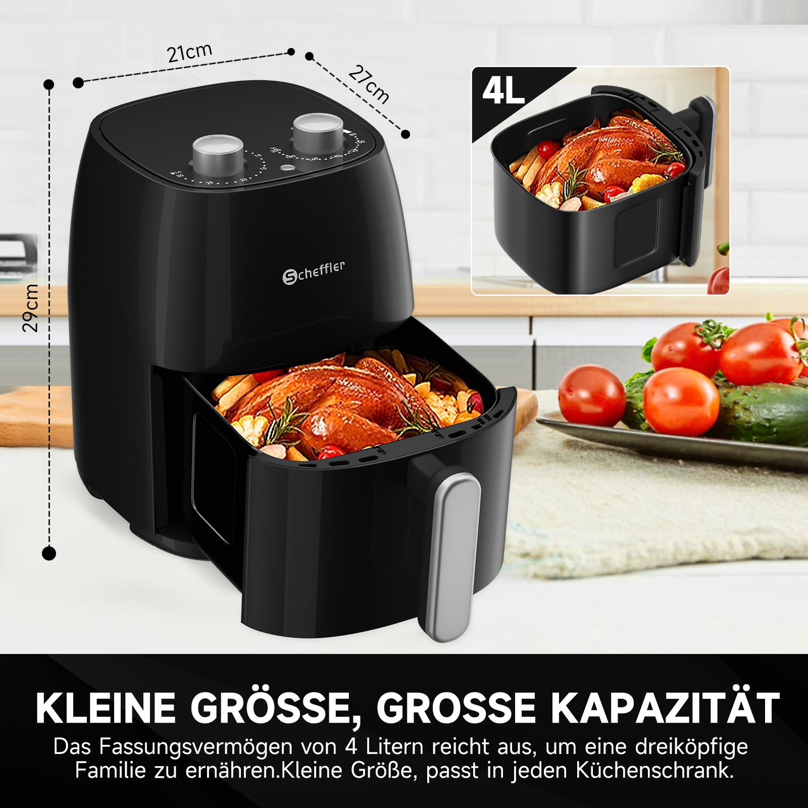 Mit einem Fassungsvermögen von 4 Litern können Sie in der air fryers xl bis zu 800 g Pommes Frites zubereiten – genug, um eine dreiköpfige Familie zu ernähren! Das schlichte und stilvolle Design der schwarzen heissluftfritteuse schmückt Ihre Küche; die kleine Größe passt auch in jeden Küchenschrank und ist ein Muss für Ihre erste Wohnung, kleinere Küche, das Wohnen im Wohnheim oder auf Reisen mit dem Wohnmobil/Wohnmobil.
