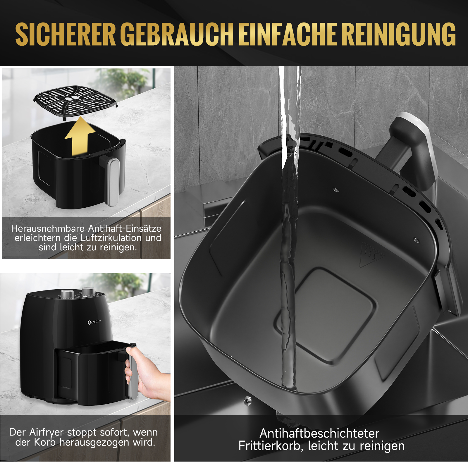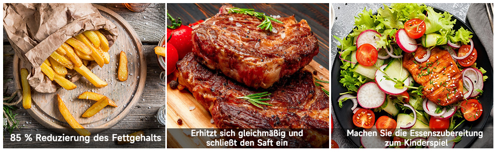 Dank des schnellen Luftzirkulationssystems der 1500W Luftfritteuse kann sich die Luft schnell erwärmen und um Ihre Lebensmittel zirkulieren, wodurch die Lebensmittel gleichmäßig gegart und Feuchtigkeit eingeschlossen werden, was zu einer unvergleichlichen Knusprigkeit führt. Darüber hinaus verbraucht es bis zu 85 % weniger Öl und ist 30 % effizienter im Vergleich zum herkömmlichen Frittieren.