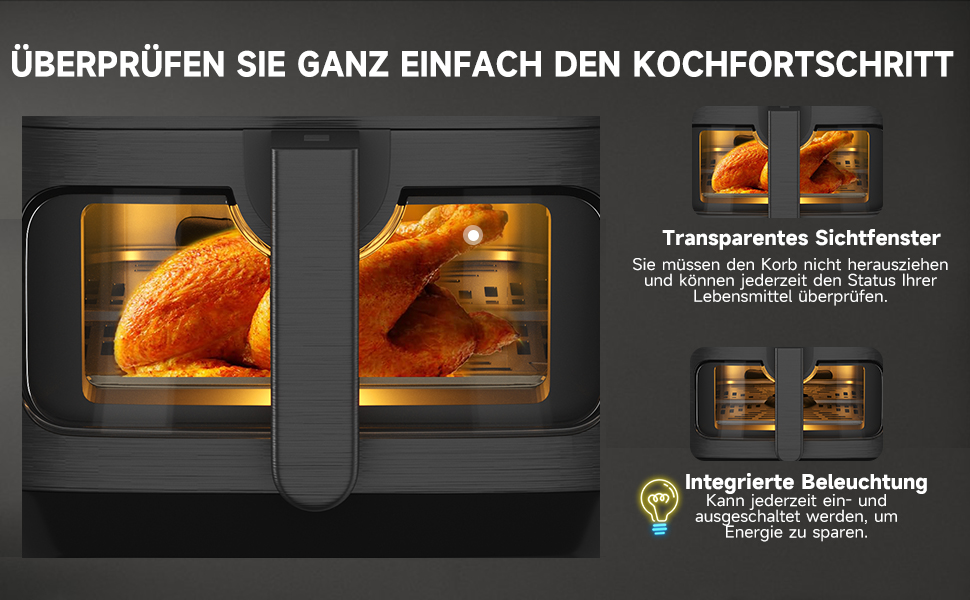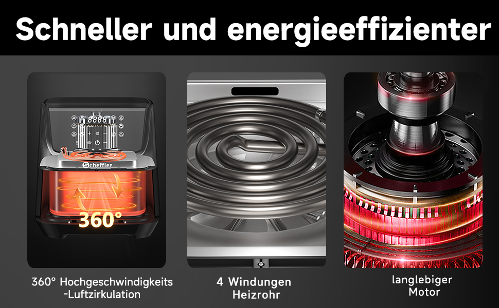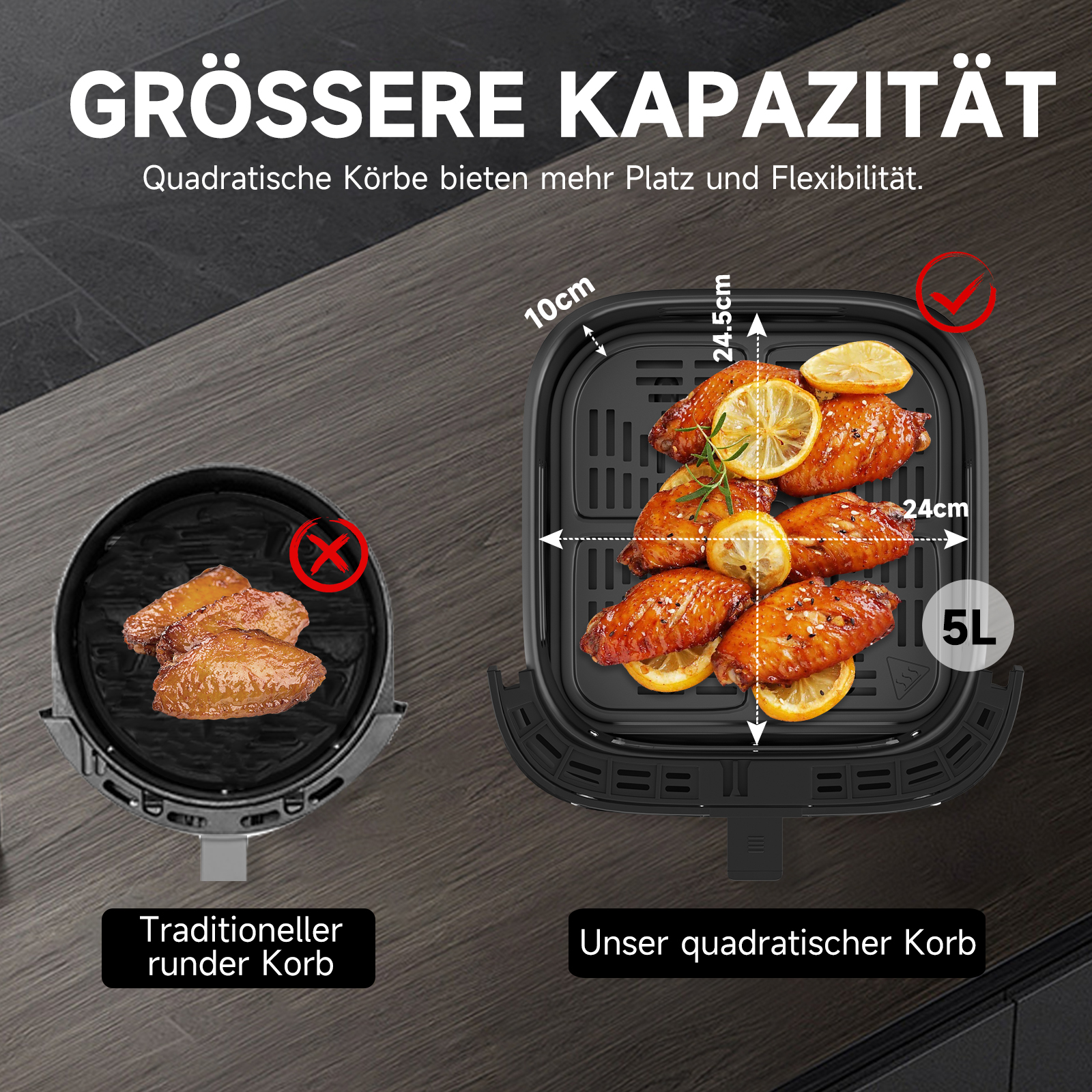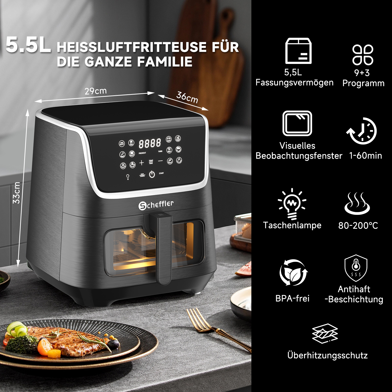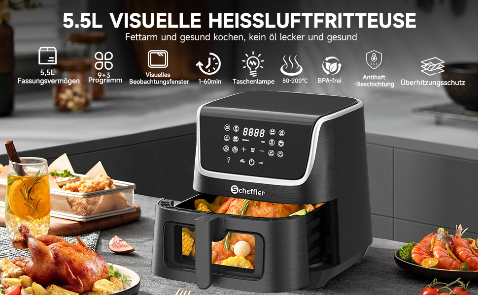 Durch das einzigartige transparente Sichtfenster und die integrierte Beleuchtung von Scheffler heissluftfritteuse können Sie jederzeit den Status der Lebensmittel überprüfen, ohne den Korb herausziehen zu müssen. Das große Fassungsvermögen von 5.5 l reicht aus, um ein ganzes Hähnchen oder 1000 g Pommes Frites zu garen, was ihn ideal für Familien mit 2 bis 6 Personen macht. Ein quadratischer Designkorb bietet mehr Platz und Flexibilität beim Kochen als ein runder Designkorb.