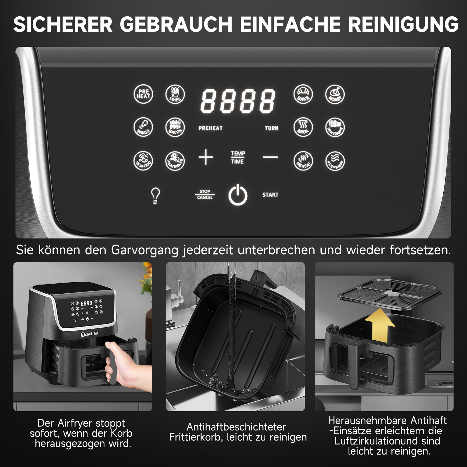 Überhitzungsschutz verhindert Überkochen, rutschfeste Füße sorgen für sicheres und stabiles Kochen und Cool-Touch-Schale und Griff verhindern Verbrennungen. Dank der Pause-Taste und der einzigartigen Memory-Funktion können Sie den luftfritteuse Einsatz jederzeit herausziehen, Ihre Speisen ansehen und bei Bedarf weitergaren. Wenn Sie Fragen zur Verwendung oder zu Qualitätsproblemen haben, können Sie sich gerne an uns wenden.