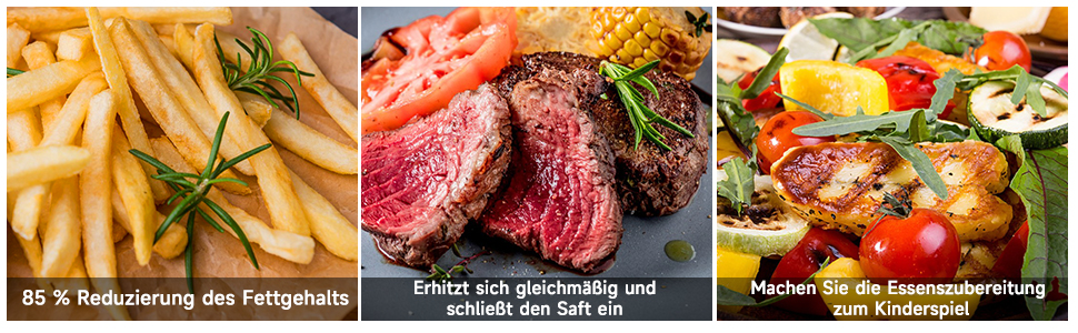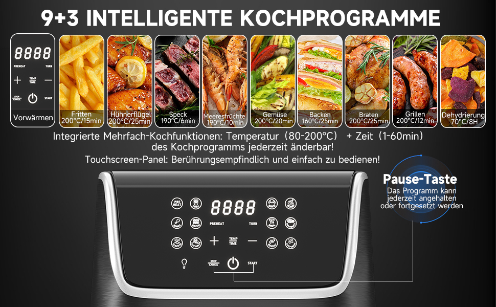 Mit nur einem Fingertipp können Sie 12 Voreinstellungen verwenden, um Ihre Lieblingsgerichte zuzubereiten. Die Vorheiz-, Warmhalte- und Aufwärmfunktionen sorgen für ein einzigartiges Erlebnis Kocherlebnis. Auch die Zeit (1-60 Min) und die Temperatur (80-200 °C) können angepasst werden, sodass Sie Ihrer Fantasie freien Lauf lassen und Freunde, Familie und sich selbst mit köstlichen und gesunden Leckereien verwöhnen können!