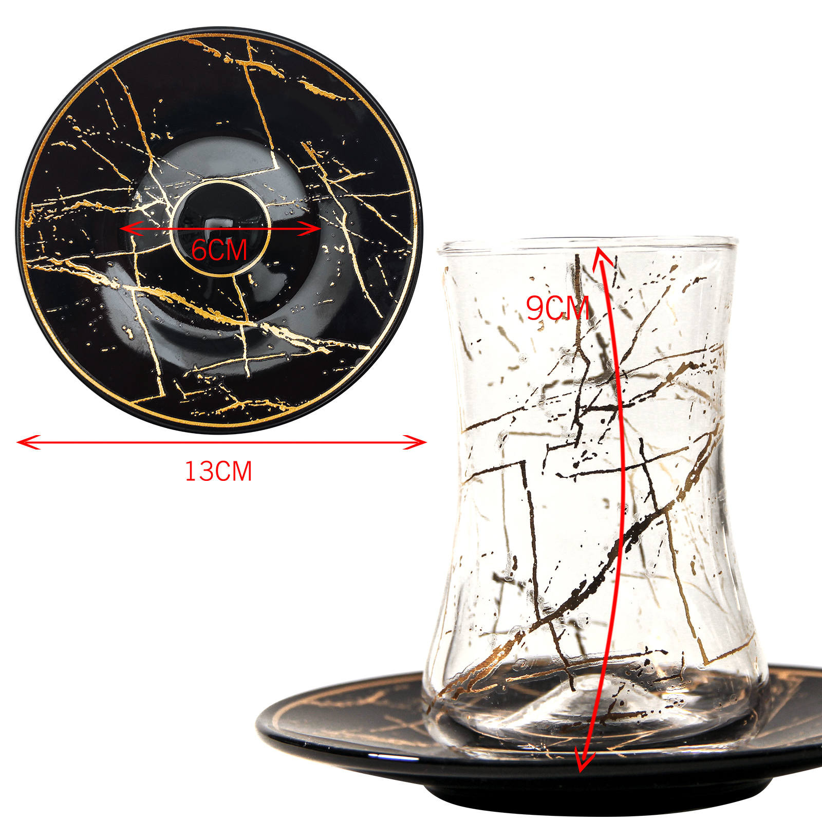 Die eleganten Golddetails verbinden sich mit den schönen tulpenförmigen Konturen, um Ihnen eine fantastische Tasse zu bieten, die ein kulinarisches Erlebnis bietet, das Ihre Gäste nicht so schnell vergessen werden. Die traditionell geformte arabische Teetasse ist genau richtig für einen bequemen Halt. Kristallklares, transparentes Glas lässt Sie den Inhalt Ihrer Tasse sehen, sodass Sie den Tee genau nach Ihrem Geschmack aufbrühen können.