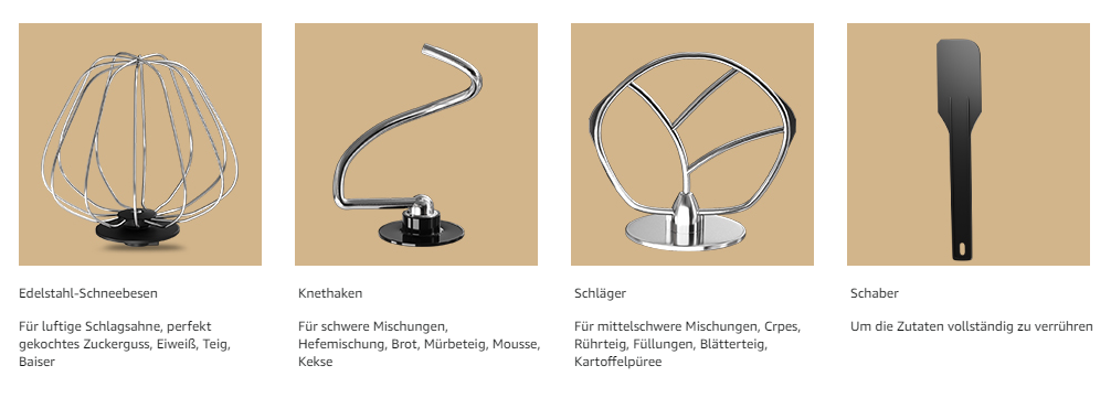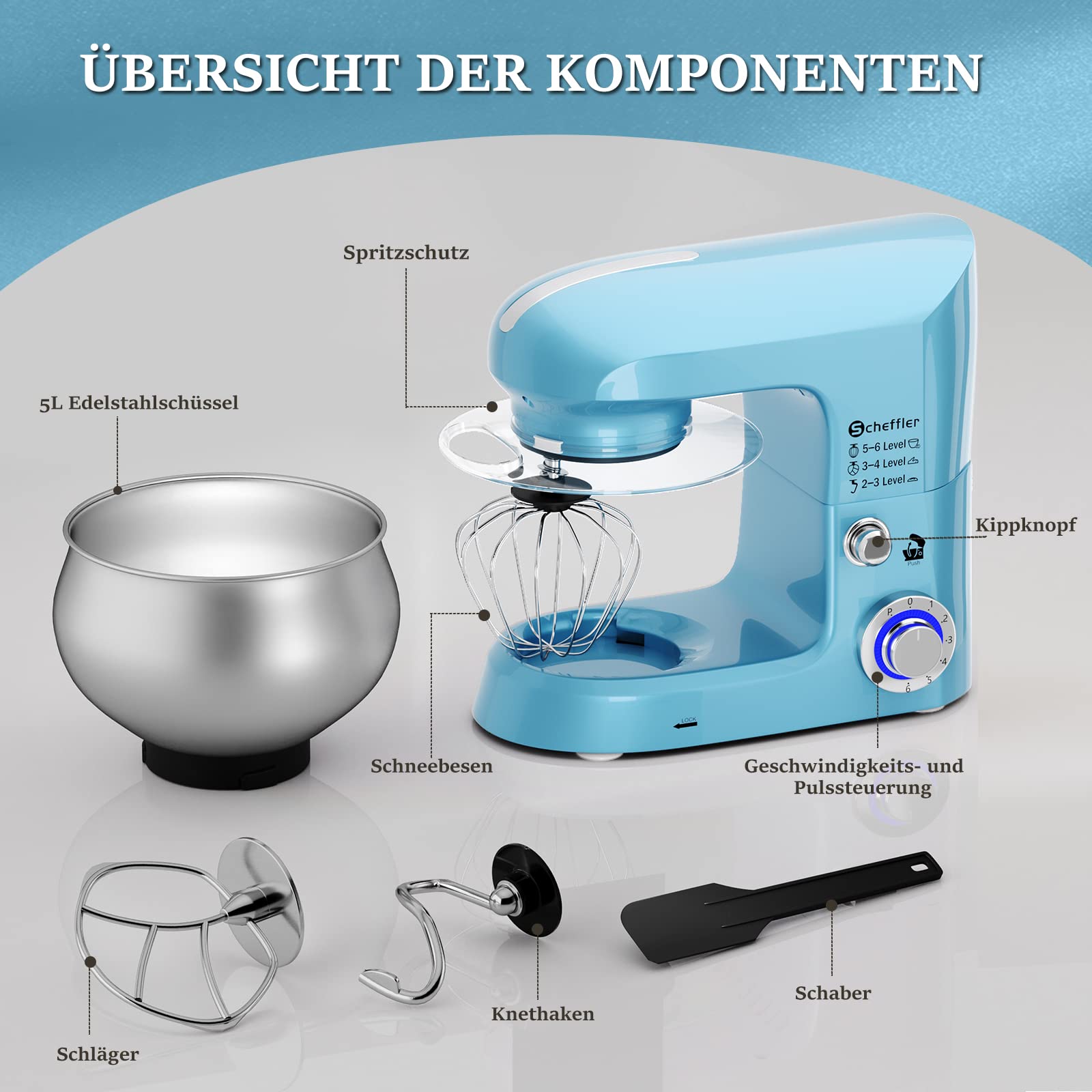 Die 5 Aufsätze des Familien-Standmixers, einschließlich Knethaken, Schneebesen, Flachrührer, Spritzschutz und Schaber. Verschiedenes Werkzeugzubehör erfüllt die unterschiedlichsten Küchenbedürfnisse, wie zum Beispiel Teig, Kekse, Gebäck, Muffins, Waffeln usw. Die Haken sind alle aus Edelstahl gefertigt, was sie robust und langlebig sowie spülmaschinenfest macht. Alle Zubehörteile sind leicht abnehmbar und sauber.