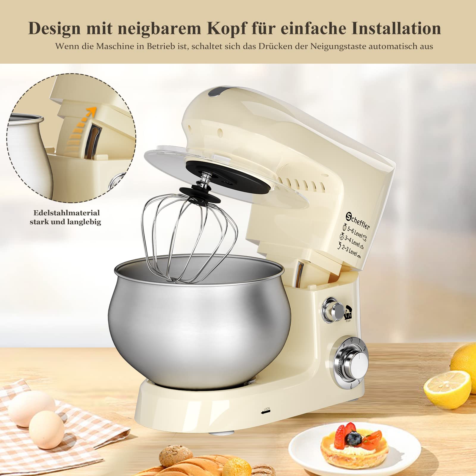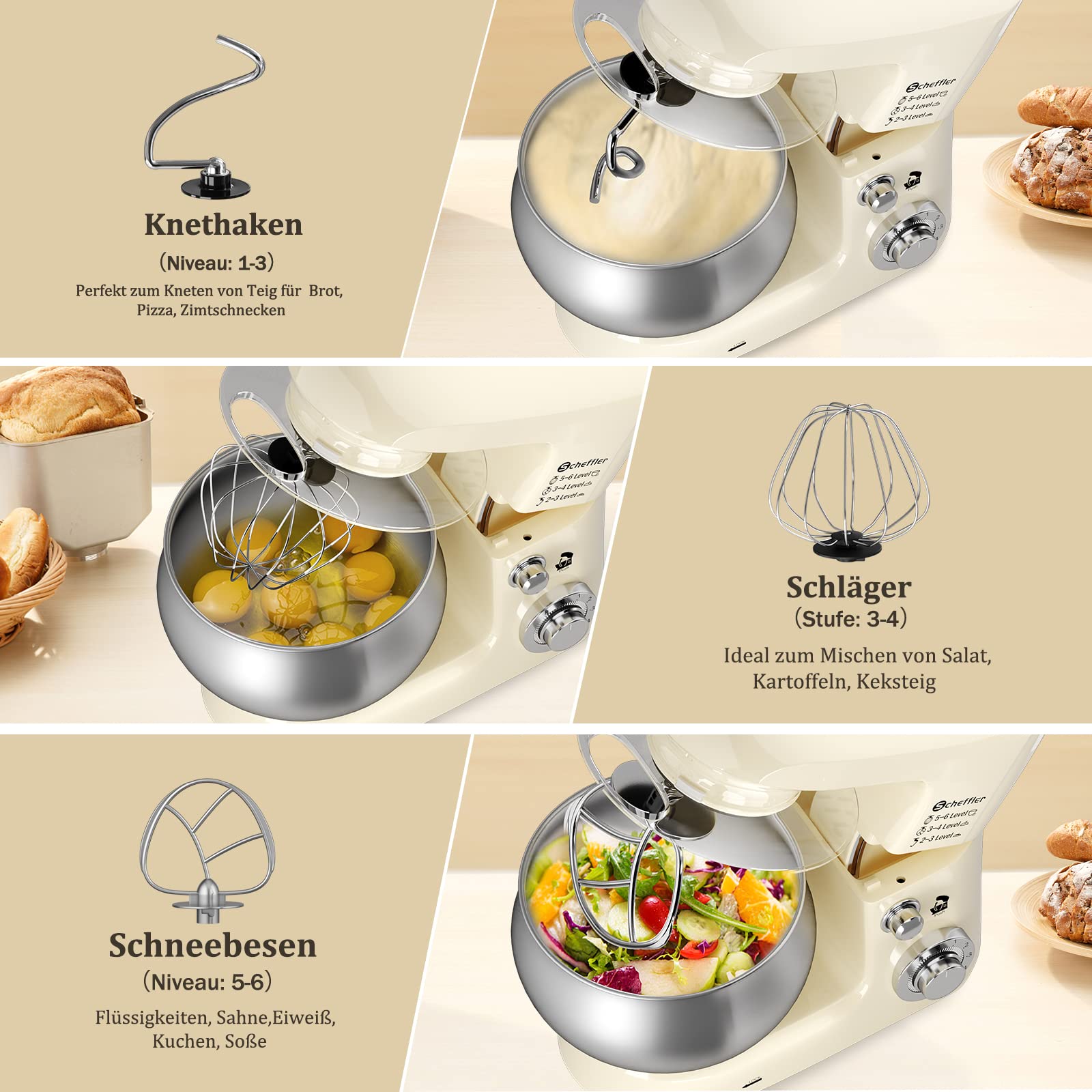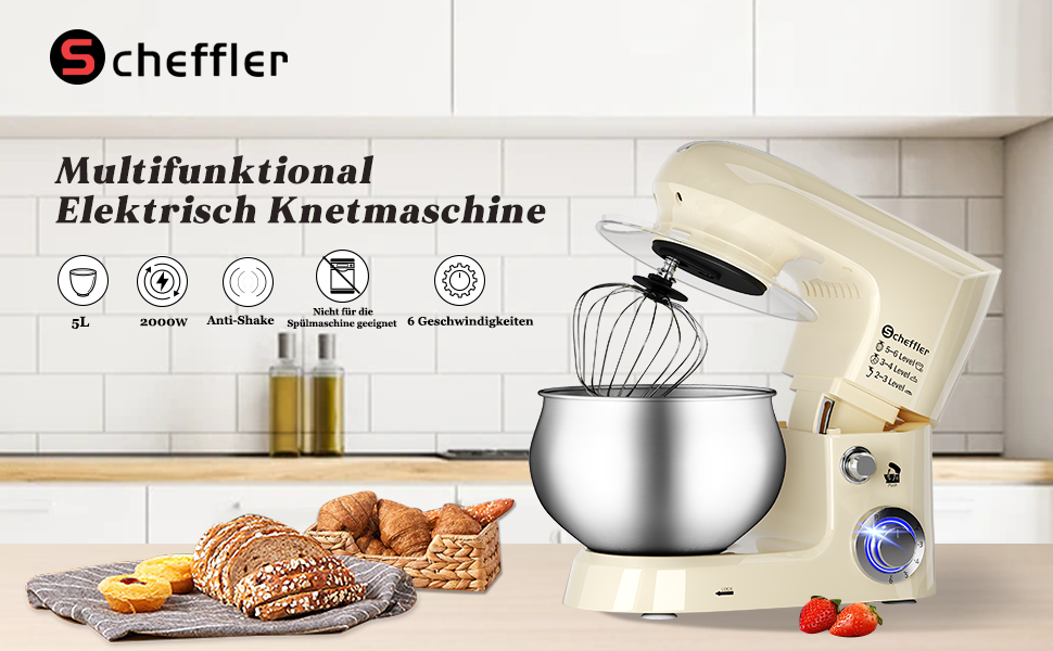 Scheffler 2000W Küchenmaschine, 5L Edelstahlschüssel Knetmaschine mit 6 Geschwindigkeitsstufen, Teigmaschine mit Rührbesen, Knethaken, Schläger und Spritzschutz SC 637-Cream
