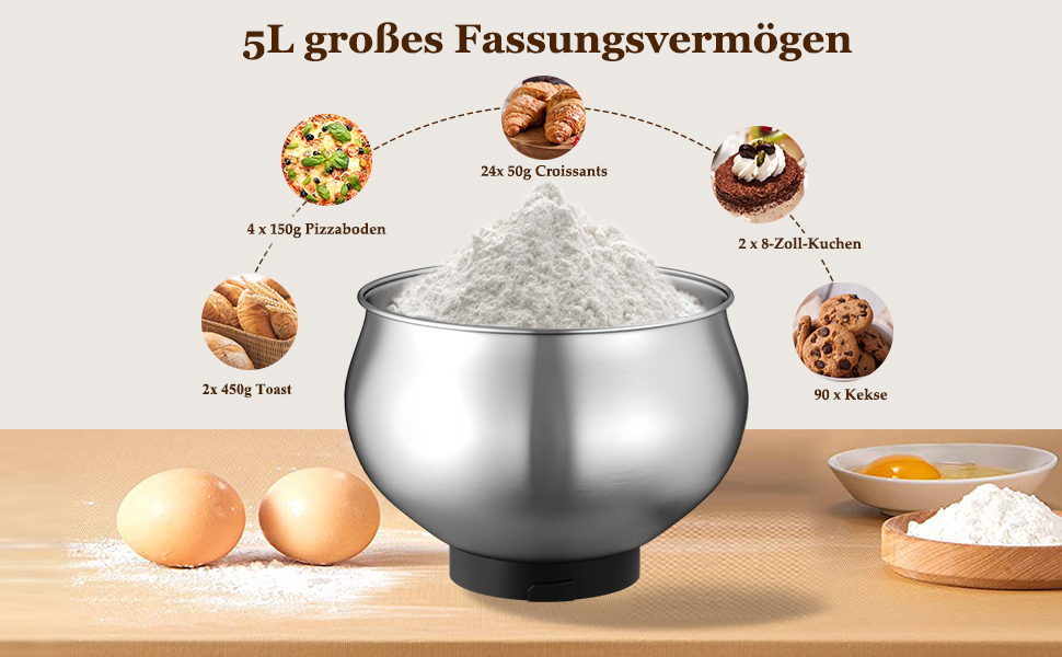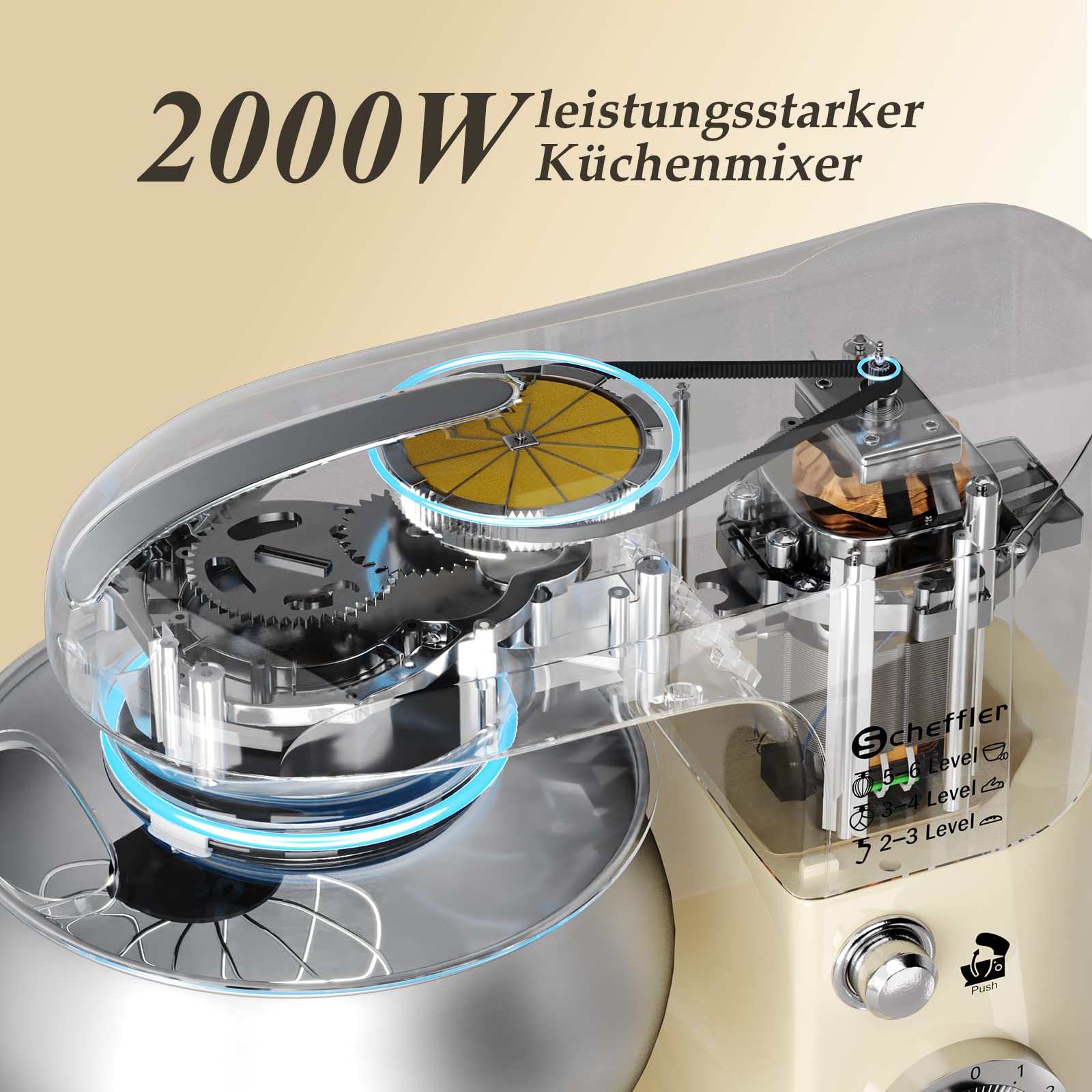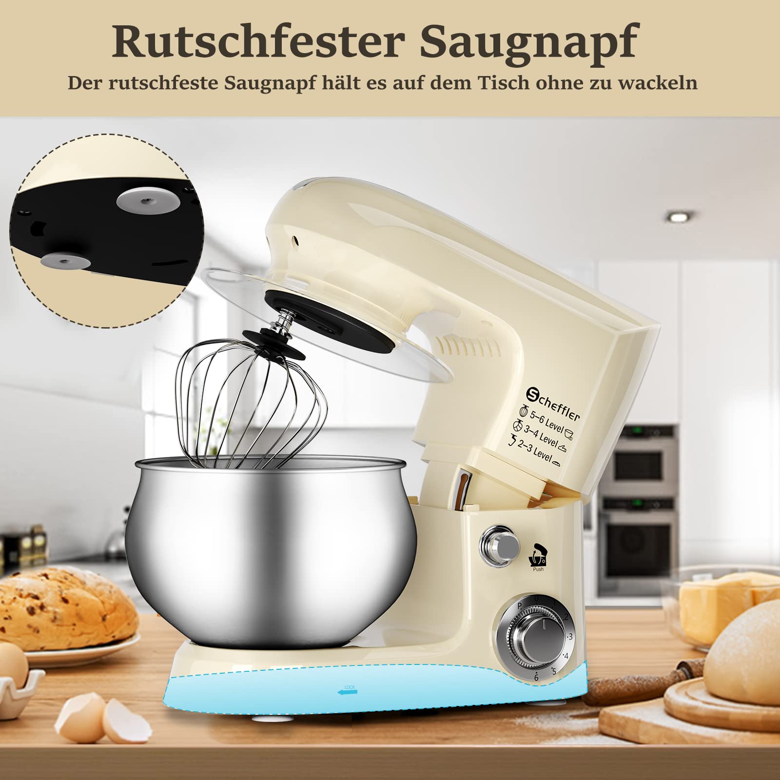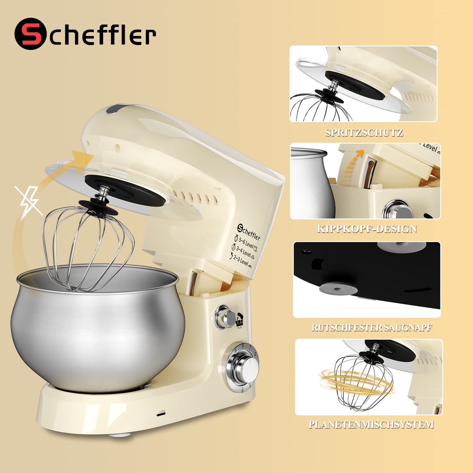 Scheffler 2000W Küchenmaschine, 5L Edelstahlschüssel Knetmaschine mit 6 Geschwindigkeitsstufen, Teigmaschine mit Rührbesen, Knethaken, Schläger und Spritzschutz SC 637-Cream