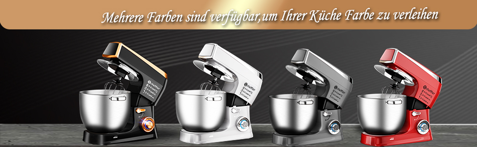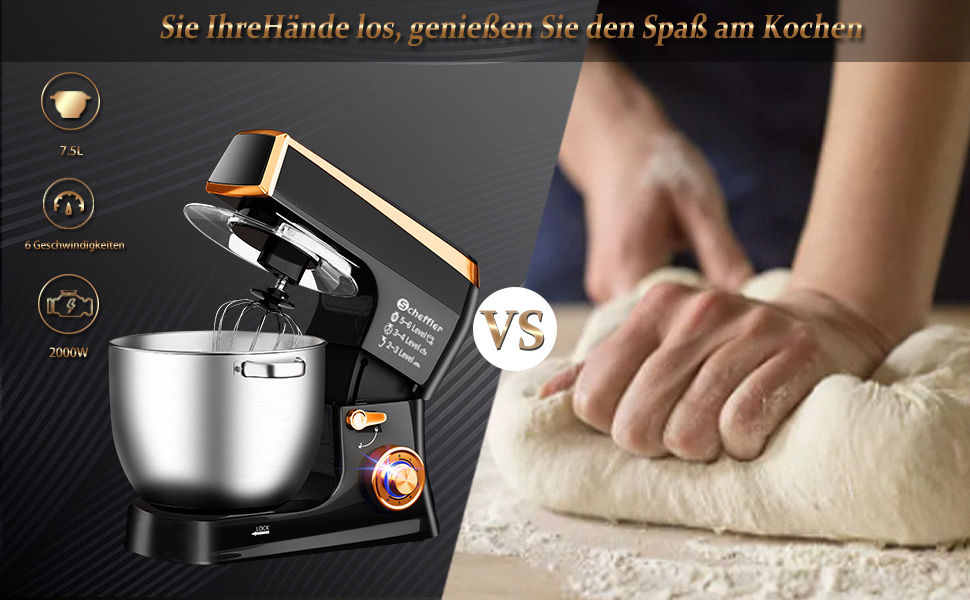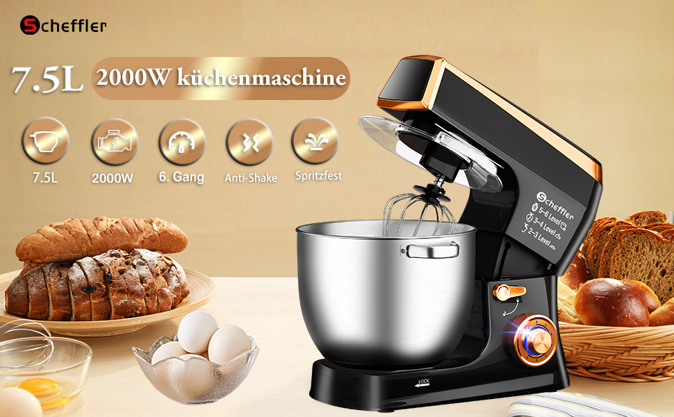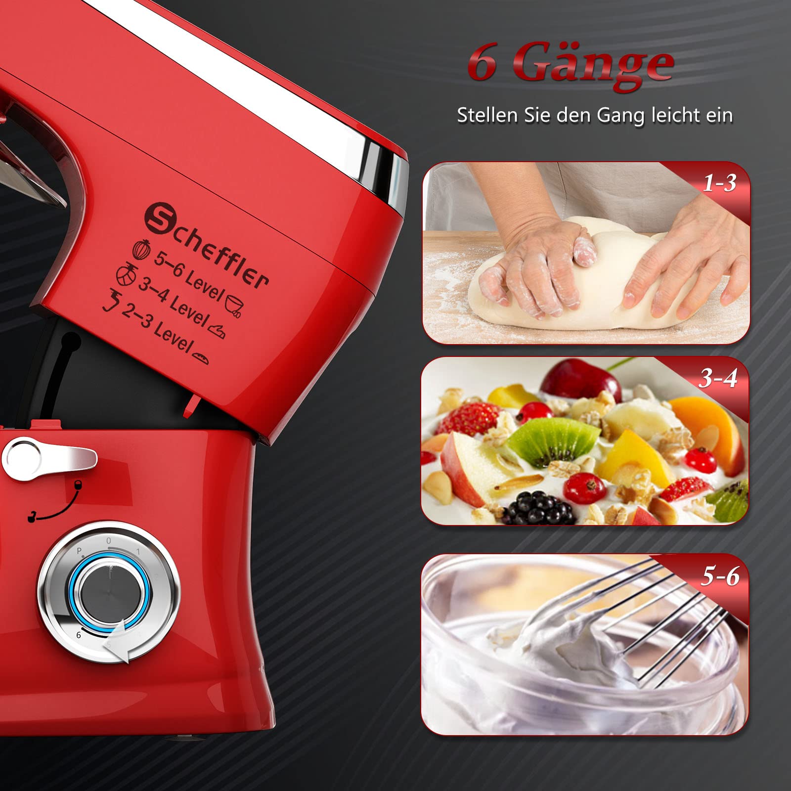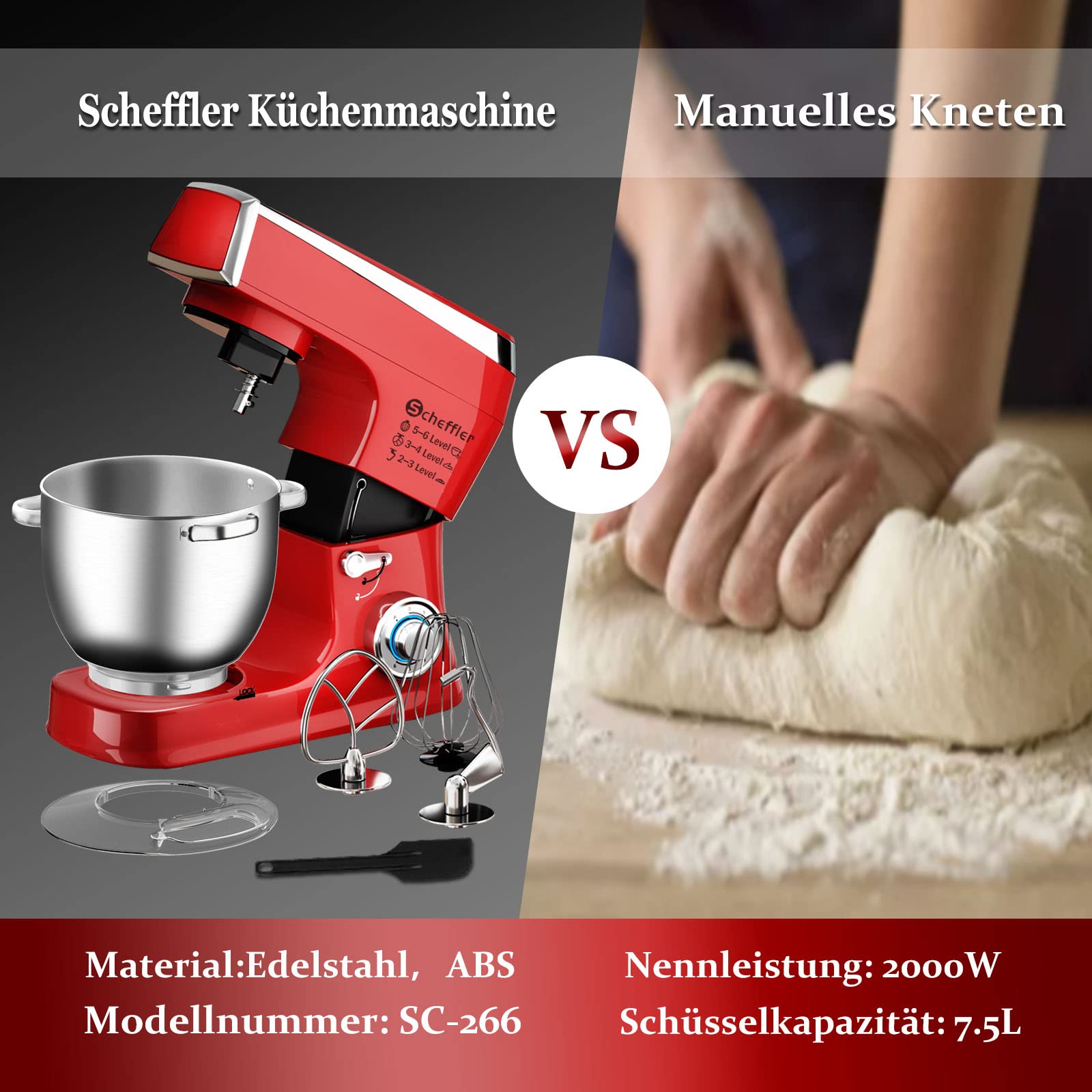 Küchenmaschine Scheffler 2000W Knetmaschine,7,5 L Küchenmaschine,Teigmaschine, 6 Geschwindigkeiten, 8 weiteren Zubehörteilen inklusive,Knethaken, Flachrührer, Schneebesen,SC-266 (Rot)