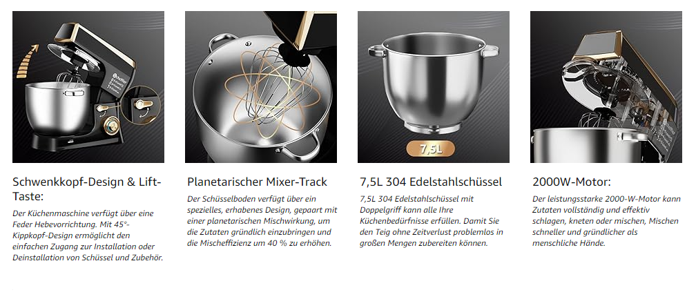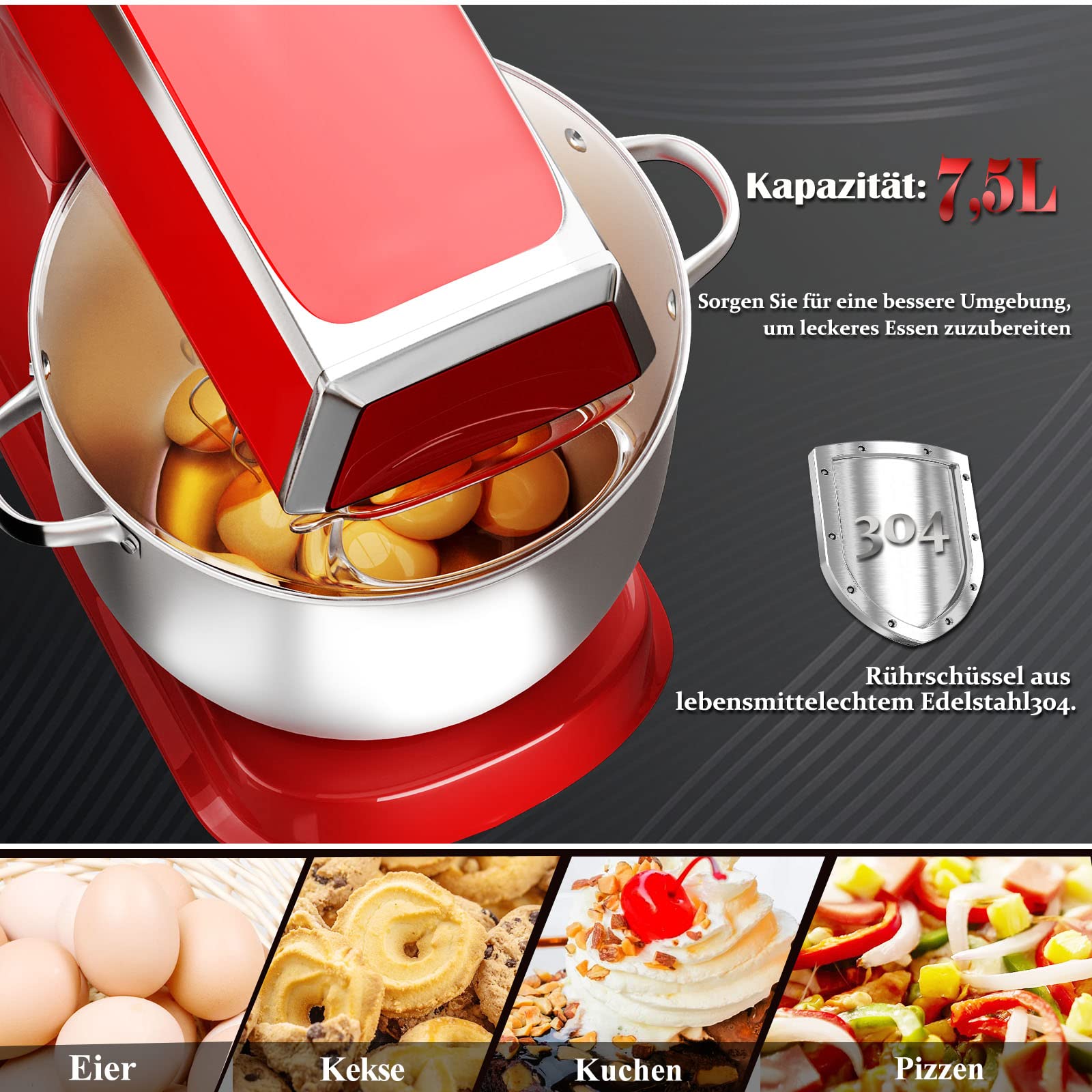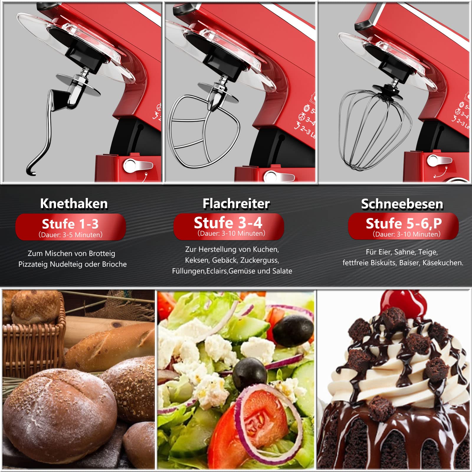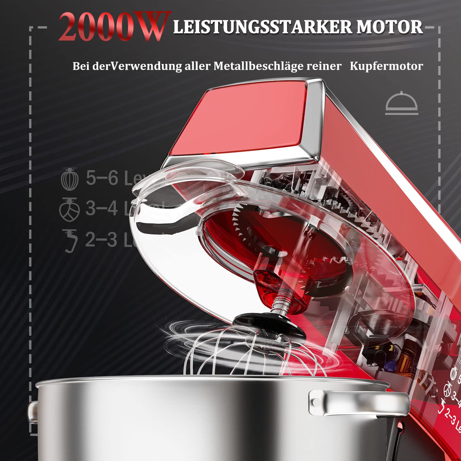 Küchenmaschine Scheffler 2000W Knetmaschine,7,5 L Küchenmaschine,Teigmaschine, 6 Geschwindigkeiten, 8 weiteren Zubehörteilen inklusive,Knethaken, Flachrührer, Schneebesen,SC-266 (Rot)