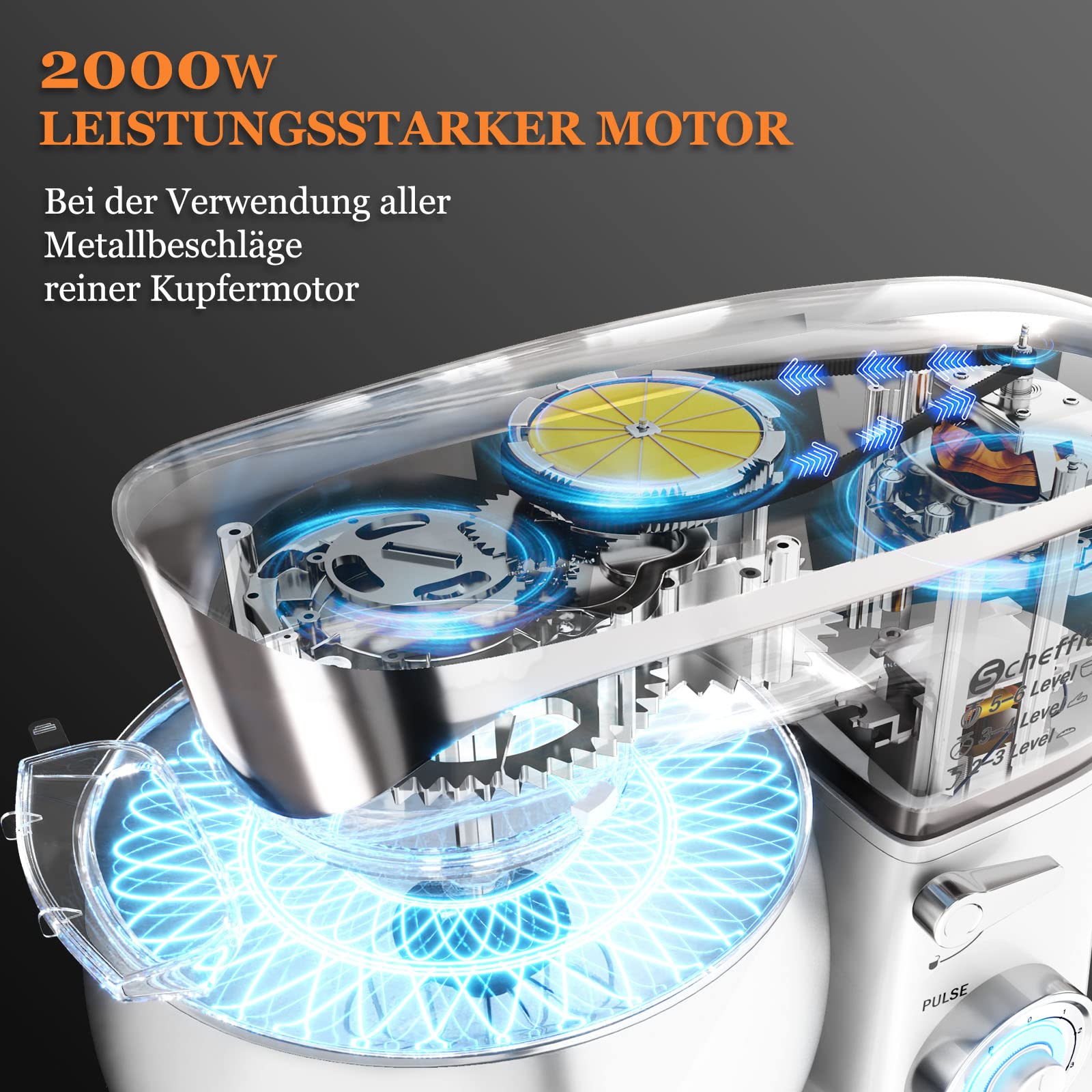 Präziser 6-Gang-Regler lässt Sie zwischen langsamem Rühren und schnellem Mixen wählen, Küchenmaschine XL mit blauem LED-Licht als Betriebsanzeige, der Mixer mit 2000W Hochleistungsmotor aus reinem Kupfermotor und robustem ABS-Gehäuse macht das Mischen schnell und gründlich.