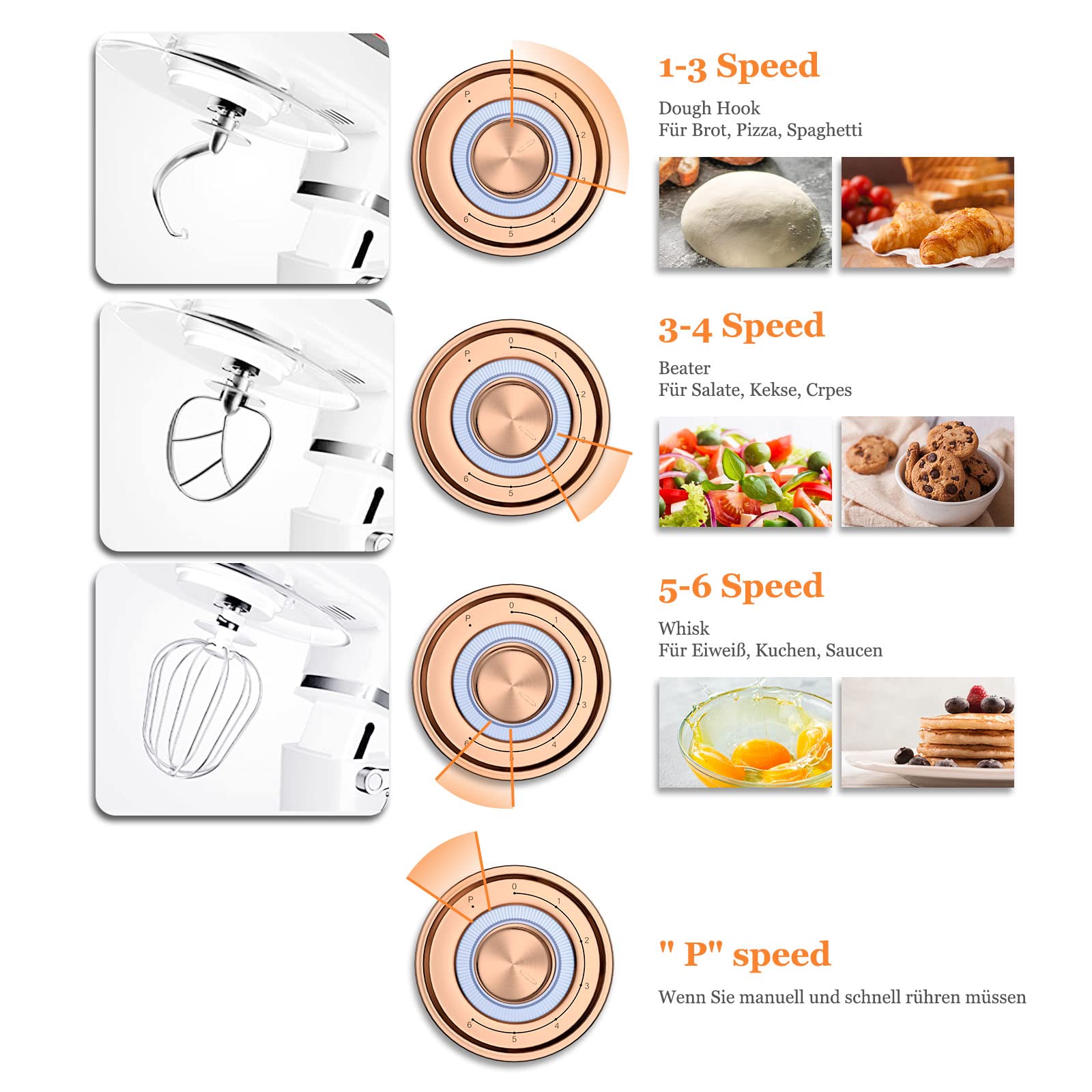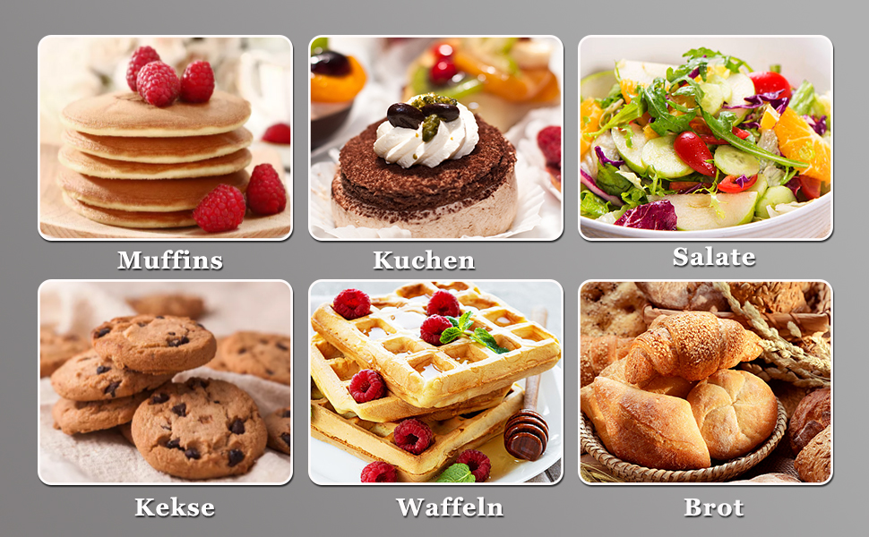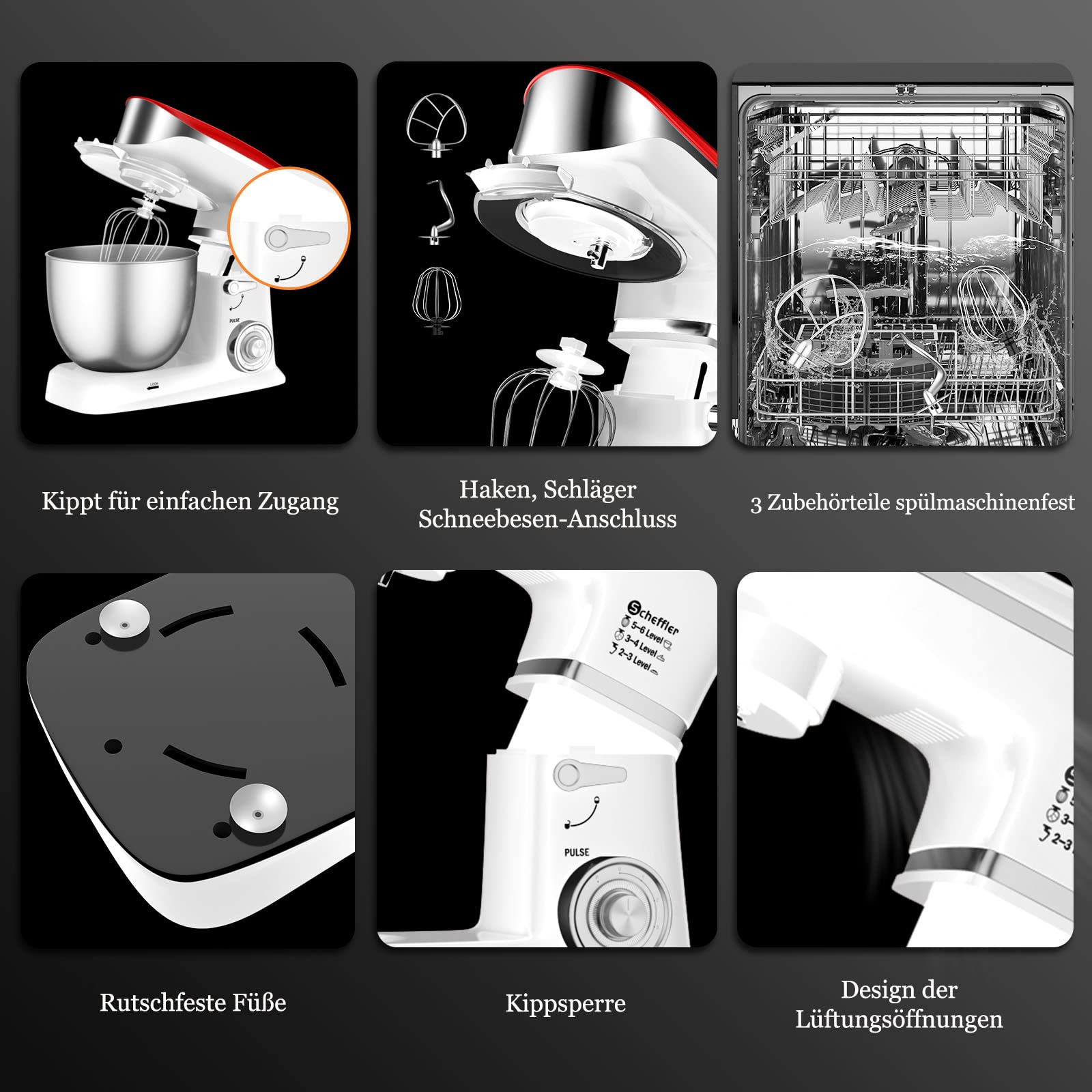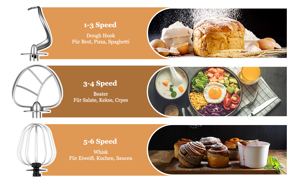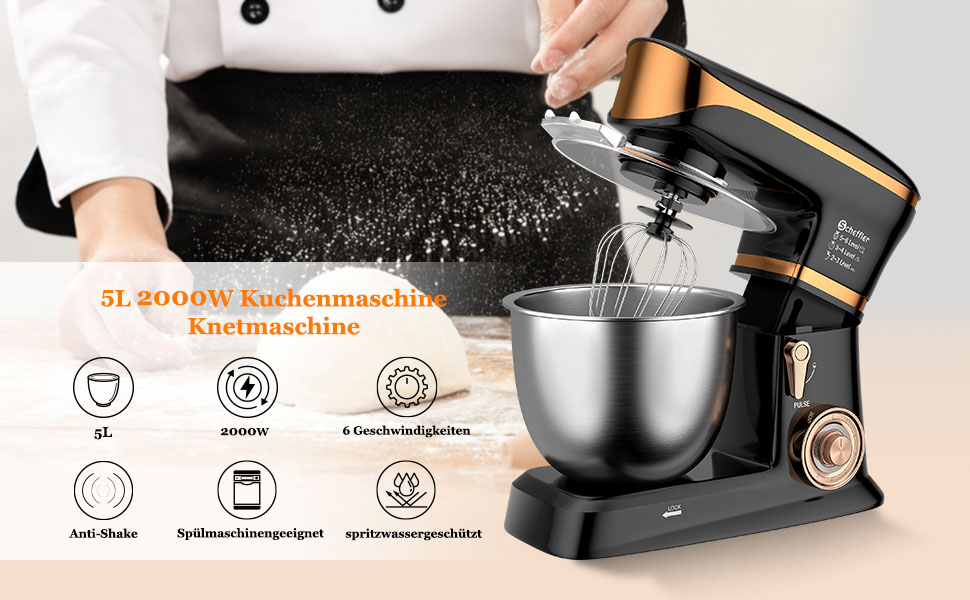 Die Teig Knetmaschine mit drei Zubehörteilen: 1-3 Geschwindigkeiten für Knethaken(Schwere Mischungen-Brot, Pizza, Spaghetti), 3-4 Geschwindigkeiten für Rührbesen (mittelschwer gemischt - Salat, Kekse, Crêpes),5 -6 Geschwindigkeiten für einen Schneebesen, (Leichte Mischungen-Sahne, Ei, Kuchen, Soßen). Mehrzweckaufsätze sind im Lieferumfang enthalten: 1x Scheffler Küchenmaschine (2000W), 1x 5 L Edelstahlschüssel, 1x Spritzschutz, 1x Teigschaber, 1x mehrsprachiges Handbuch