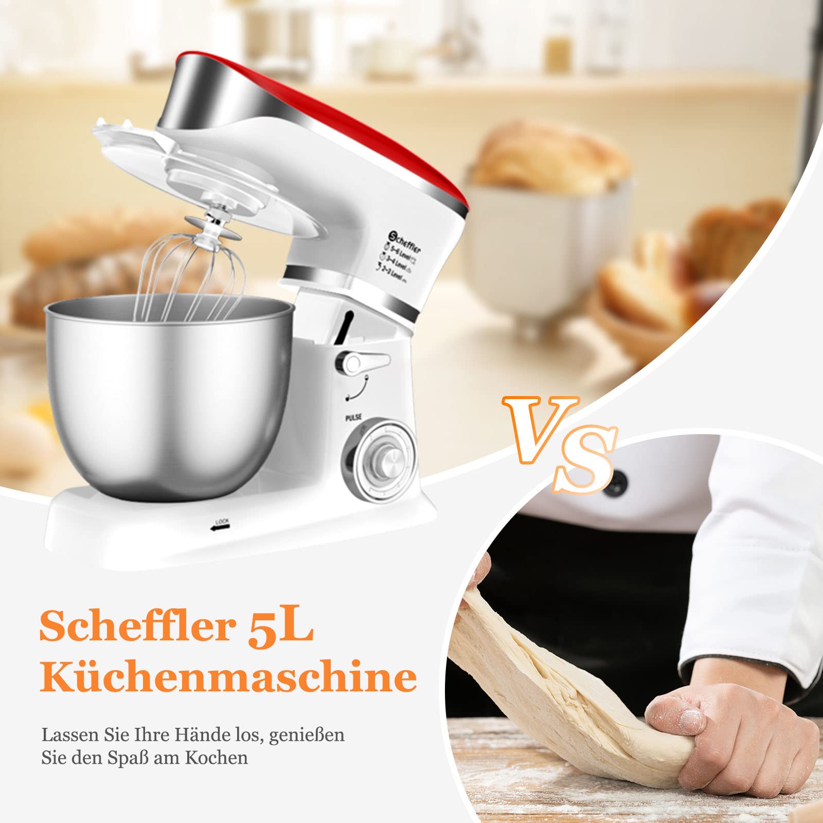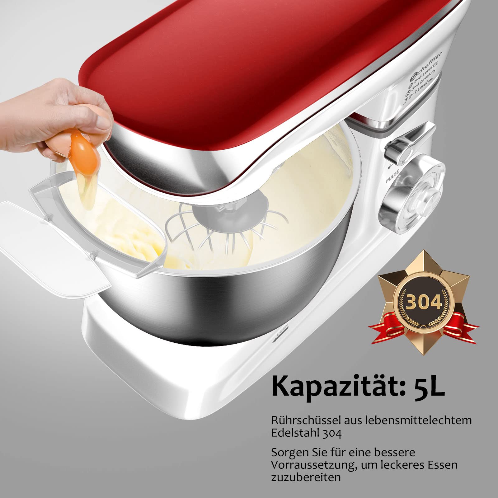 5L Rührmaschine ist aus lebensmittelechtem 304 Edelstahl, der für Materialsicherheit sorgt. Die Scheffler Küchenmaschine multifunktional bietet genügend Kapazität für Familien. Erfüllen Sie alle Ihre Küchenbedürfnisse und sparen Sie Platz auf der Arbeitsplatte.