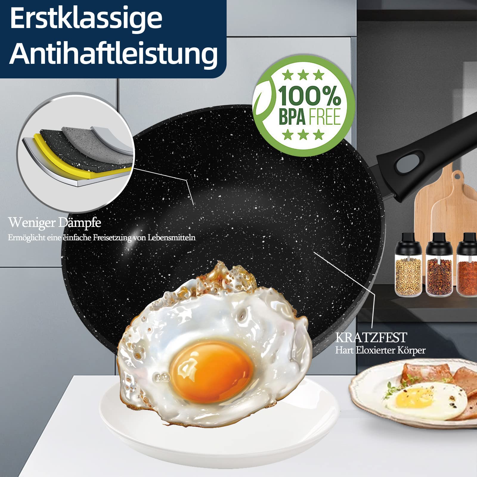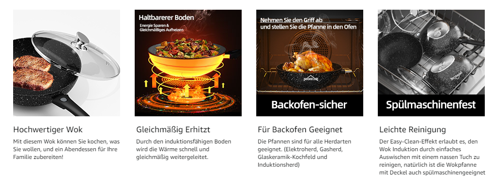 Dank Sandwichboden mit starkem Aluminiumkern hat die Wokpfannen eine gleichmäßige Wärmeverteilung und eignet sich außerdem für alle Herdarten, inklusive Induktions-, Glaskeramik-, Elektro- und Gasherde eignet.