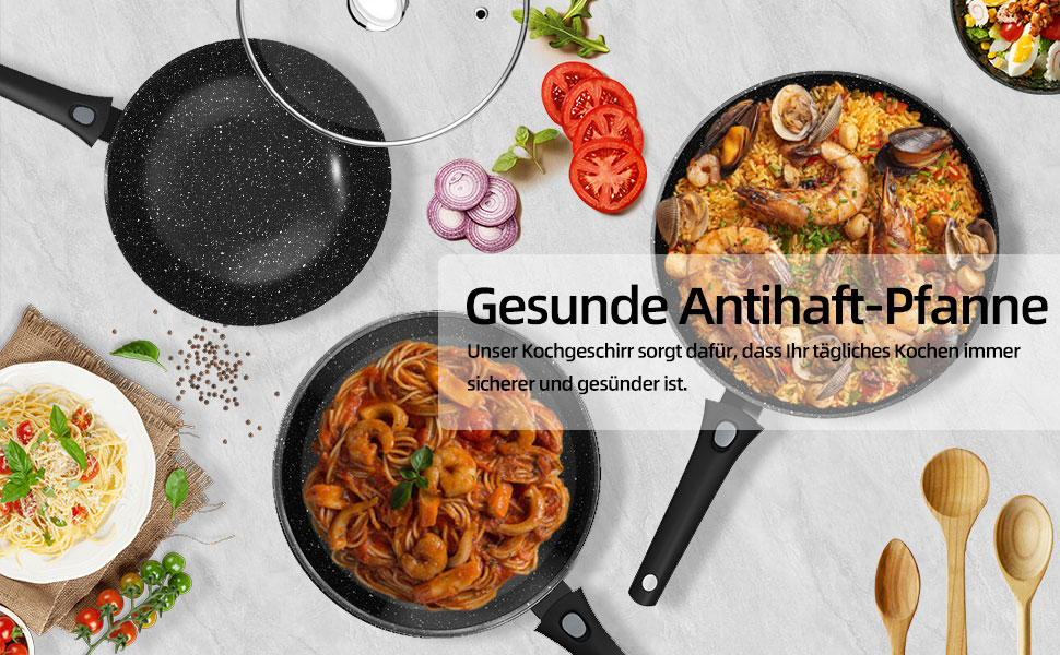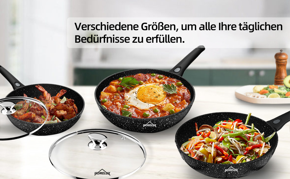 Unsere Pfannen sind einfach in der Nutzung, leicht zu reinigen, eignet sich für die Reinigung von Hand oder sogar in der Spülmaschine. und je nach Haushaltsgröße in verschiedenen Größen erhältlich!