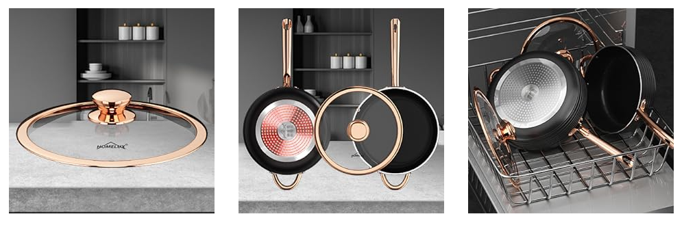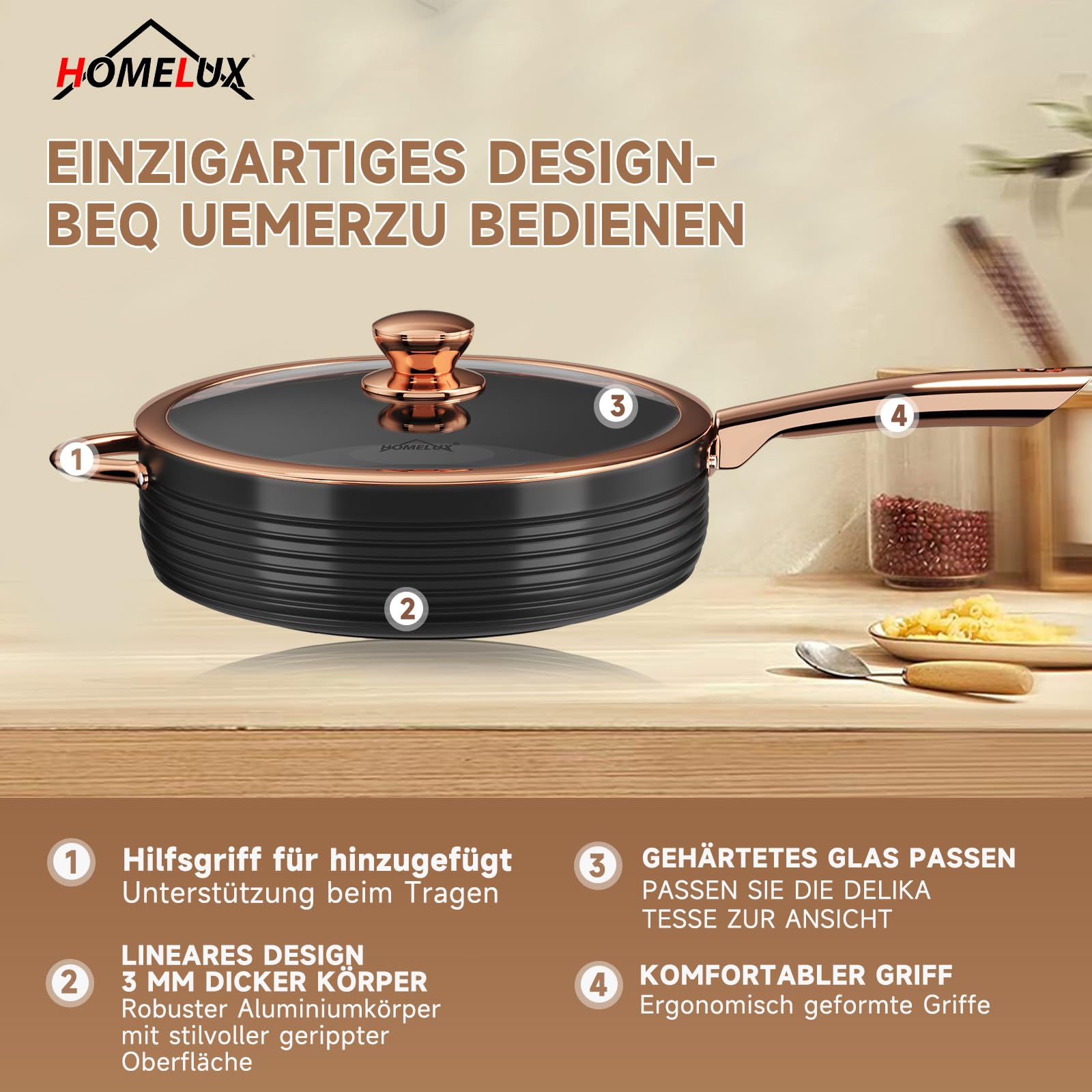 Das Kochgeschirrset verfügt über eine stilvolle gerippte Oberfläche und einen robusten Aluminiumkörper mit einer 3 mm dicken Konstruktion. Der sich schnell aufheizt und die Wärme gleichmäßig verteilt, um hervorragende Kochergebnisse zu erzielen. Es ist kompatibel mit Gas-, Elektro-, Keramik-, Glas-, Herd-, Induktionskochfeldern und mehr.