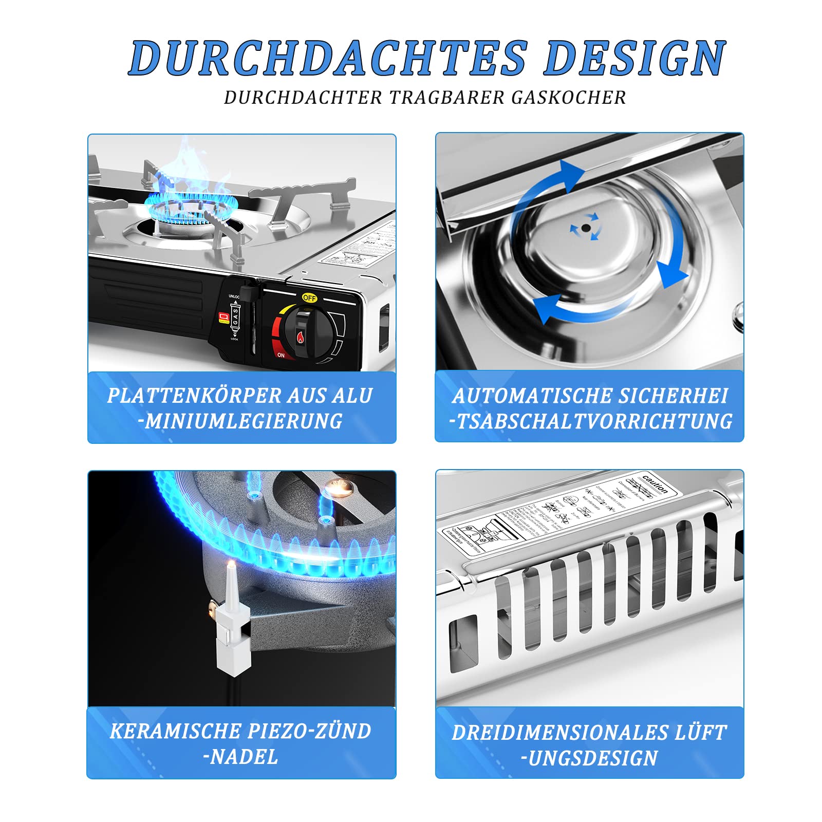 HOMELUX Gaskocher Edelstahl Campingkocher 2 flammig für Grill Camper im Outdoor Camping - Silber (1 Edelstahl 2 flammig gaskocher+28Gaskartuschen)