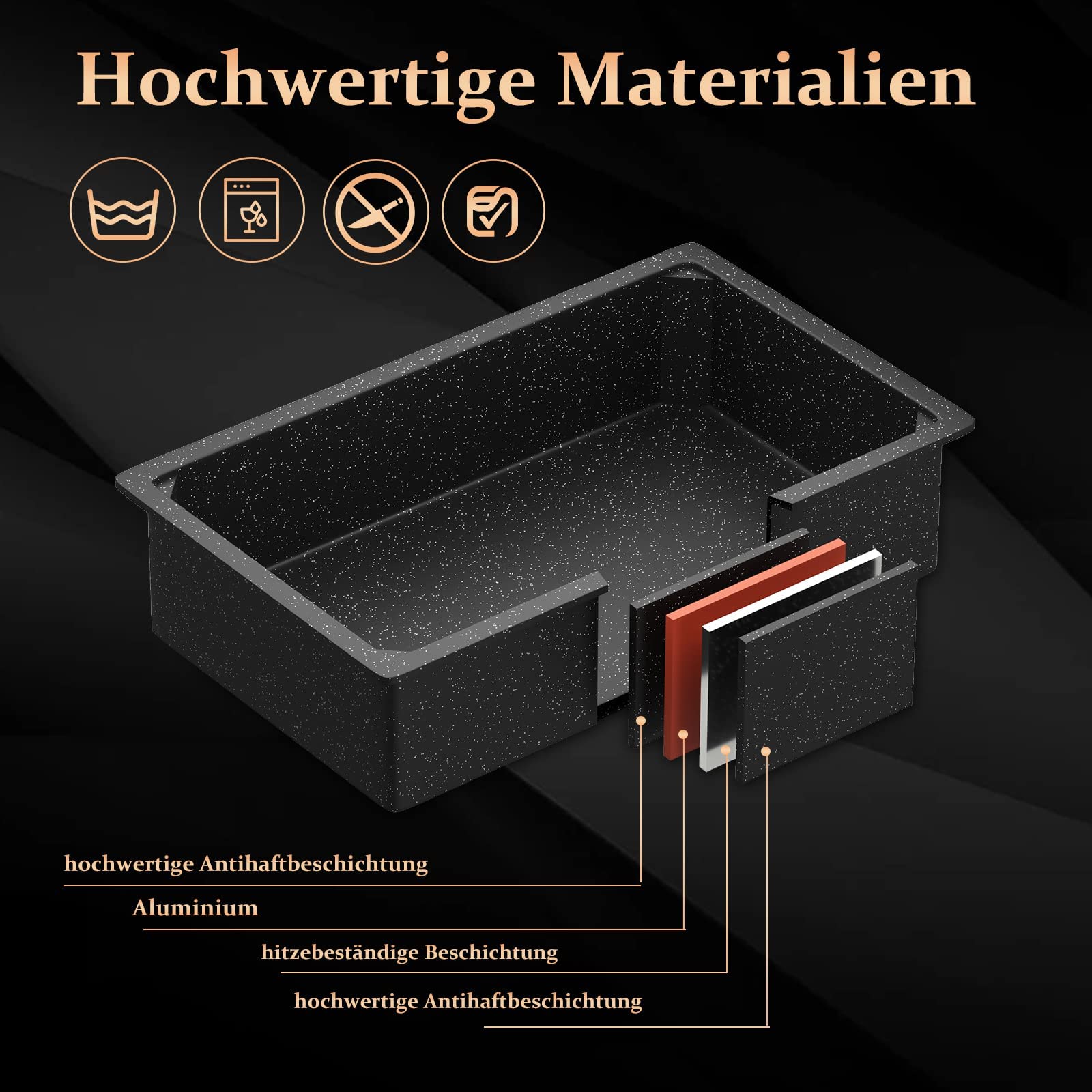 Der auflaufform aus strapazierfähigem Aluminium, garantiert eine schnelle, gleichmäßige Wärmeverteilung für eine gleichmäßige Bräunung der Backwaren, die für eine lange Haltbarkeit und Kratzfestigkeit sorgt. Backformen lassen keine Gerüche oder metallischen Geschmäcker in Ihre Speisen eindringen, ideal für die Zubereitung köstlicher Mahlzeiten und Desserts in der Küche.
