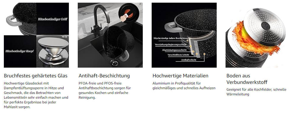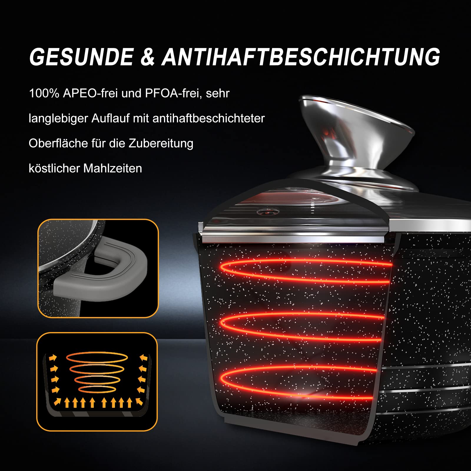 Der robuste und bequeme Griff bleibt beim Kochen kühl. Und der Doppelgriff des Topfes fördert einen stabilen, sicheren und bequemen Griff beim Heben oder Tragen. Der hochtemperaturbeständige Glasdeckel ermöglicht es, den Garzustand der Speisen jederzeit zu überprüfen, was das Kochen sehr angenehm macht. Die Dampföffnung am Deckel fördert die Zirkulation von Wärme und Feuchtigkeit.