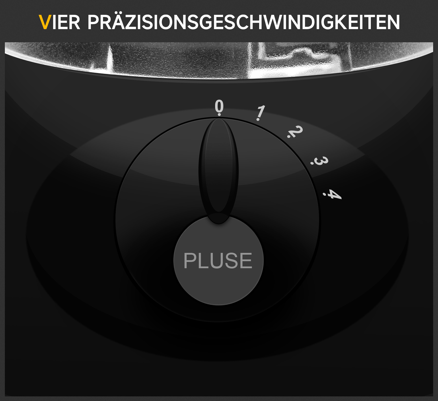 SetzenSiedenMixbehälter aufdas Motorgehäuse und drehen Sie ihn dann an seinem Griff, biser einrastet. Zutaten in kleine Stücke schneiden die klein genug sind, um in das Loch der Mittelkappe zu passen, und stellen Sie sicher dass die mittlere Kappe sicher sitzt. Drücken Sie die gewünschte Taste,0-Ausschalter,1-4 - Einstellung für Geschwindigkeit,Pluse - Einstellung für lmpuls.
