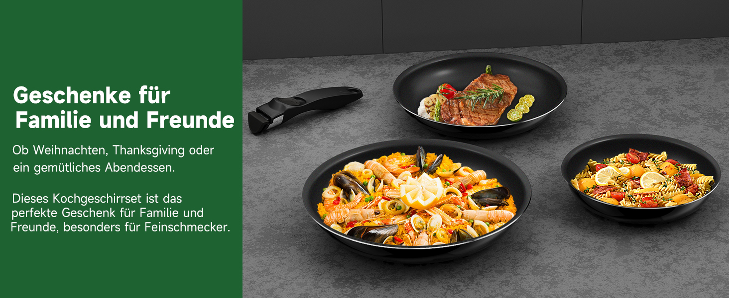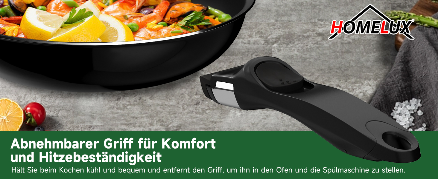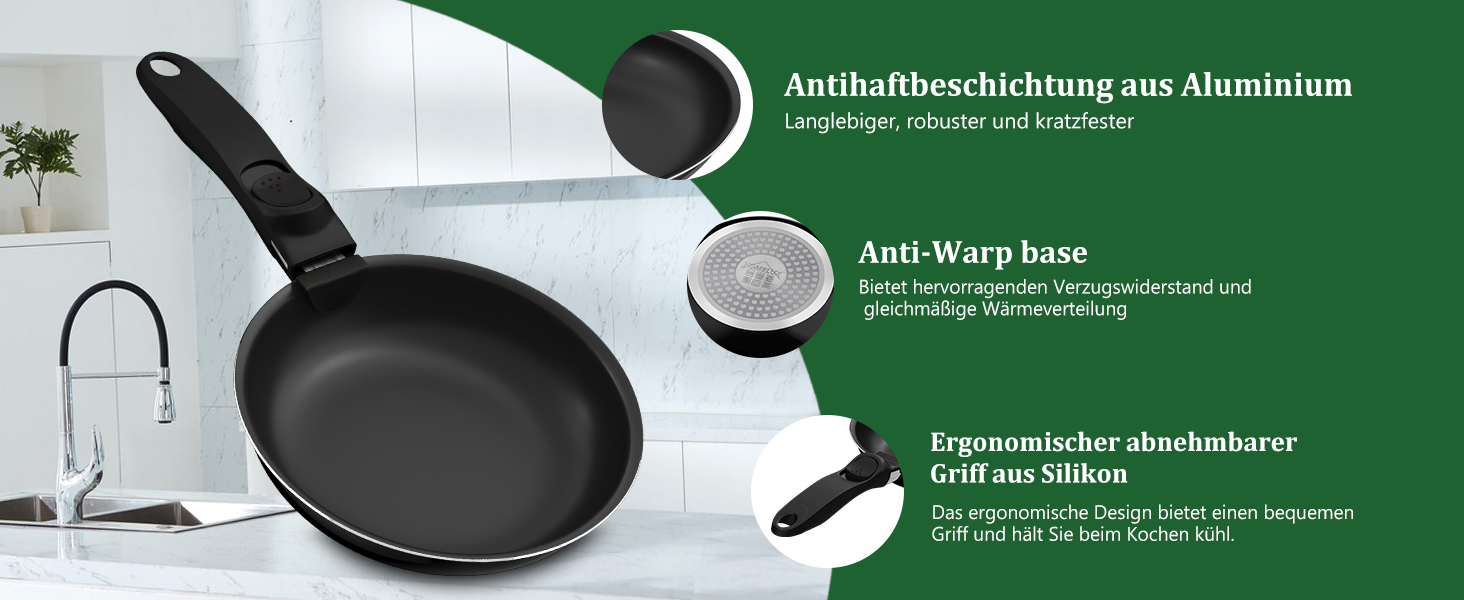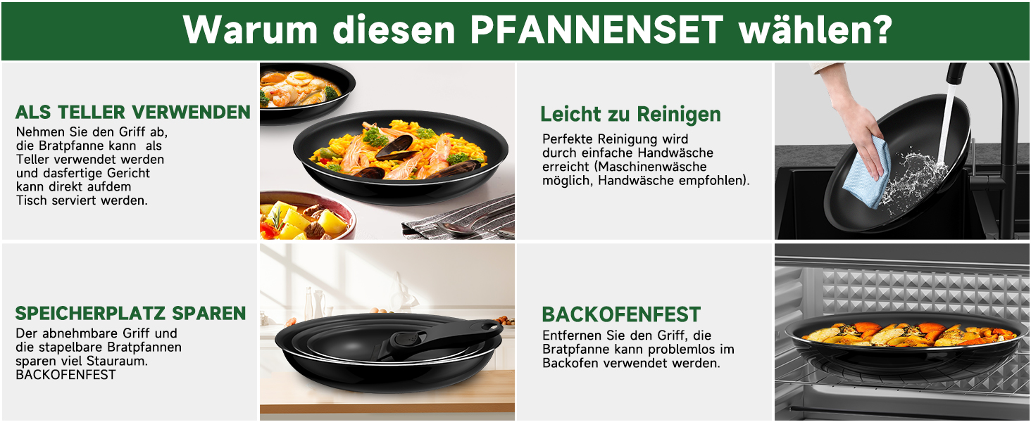 Das Pfannenset (20/24/28 cm) /(16/18/20 cm) mit abnehmbarem Universalgriff ist stapelbar und passt bequem in Schränke, Schubladen und Regale – optimale Platznutzung in Ihrer Küche.