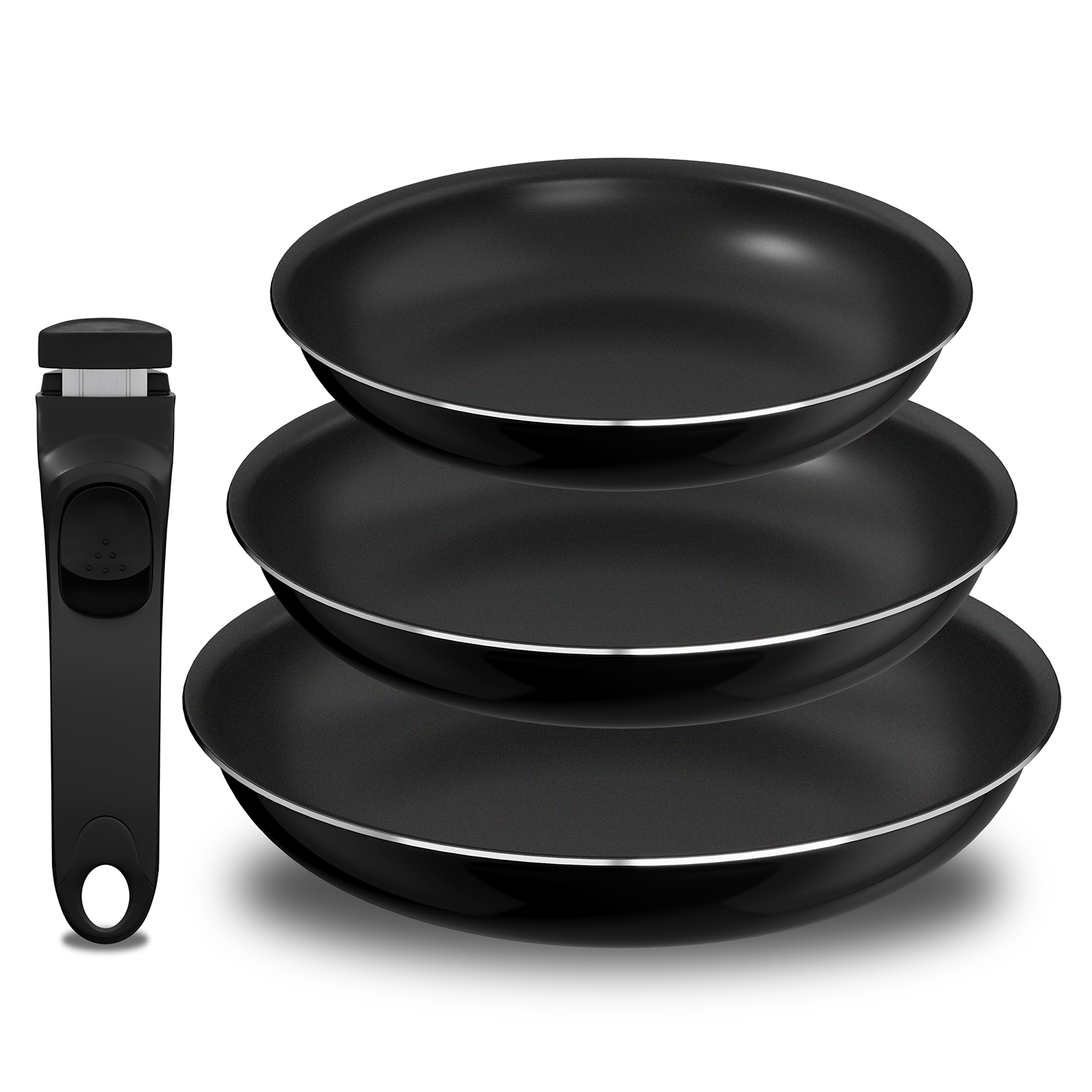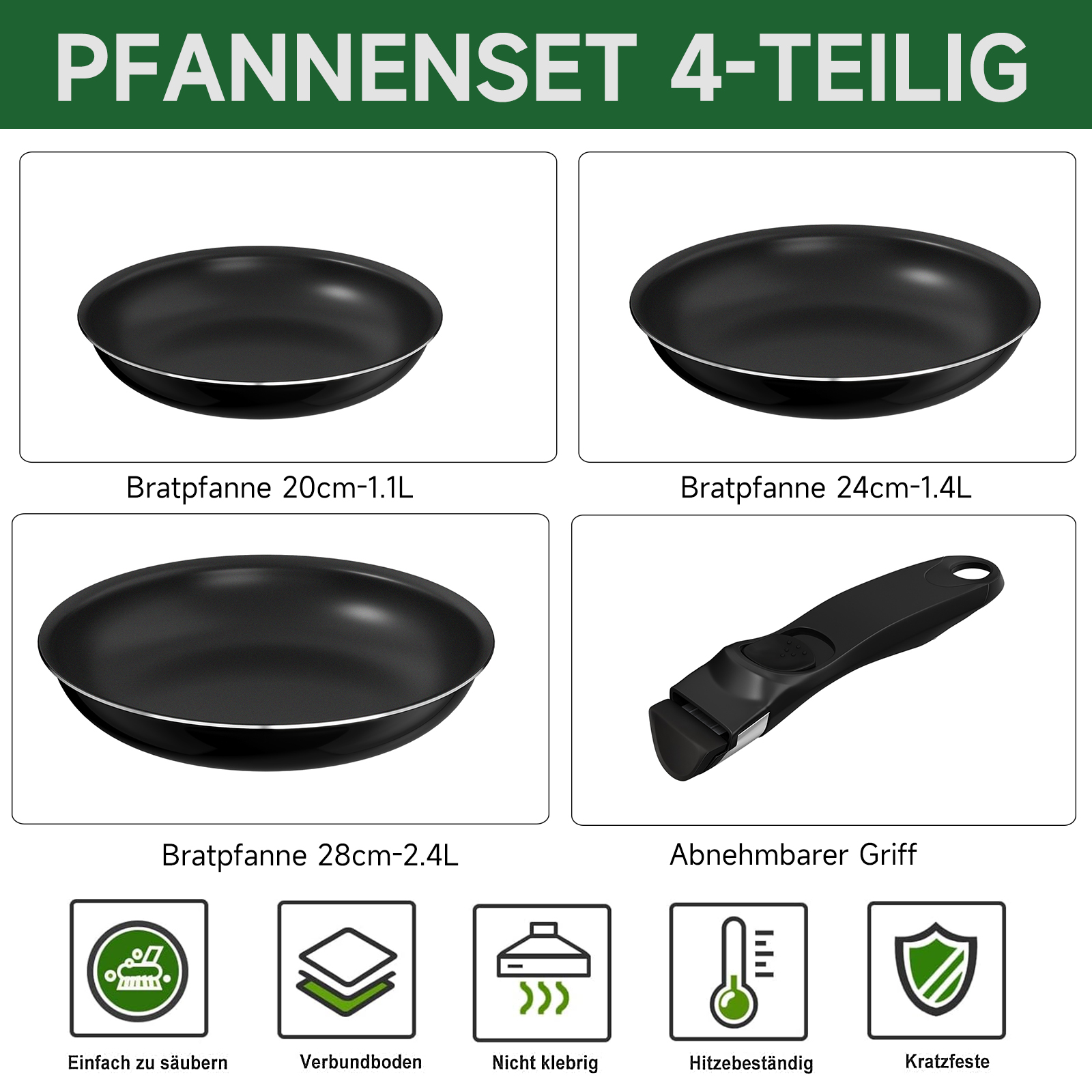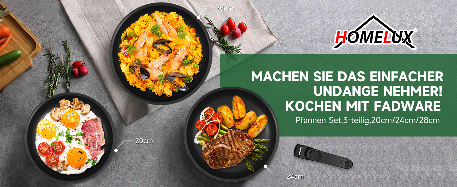 Das Pfannenset (20/24/28 cm) /(16/18/20 cm) mit abnehmbarem Universalgriff ist stapelbar und passt bequem in Schränke, Schubladen und Regale – optimale Platznutzung in Ihrer Küche.
