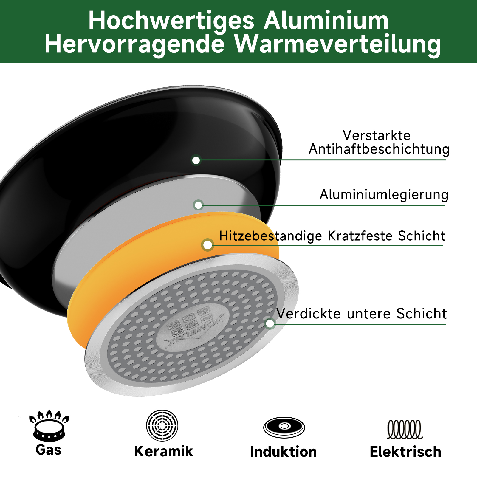 Der Vollinduktionsboden ermöglicht die Nutzung auf Gas-, Elektro-, Ceran- und Induktionsherden, erfüllt flexibel Ihre Bedürfnisse in der Küche.