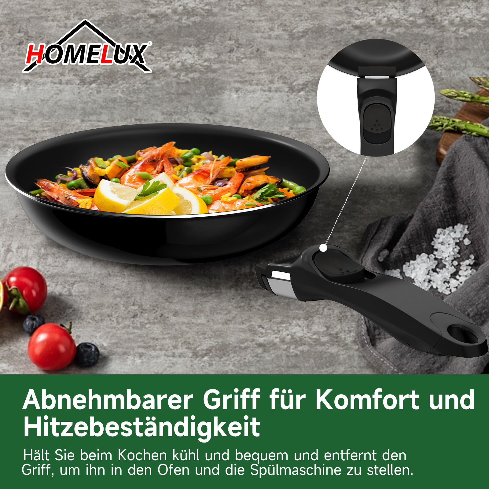 Die Griffe lassen sich mühelos entfernen und wieder befestigen, ideal für den nahtlosen Übergang vom Herd in den Ofen, auf den Tisch und in den Kühlschrank.