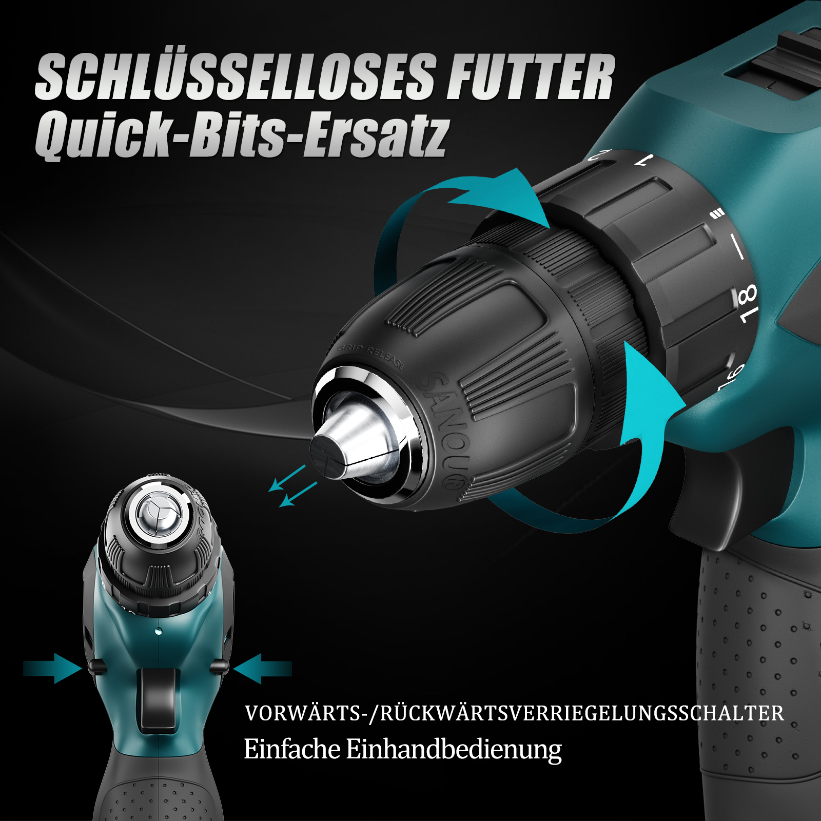 Unser Bohrschrauber wird mit einem 10-mm-Schnellspannbohrfutter geliefert, bietet eine automatische Spindelarretierung, kann mit einer Hand ausgetauscht werden und verfügt über erweiterte Zubehörkompatibilität. Vorwärts-/Rückwärtsschalter zum Ausrichten des Werkzeugs und dient auch als Sperrtaste. Der eingebaute starke Magnet kann den Bohrer leicht fixieren. Verabschieden Sie sich von ermüdender Zimmermannsarbeit.