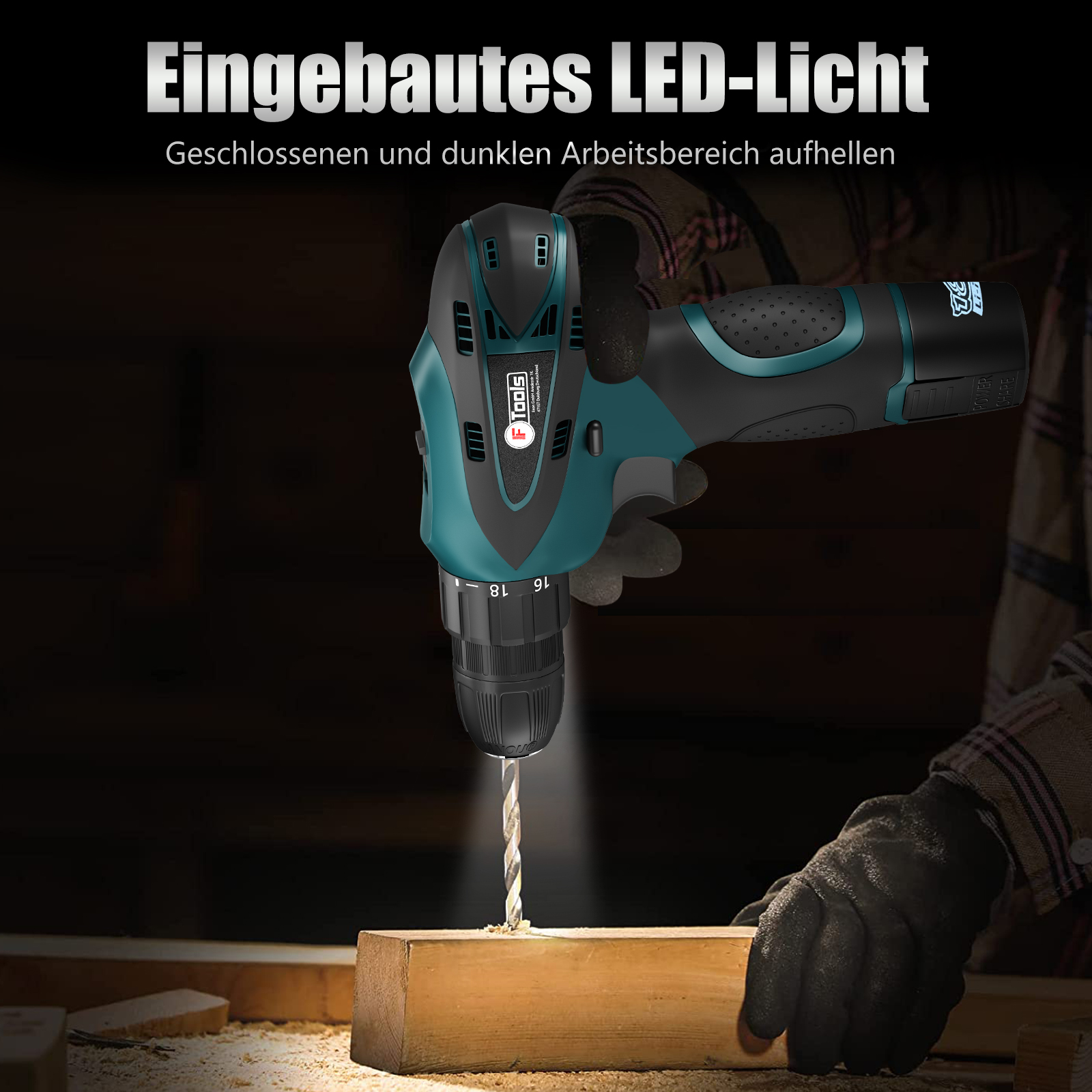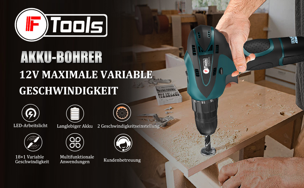 Der 12-V-Akku-Bohrschrauber von IF Tools ist mit 2 1800-mAh-Akkus und einem 1-Stunden-Schnellladegerät für starke und stabile Leistung und lange Laufzeit ausgestattet. Industrielle Kupfermotoren bieten große Leistung. Diese Bohrmaschine verfügt über ein LED-Arbeitslicht. Es schaltet sich automatisch ein, wenn der Auslöser für die Geschwindigkeitsregelung gedrückt wird.