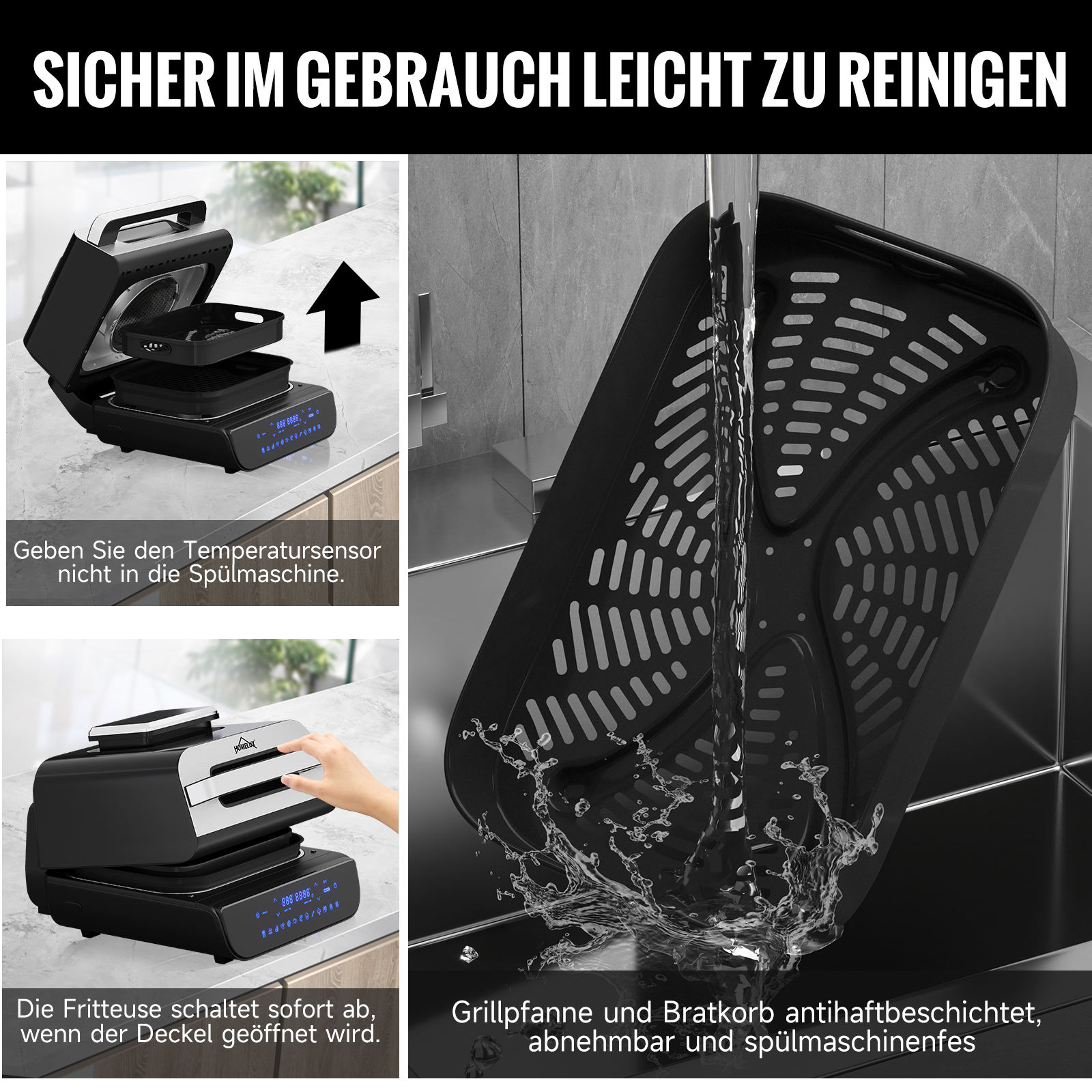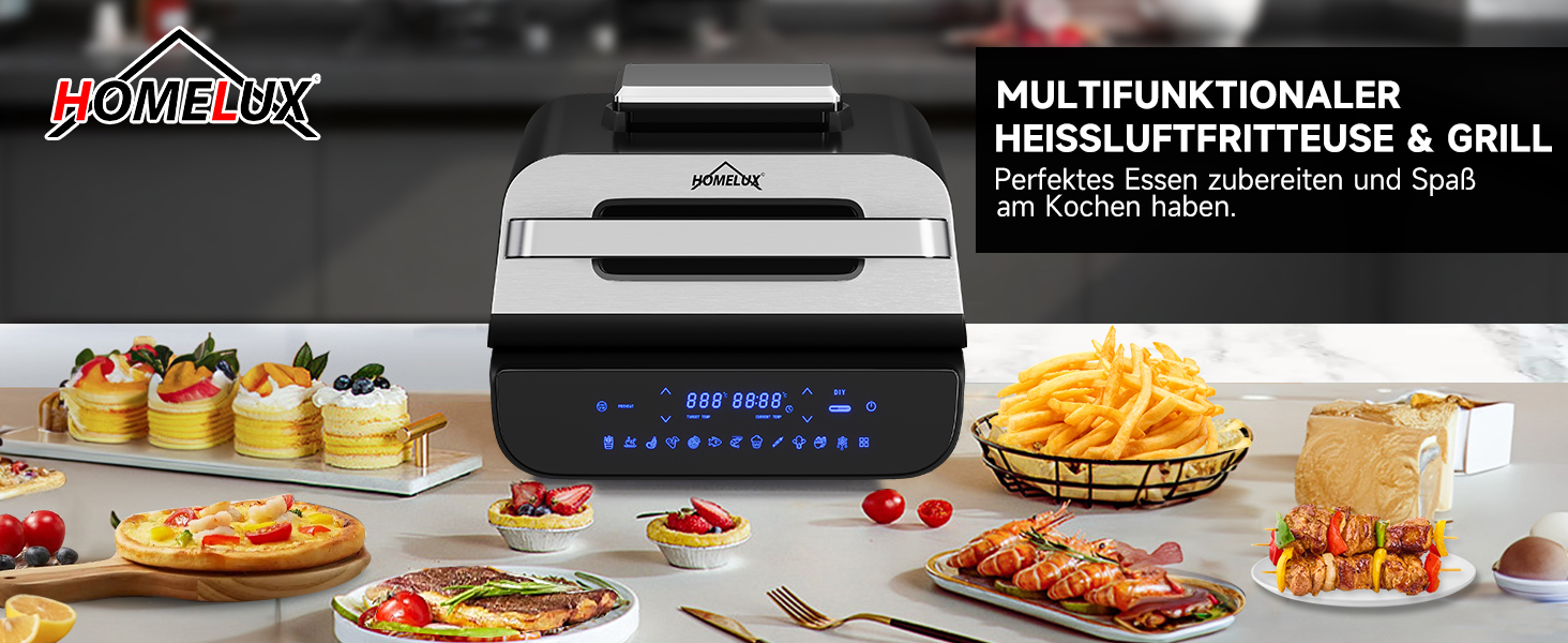1800 Watt Leistung für schnelles Garen. Große Grillfläche von 34x24 cm und 3,8 Liter Knusperkorb. Grillt bis zu 6 Steaks gleichzeitig. 60-Minuten-Timer und automatische Abschaltung für Sicherheit und Komfort.