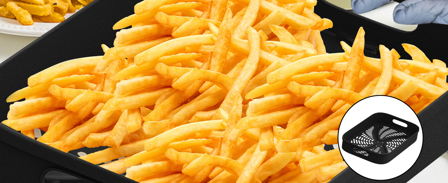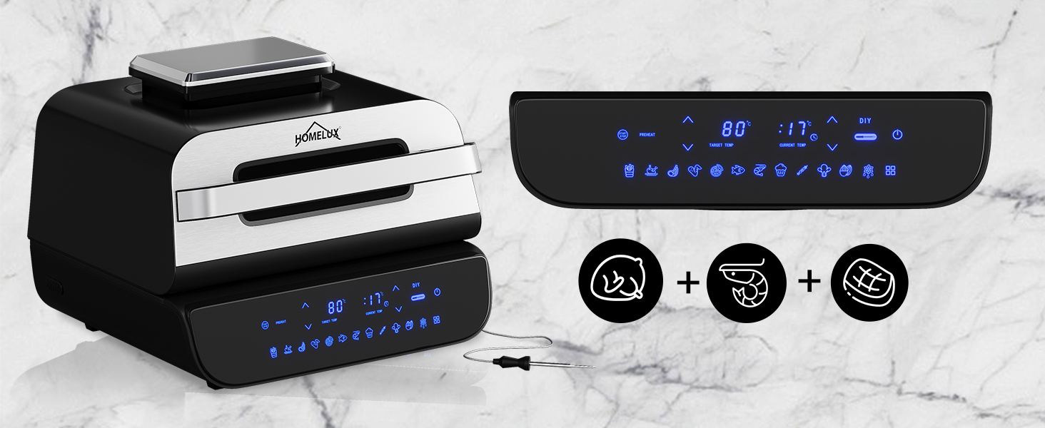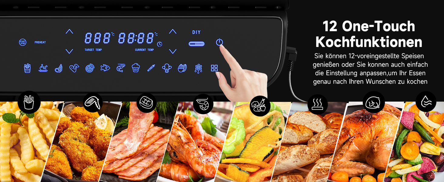 Mit 12 voreingestellten Funktionen für Grillen, Backen, Braten, Frittieren und mehr. Einfache Zubereitung von Pommes, Steaks, gegrilltem Hähnchen, Fisch und anderen Gerichten per Knopfdruck.