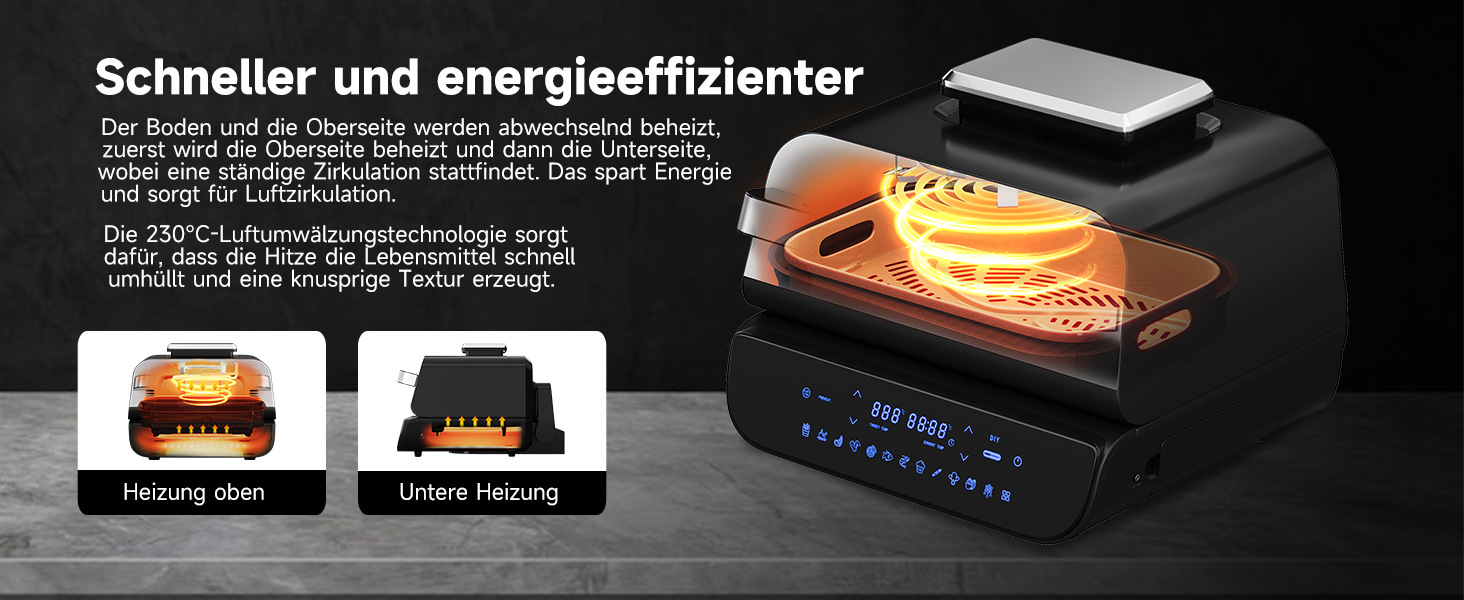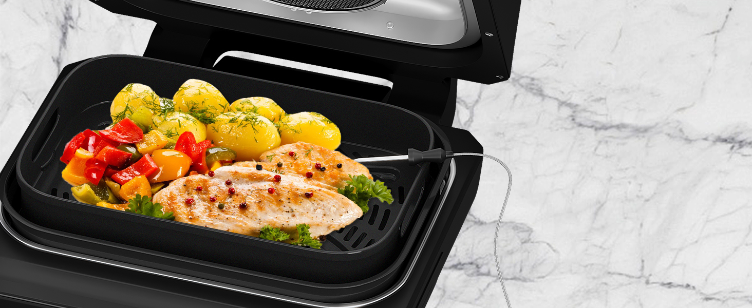 Überwacht kontinuierlich die Speisentemperatur für optimale Garergebnisse. Einstellbarer Temperaturbereich von 125-230°C für verschiedene Garstufen.