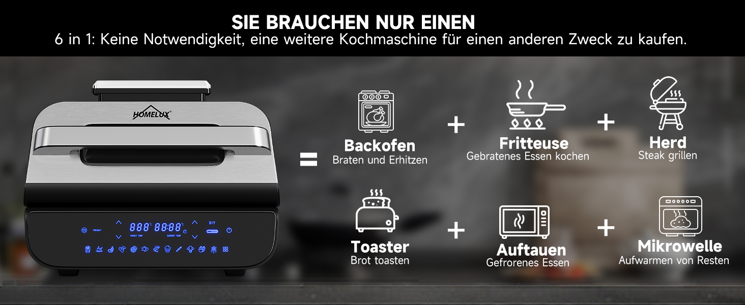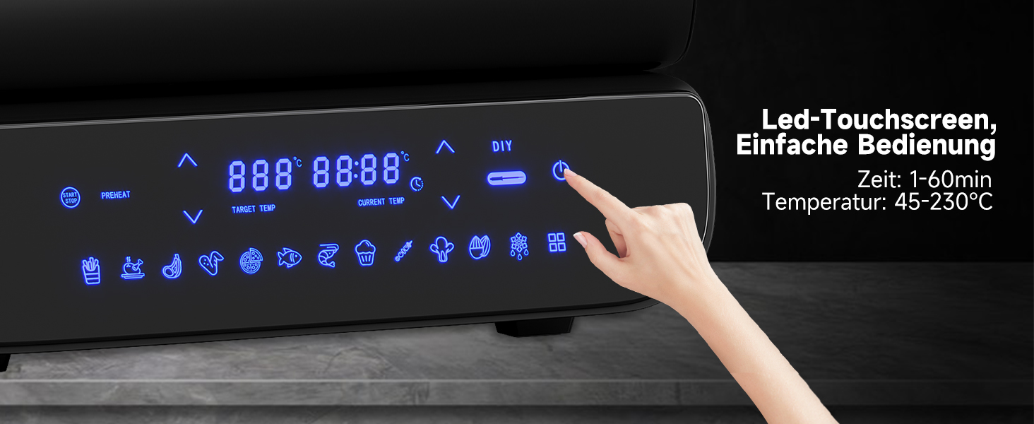 LED-Touch-Steuerung für einfache Bedienung. Platzsparendes 6-in-1-Design als Heißluftfritteuse, Toaster, Rotisserie und Pizzaofen. Ideal für vielseitige Nutzung in der Küche.