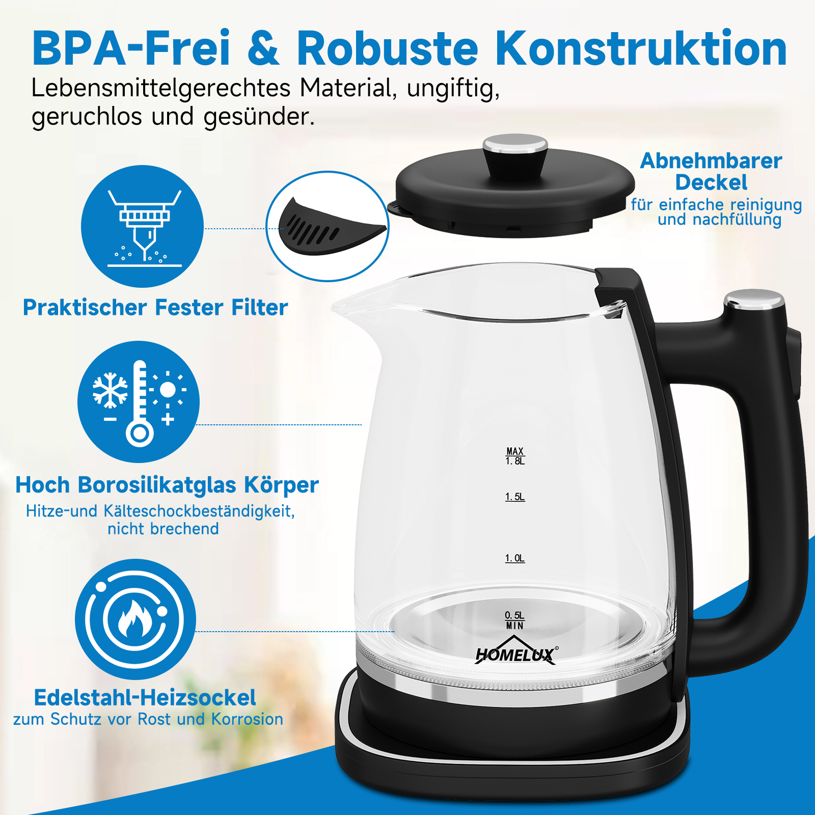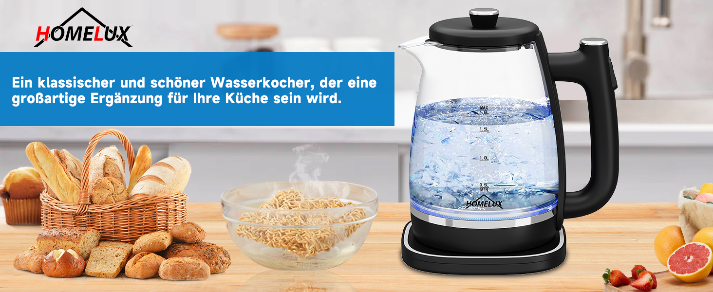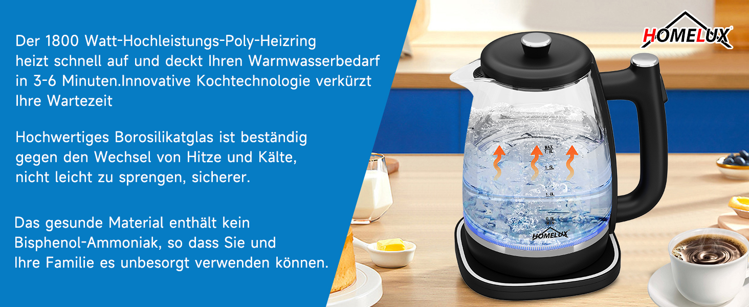 Der homelux Wasserkocher ist aus hochwertigen Materialien hergestellt. Das starke und langlebige Borosilikatglas ist sehr stabil, widerstandsfähig gegen Hitze und Kälte, nicht leicht zu brechen und leicht zu reinigen. Eingebaute Heizplatte aus lebensmittelechtem Edelstahl, ungiftig, geruchlos und BPA-frei, damit Sie immer gesundes Trinkwasser erhalten!