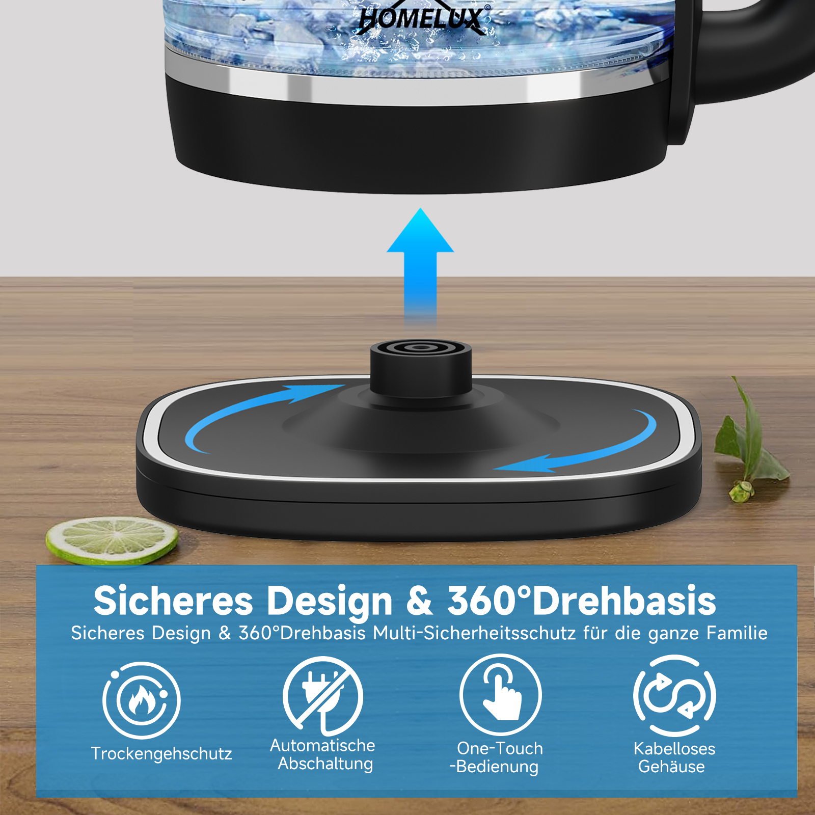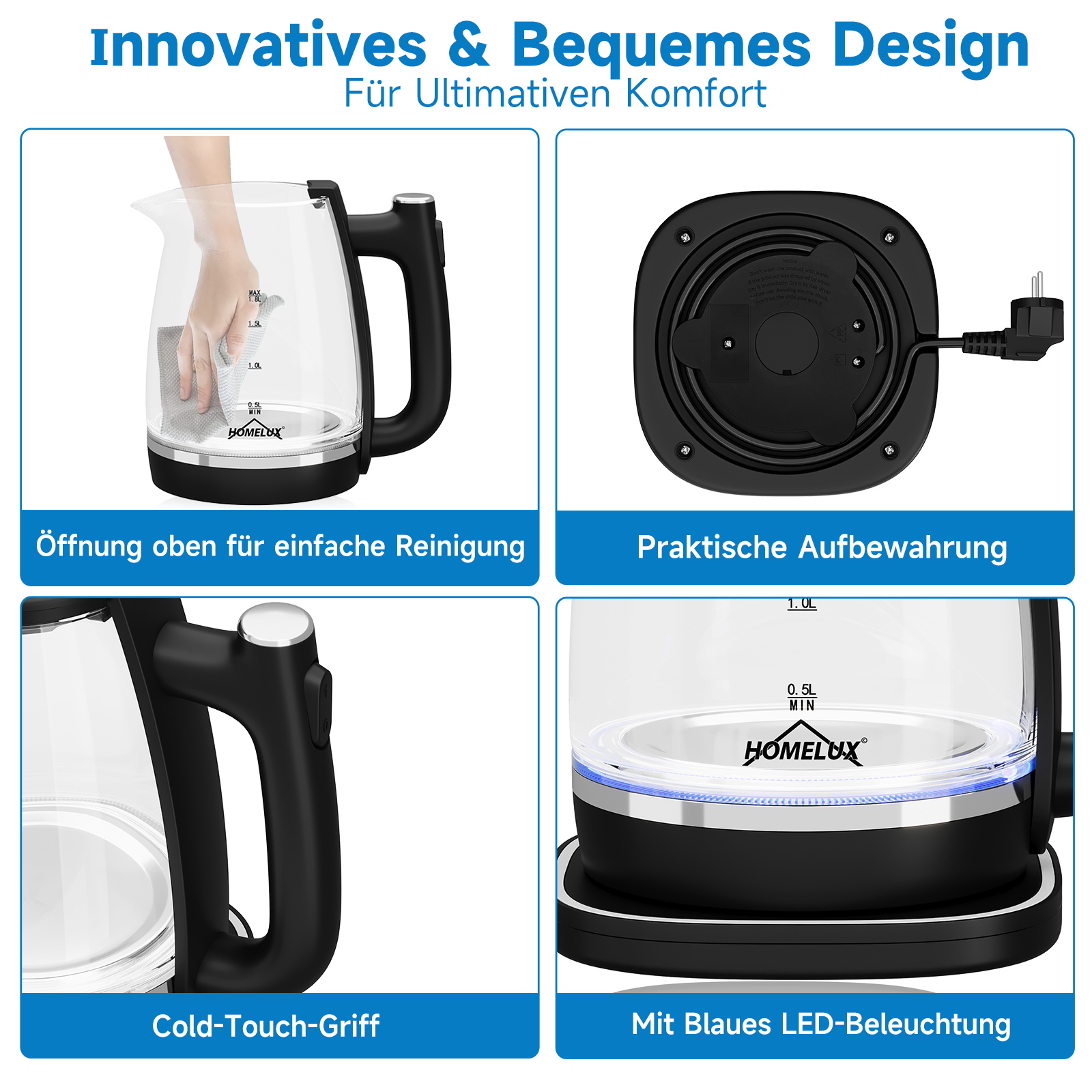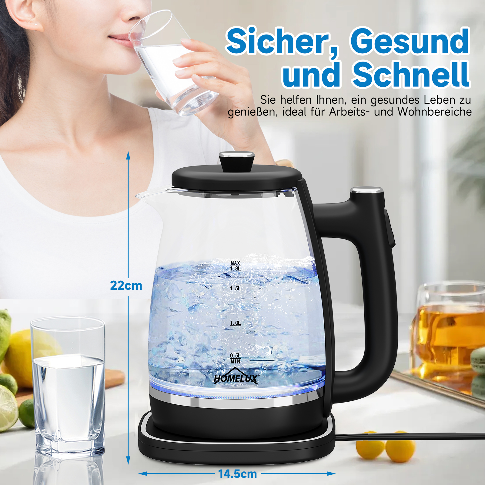 Der homelux Wasserkocher ist aus hochwertigen Materialien hergestellt. Das starke und langlebige Borosilikatglas ist sehr stabil, widerstandsfähig gegen Hitze und Kälte, nicht leicht zu brechen und leicht zu reinigen. Eingebaute Heizplatte aus lebensmittelechtem Edelstahl, ungiftig, geruchlos und BPA-frei, damit Sie immer gesundes Trinkwasser erhalten!