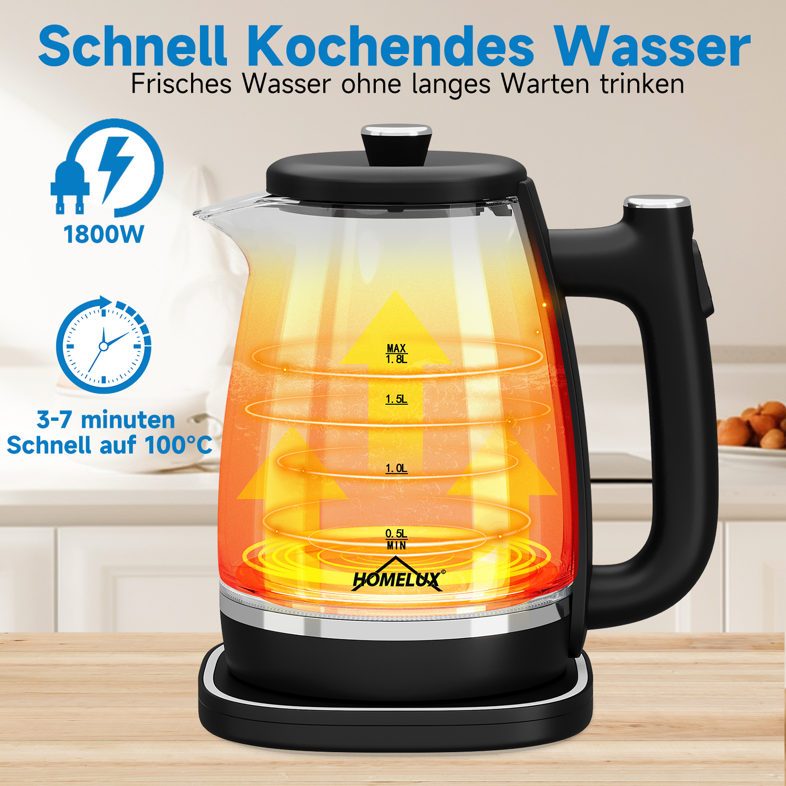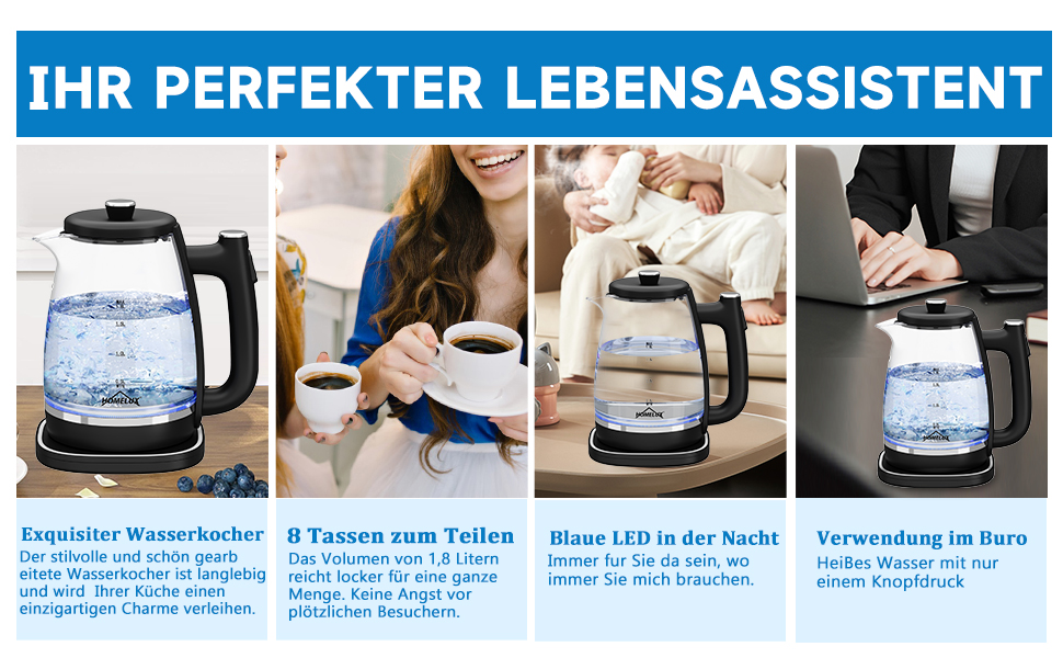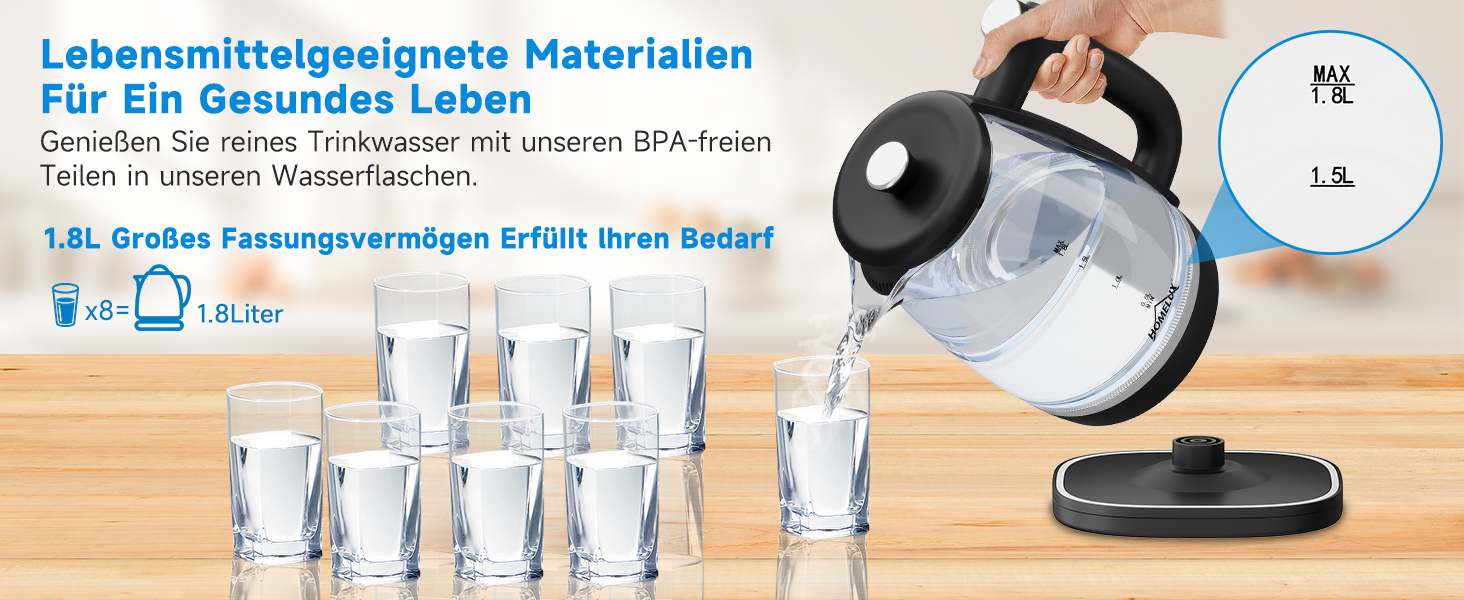 1800 Watt starke Leistung, um schnelles Kochen zu erreichen, frisches Wasser zu trinken, ohne zu warten.1.8L große Kapazität Design kann den Wasserbedarf der ganzen Familie zu erfüllen, keine Notwendigkeit, Wasser häufig zu kochen, und müssen nicht über plötzliche Besucher zu kümmern. Sie können damit schnell Kaffee, Tee, Haferflocken usw. aufbrühen und die Wartezeit verkürzen.