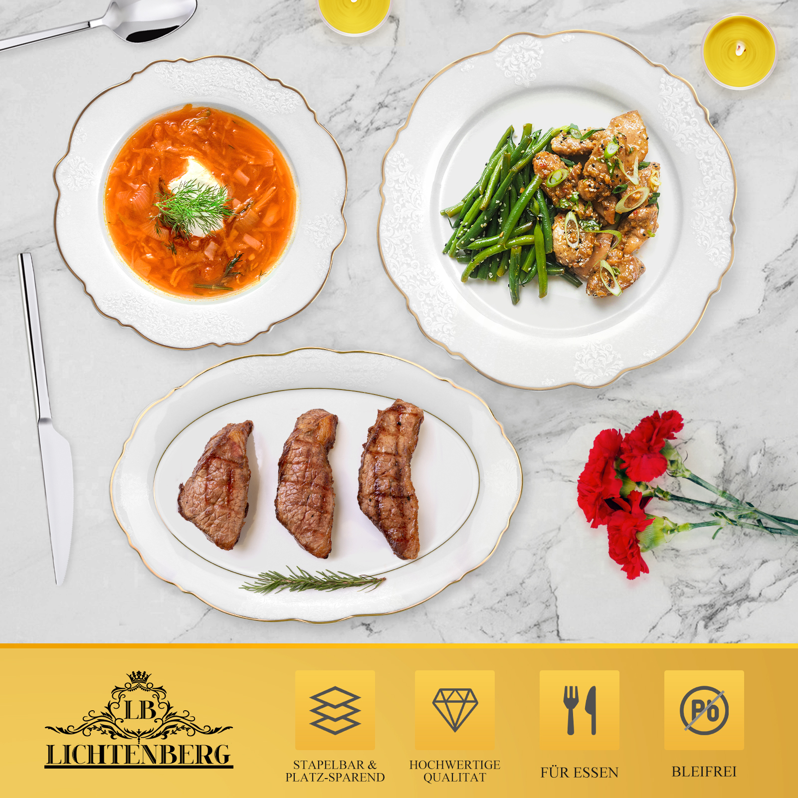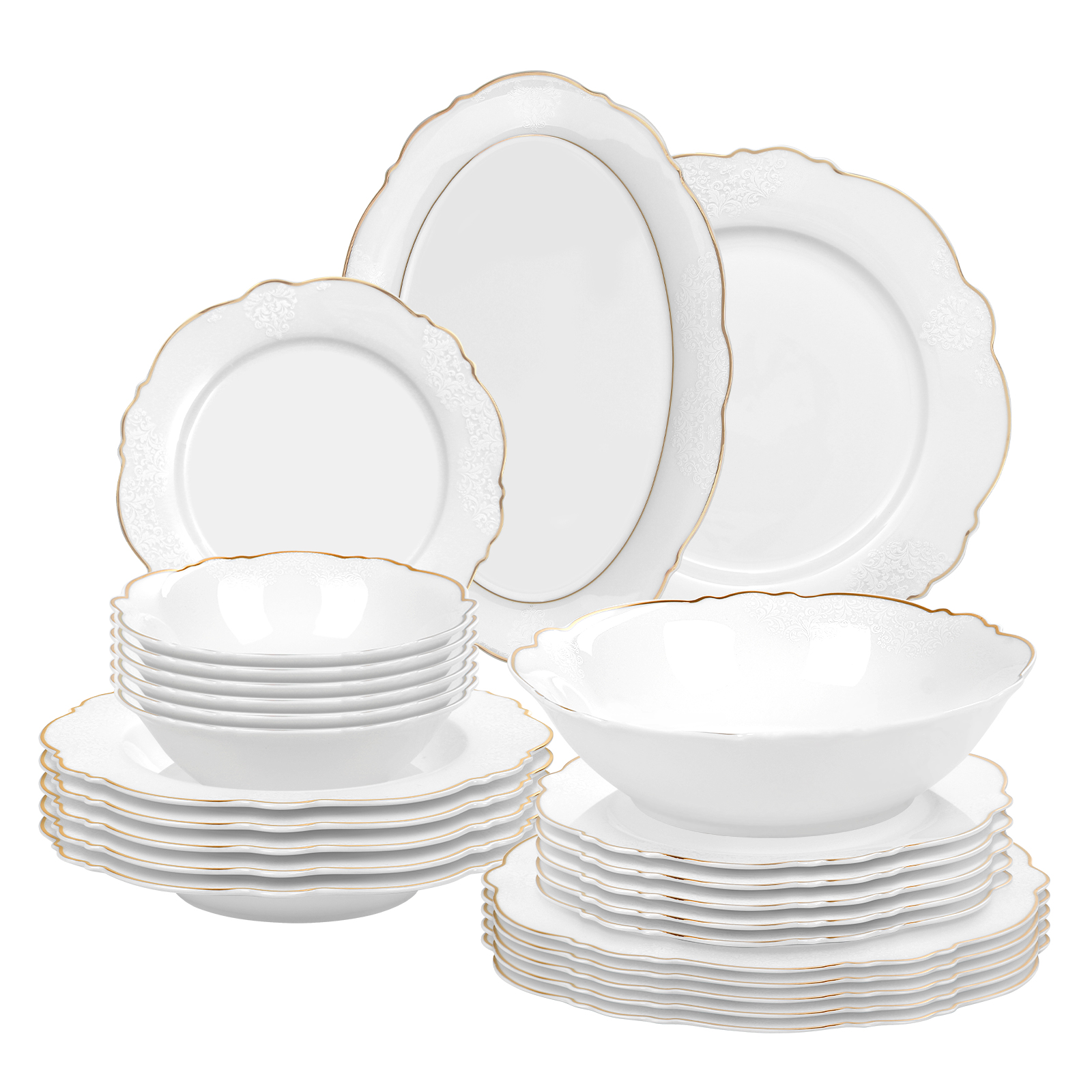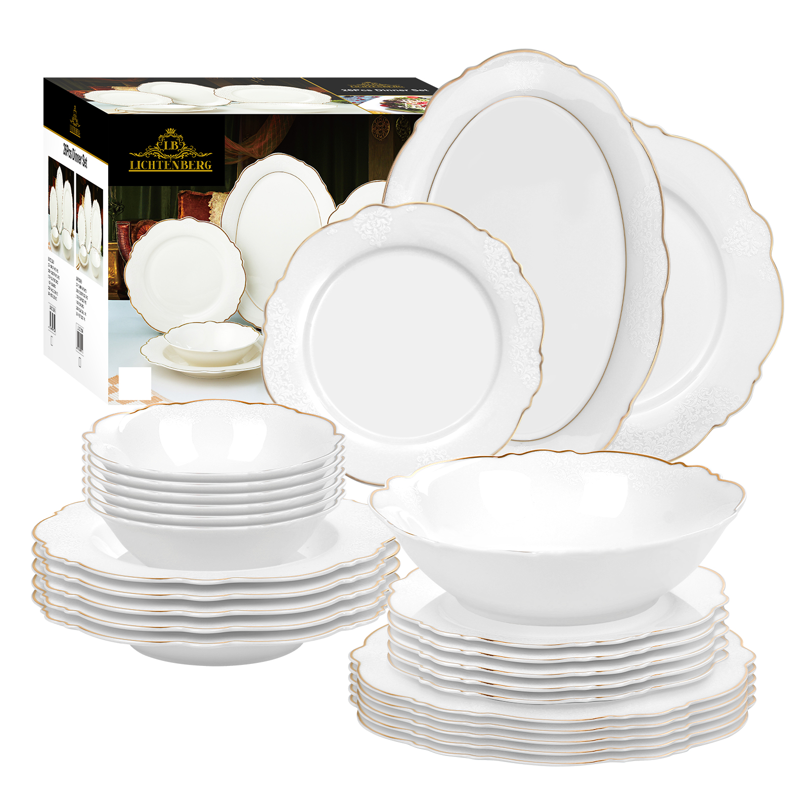 Lassen Sie sich von den großzügigen 6x Servierteller , 6x Suppenteller, 6x Kleine Schüsseln , 6x Dessertteller, 1x Großer ovaler Servierteller , 1x Salatschüssel ,zu einem einzigartigen Essvergnügen verführen. Unser Tafelservice Siena ist für 6 Personen Komplettes Set ausgelegt und eignet sich somit perfekt für Gesellschaften