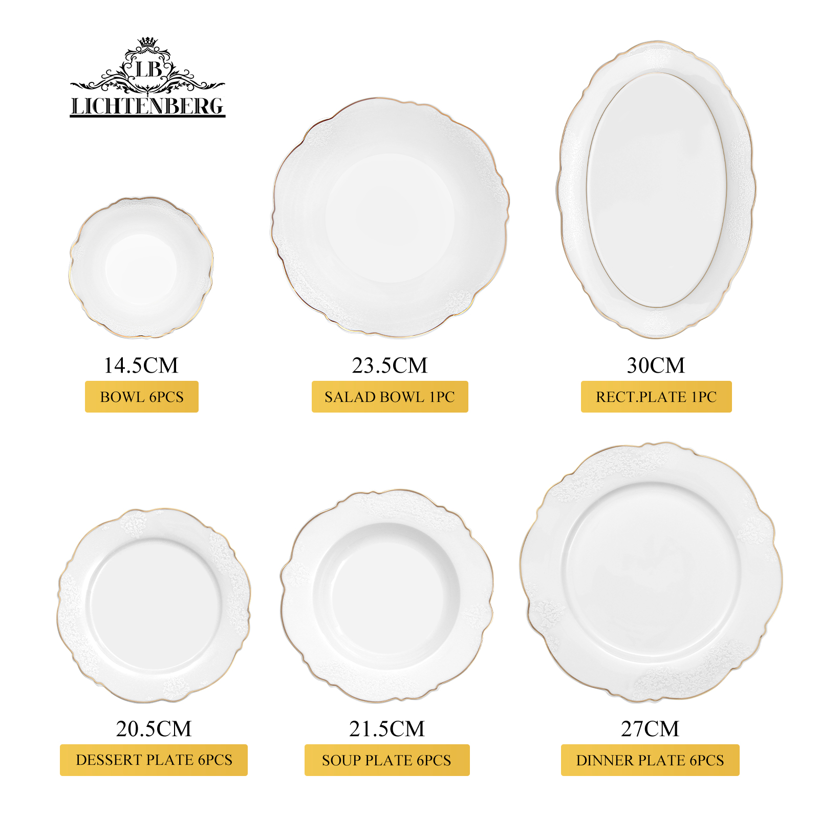 27CM ESSTELLER 6PCS . 20,5CM DESSERTTELLER 6PCS . 21,5 CM SUPPENTELLER 6PCS . 14,5 CM SCHALE 6PCS 23,5CM SALATSCHÜSSEL 1ST. 30CM REKT.TELLER 1ST.