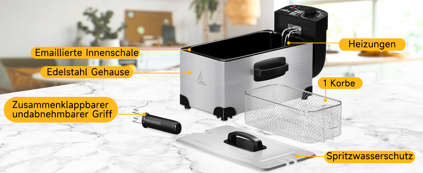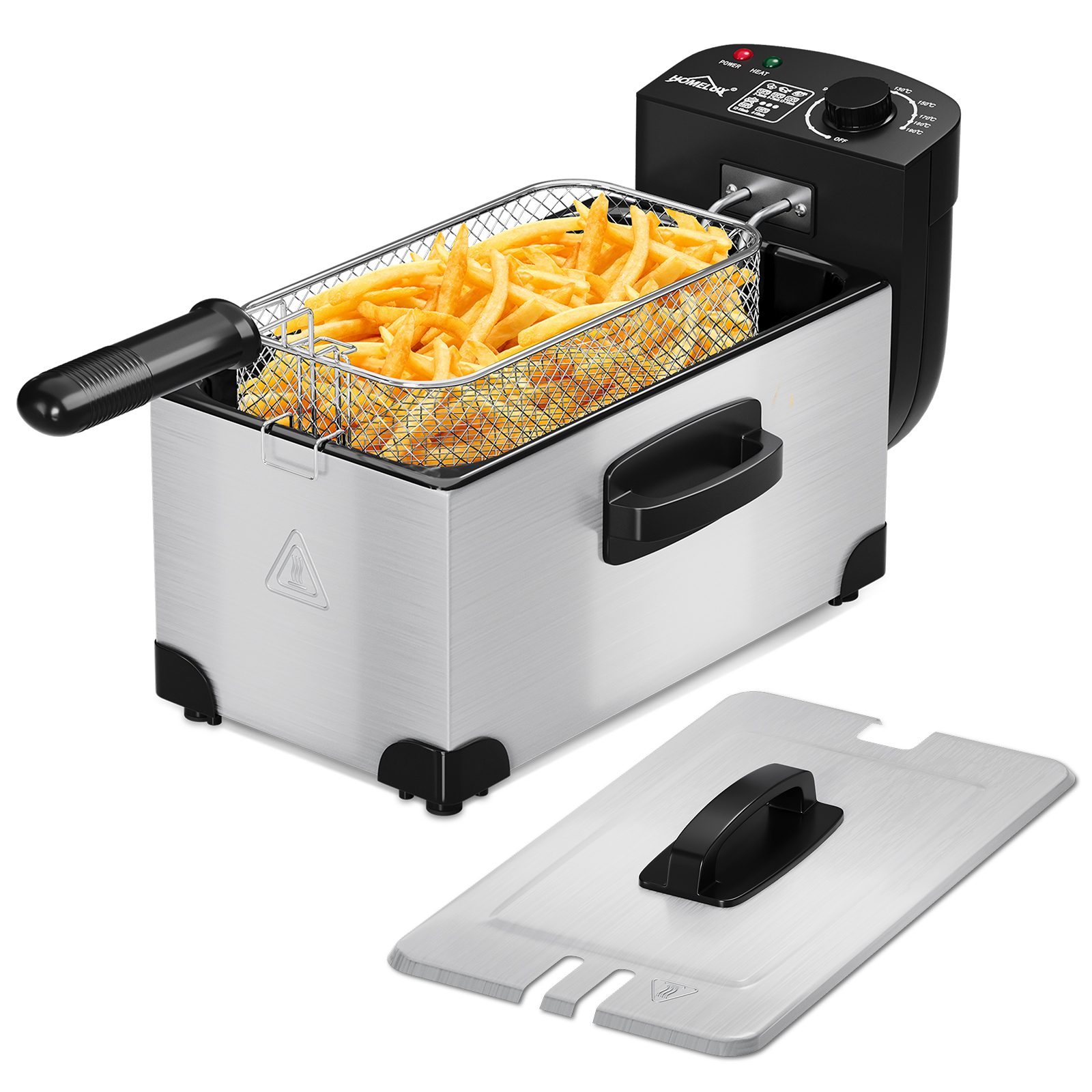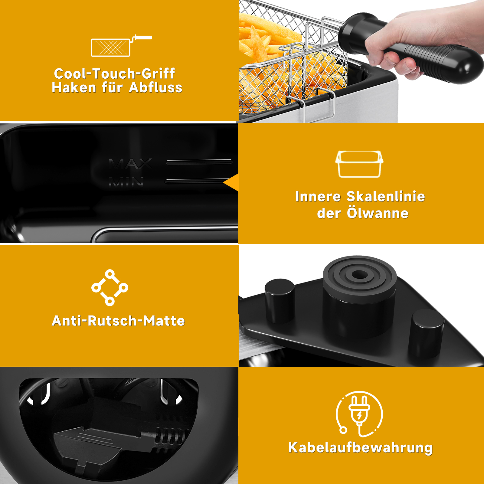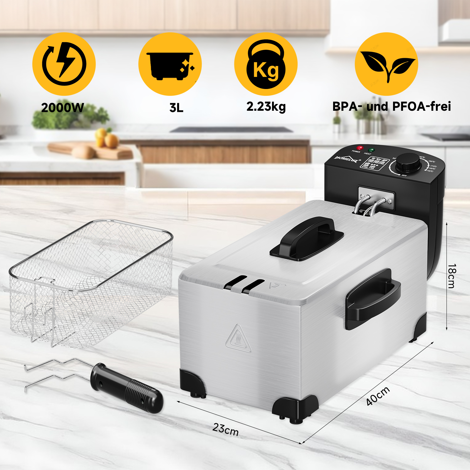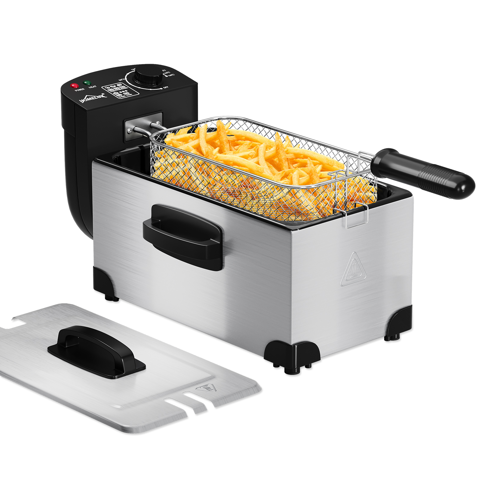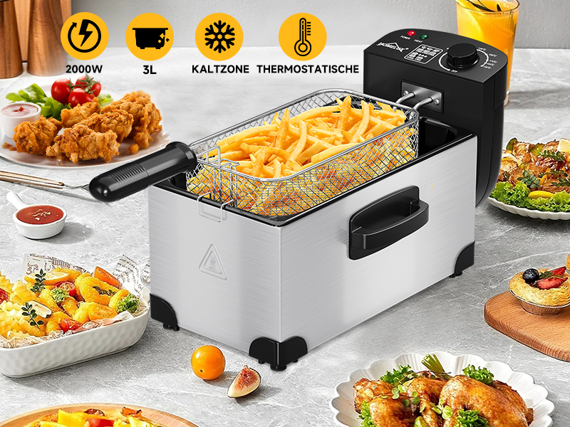 Diese Fritteuse mett fett / öl hat ein kompaktes Aussehen und ein großes Fassungsvermögen von 3 l zum Frittieren von bis zu 1 kg Pommes frites, Snacks und Fleisch für 3-4 Personen.