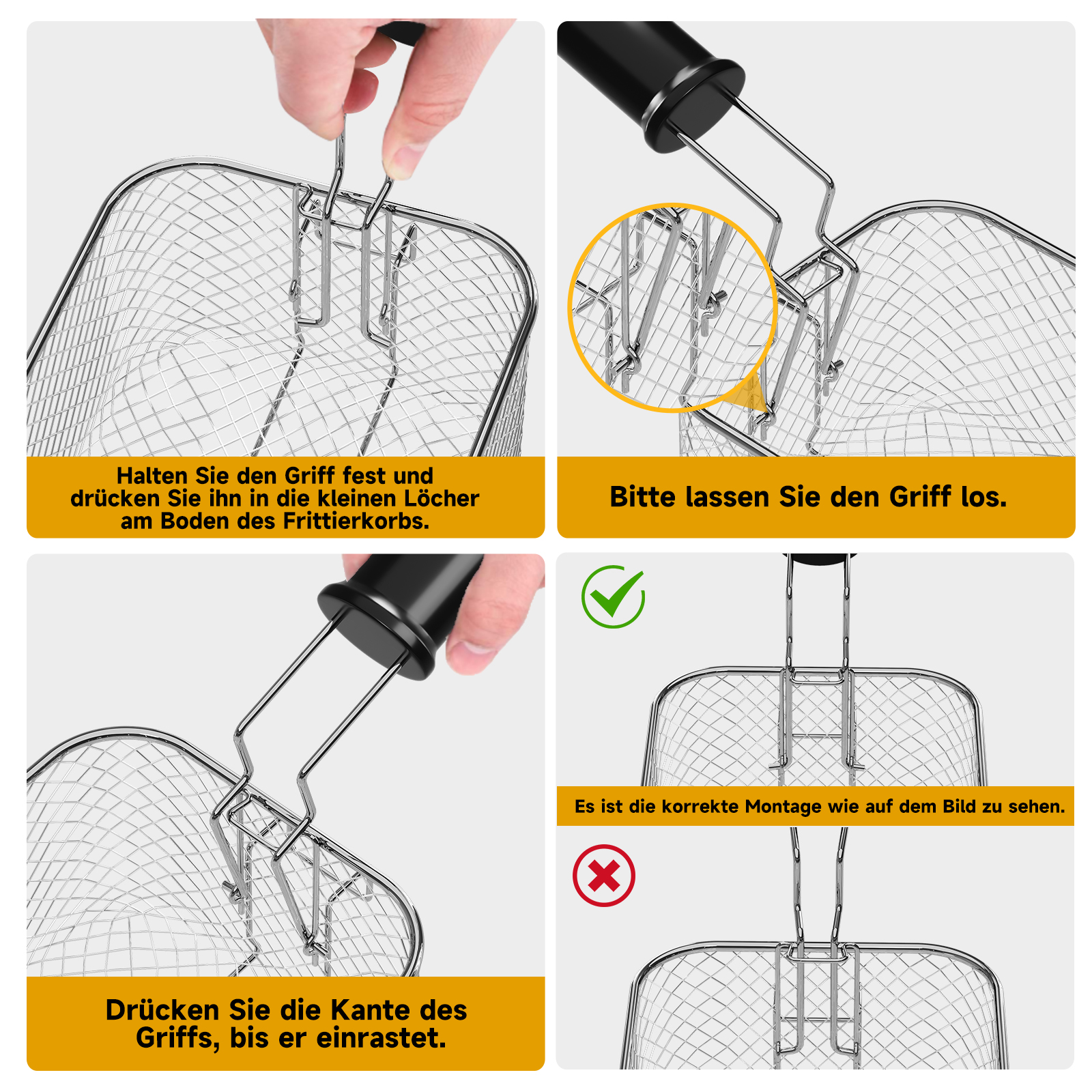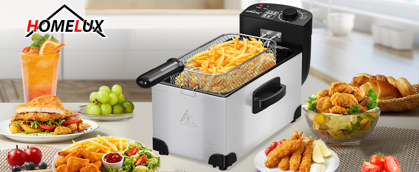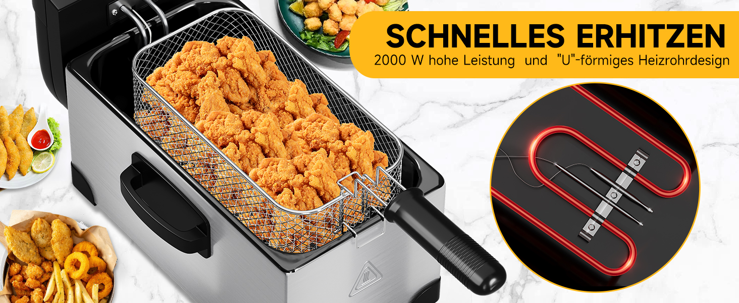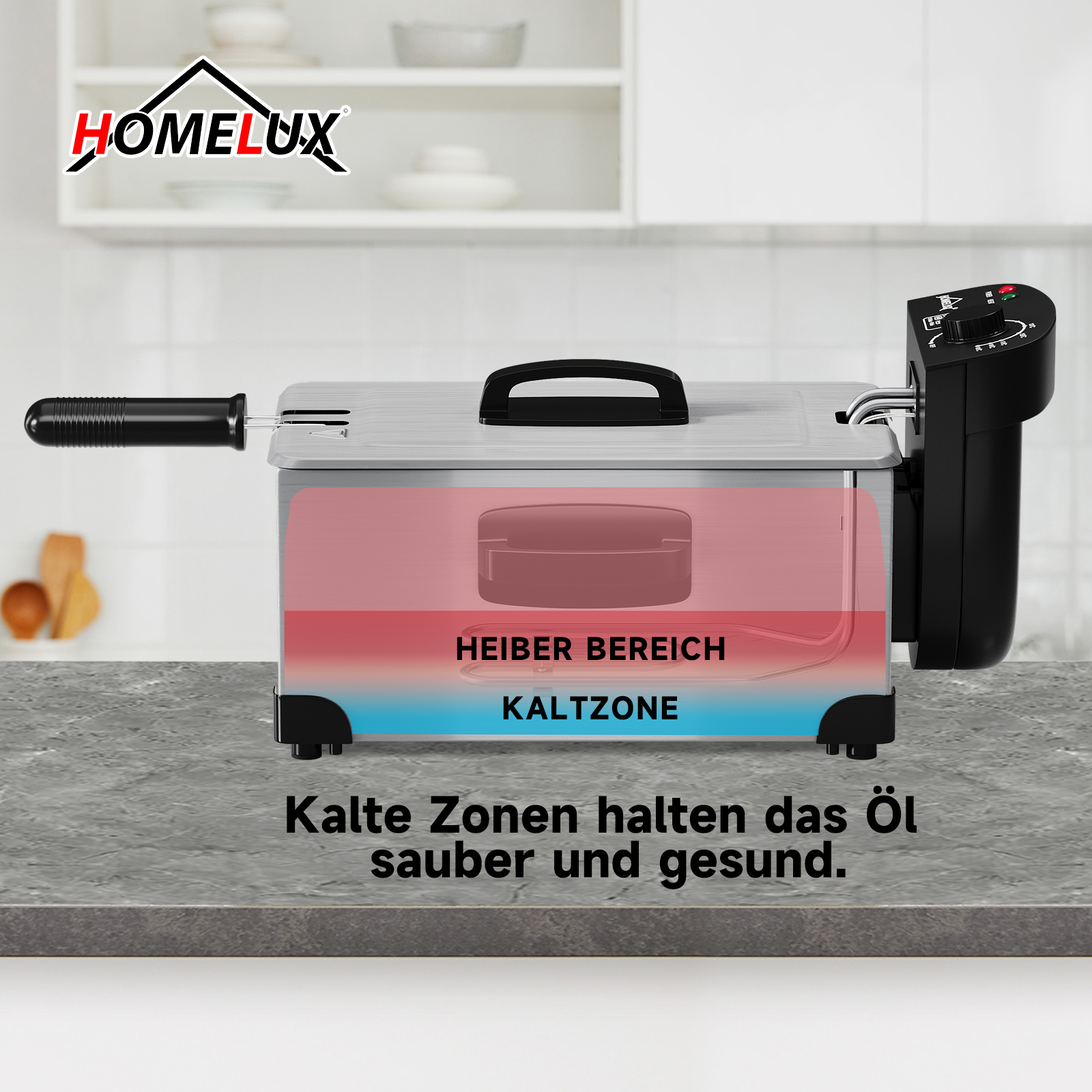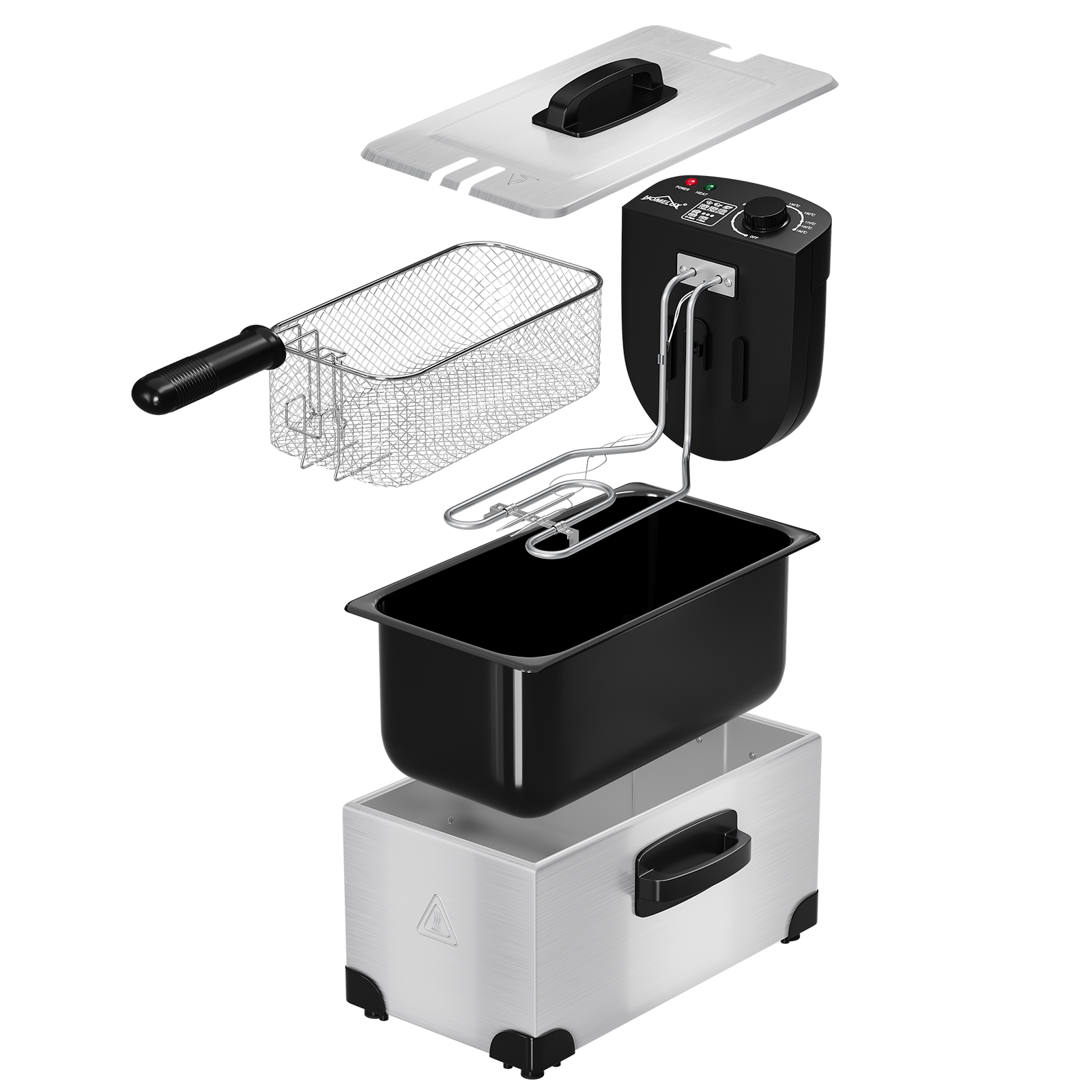Diese Fritteuse mett fett / öl hat ein kompaktes Aussehen und ein großes Fassungsvermögen von 3 l zum Frittieren von bis zu 1 kg Pommes frites, Snacks und Fleisch für 3-4 Personen.