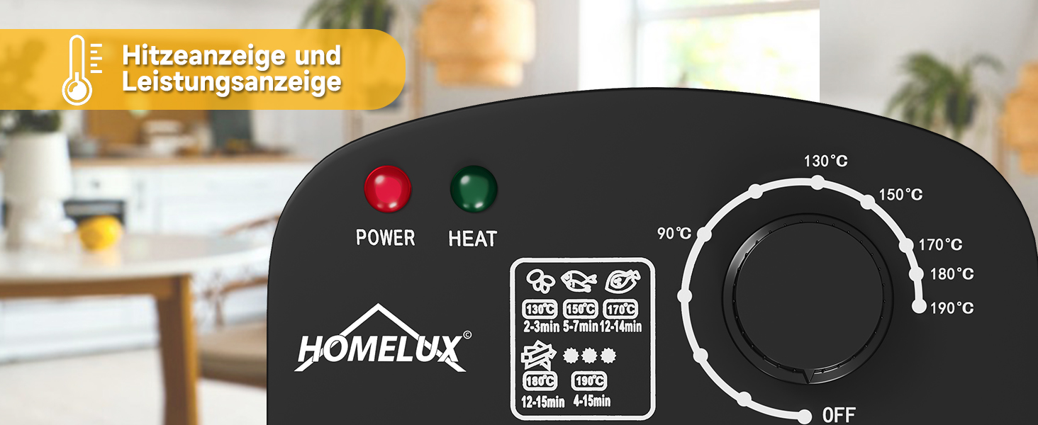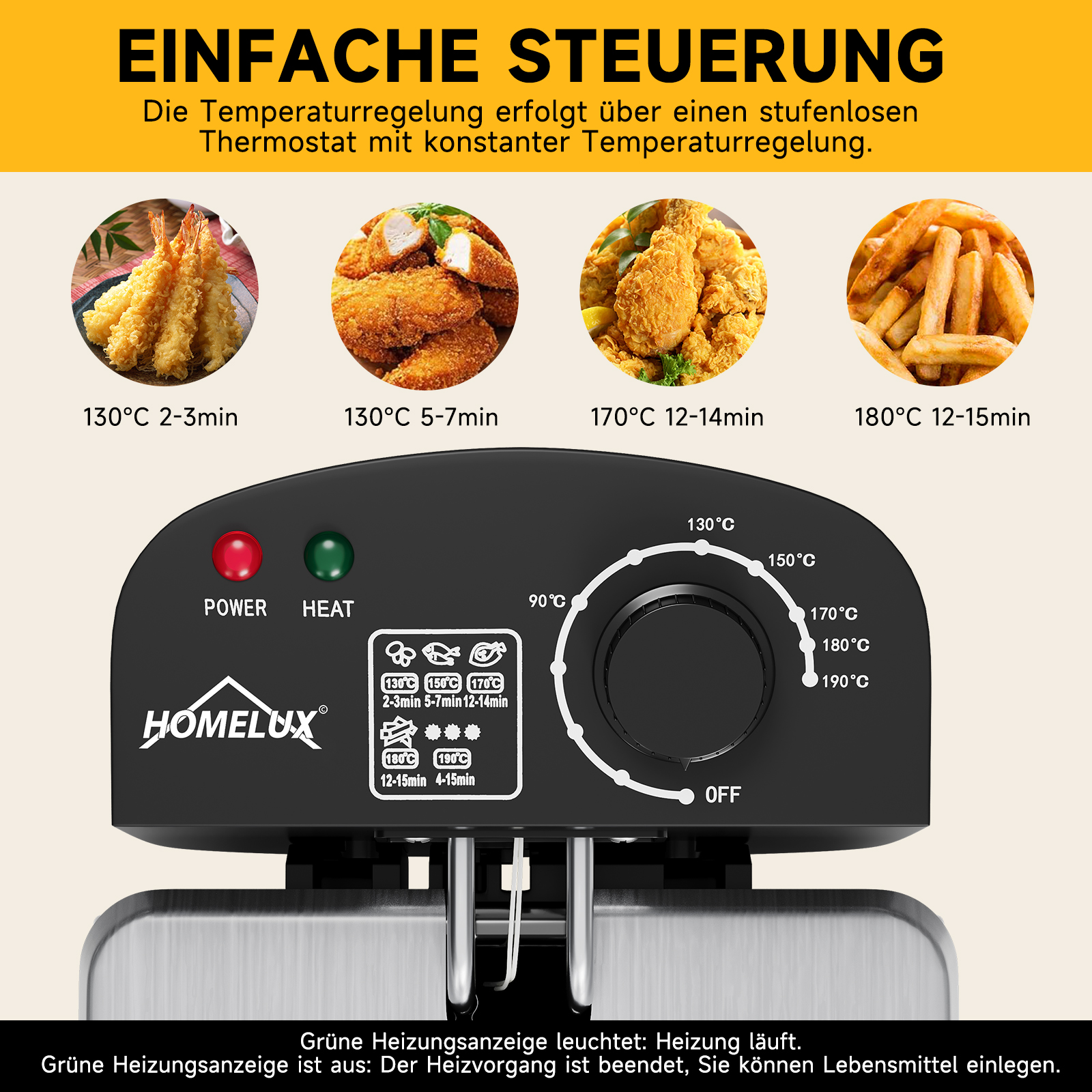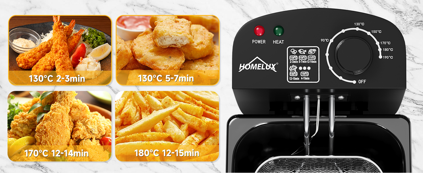 Temperatur-Einstellbereich 0-190℃, kann verwendet werden, um eine Vielzahl von Lebensmitteln, wie Chips, Fisch, Hähnchenflügel Donuts und vieles mehr.