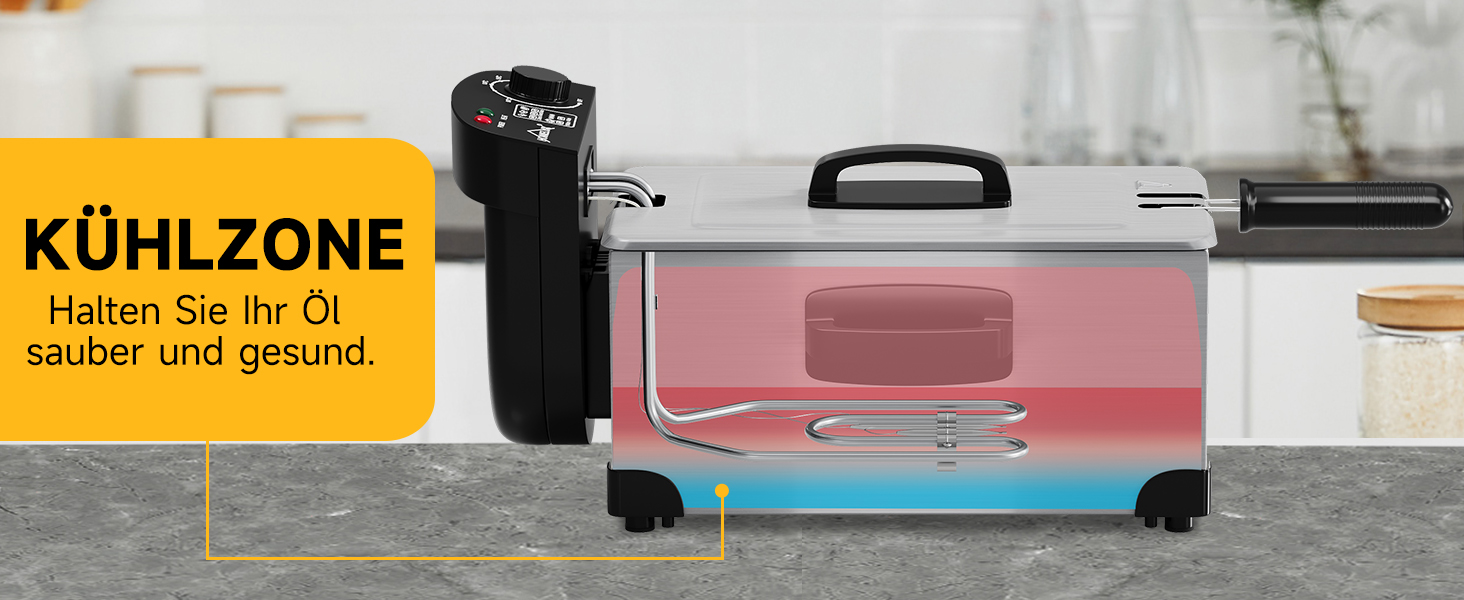 Elektrische deep fryer verwendet eingetauchten Heizelements für eine kurze Aufheizzeit. Eine kaltezone unter dem Fettbehälter verhindert, dass aus dem Frittierkorb herausfallende Rückstände verbrennen und das Öl verdirbt.