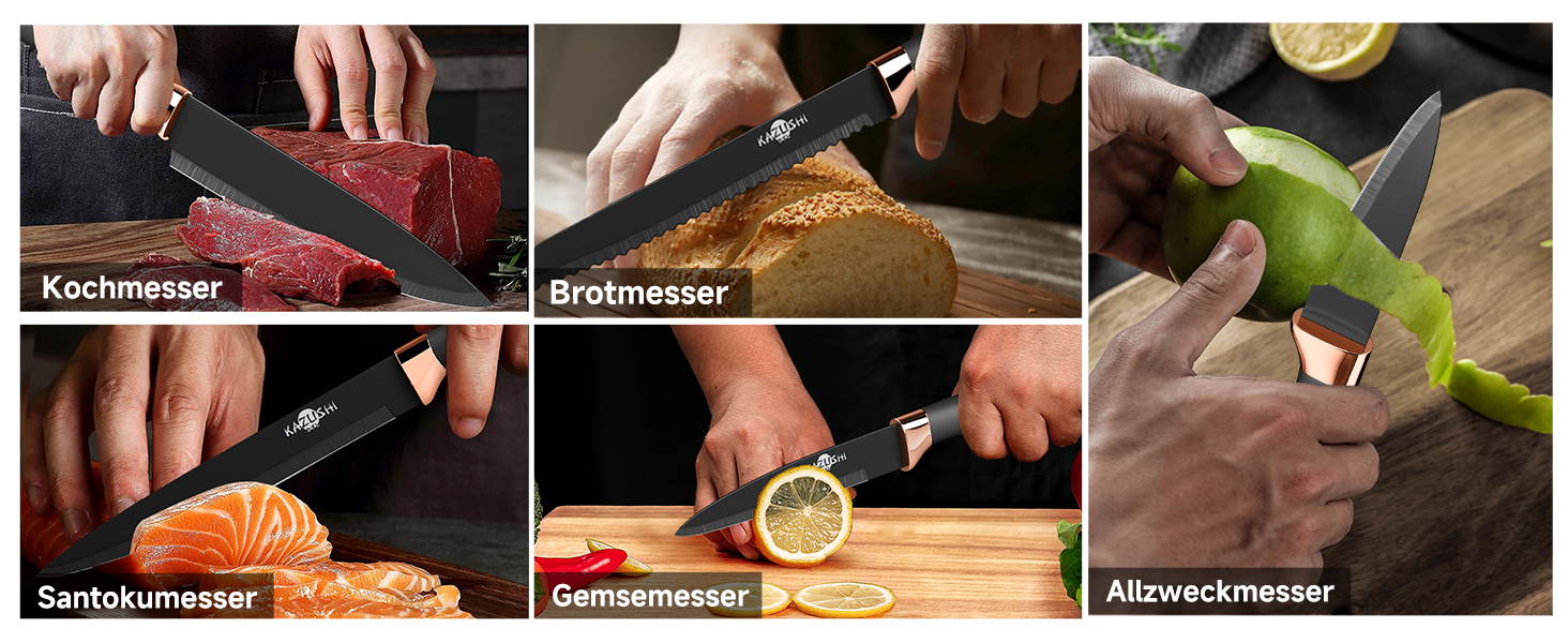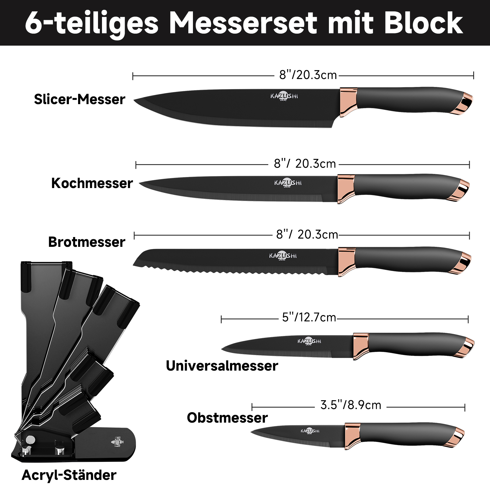 Dieses Küchenmesserset enthält 19 cm Kochmesser, 19 cm Tranchiermesser, 19 cm Brotmesser, 11 cm Universalmesser, 9 cm Schälmesser und Drehbare Messerblock. Dieses hochwertige Messerset deckt alle Ihre Bedürfnisse in der Küche ab.