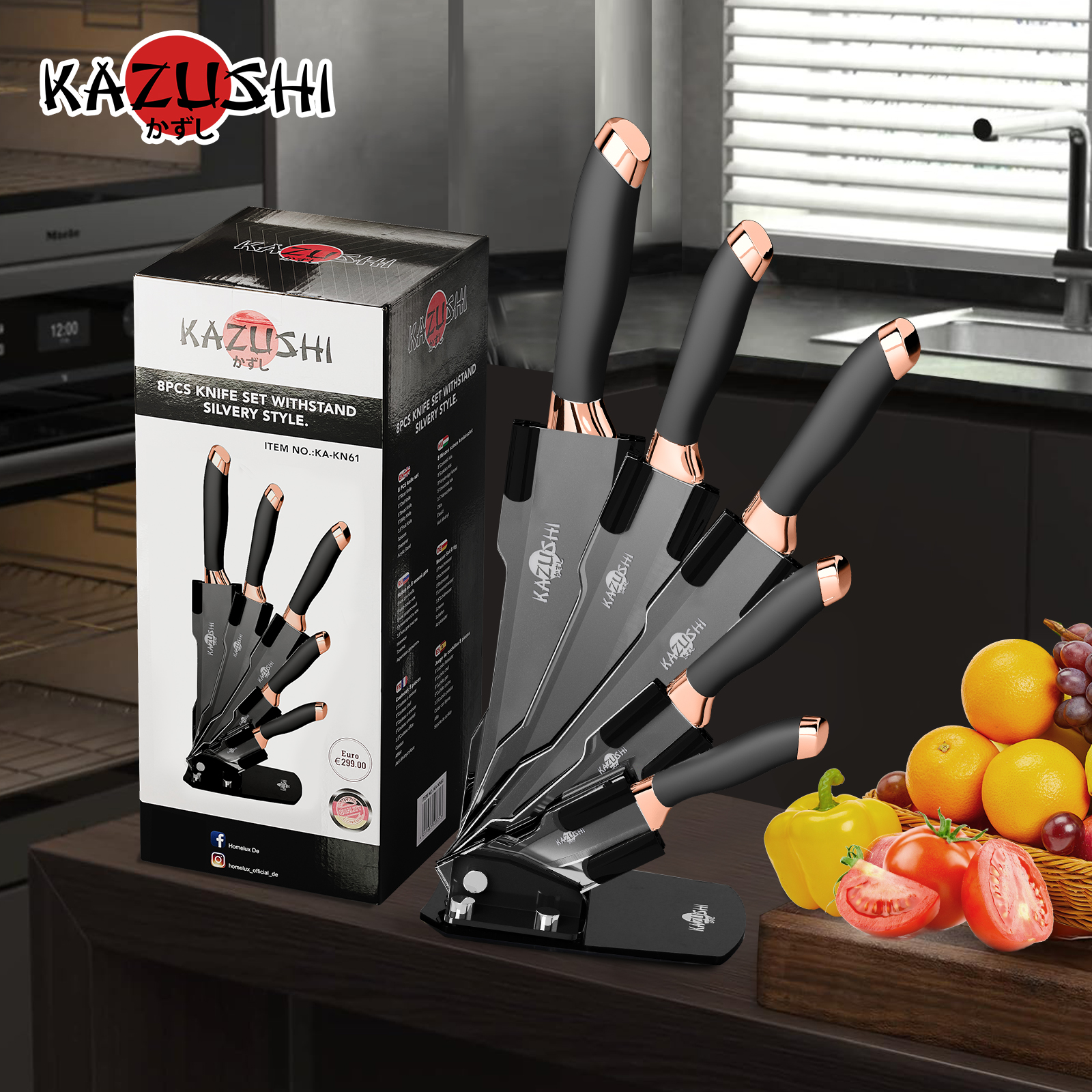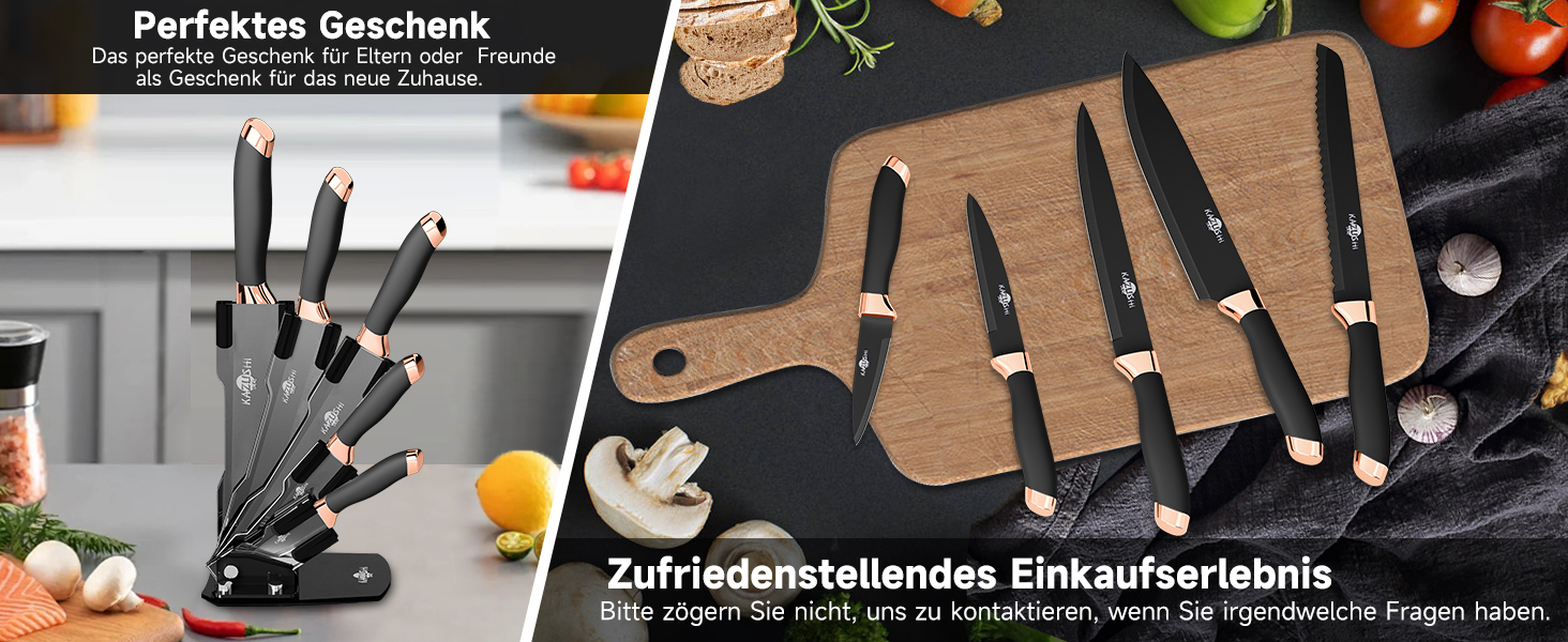 Dieses originelle 6-teilige Küchenmesser-Set mit block ist eine elegante Küchendekoration und eine gute Wahl als Geschenk. Bitte zögern Sie nicht, uns zu kontaktieren, wenn Sie Fragen zur Verwendung oder zu Qualitätsproblemen haben.
