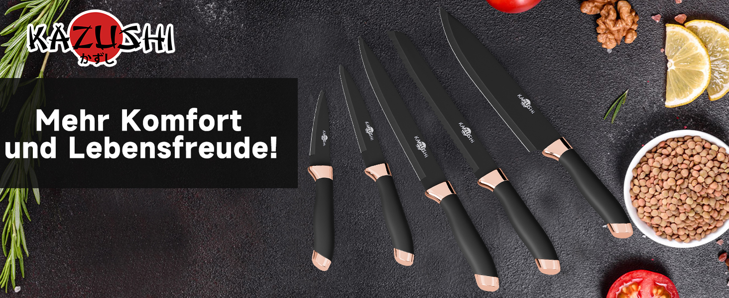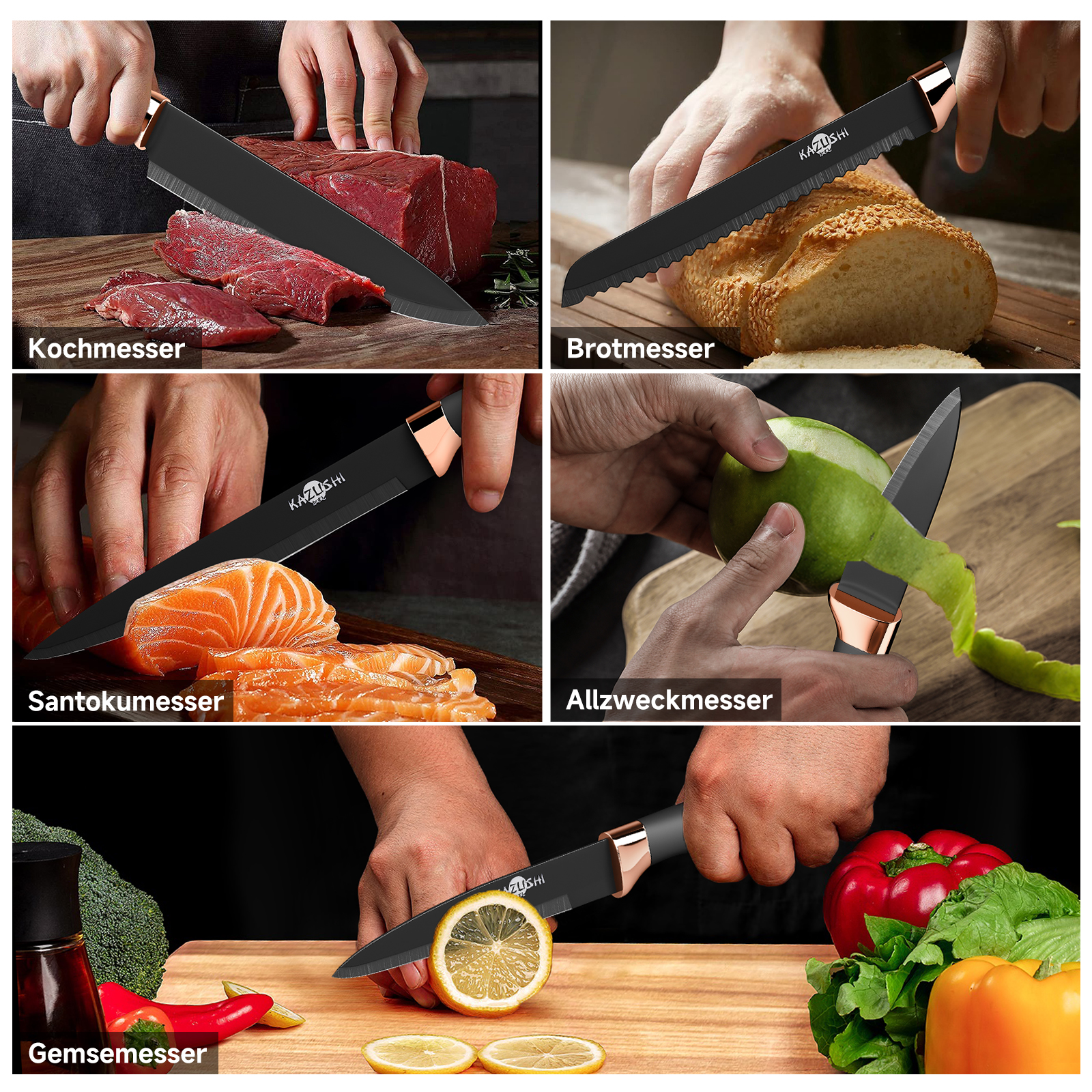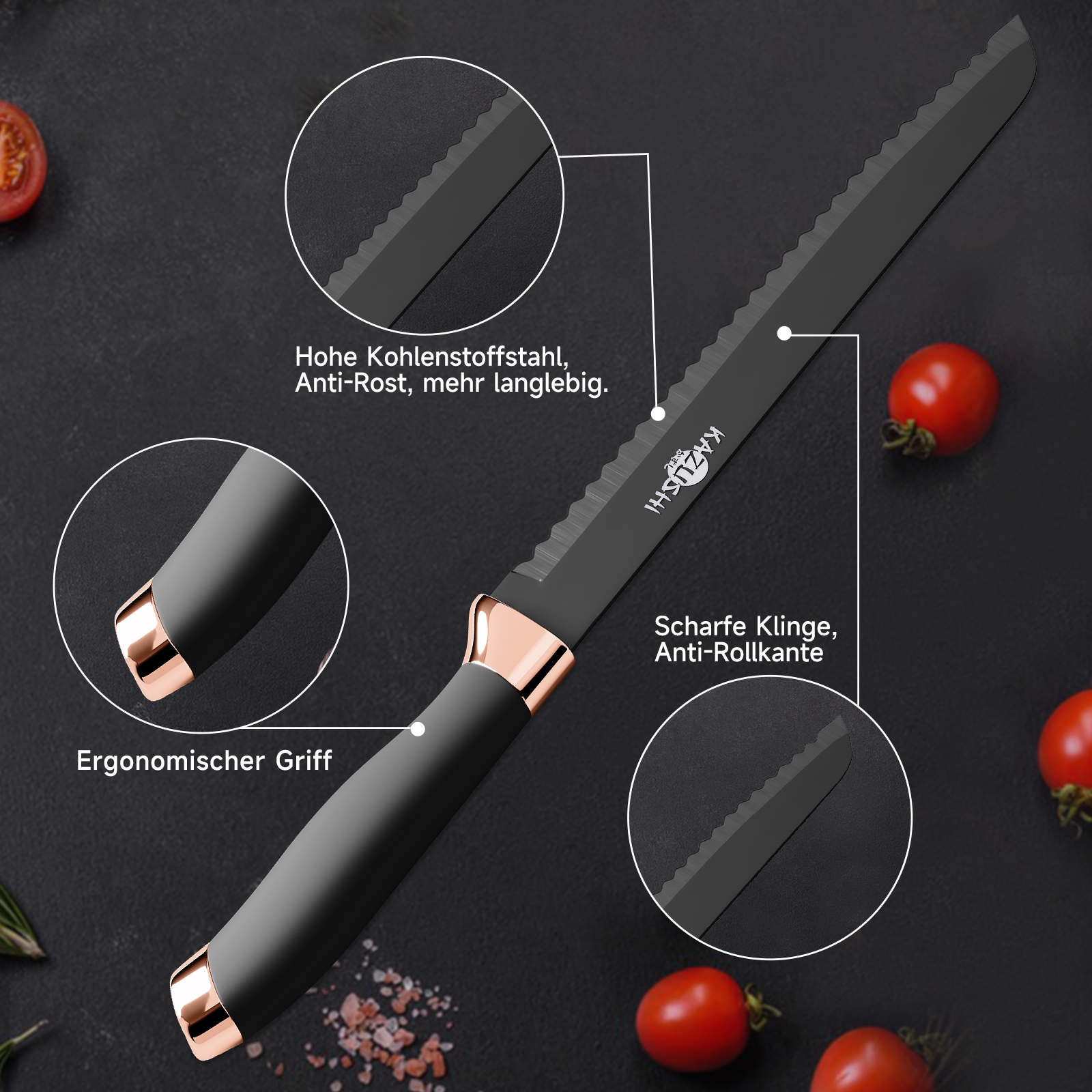 Dieses Messerset besteht aus rostfreiem Stahl mit hohem Kohlenstoffgehalt für Stärke und Haltbarkeit. Scharfe Kante für müheloses Schneiden, leicht mit Fleisch, Gemüse, Obst, Brot und so weiter umzugehen. Elegante Akzente in Roségold am Griff des Messers verleihen ihm ein stilvolles Aussehen.