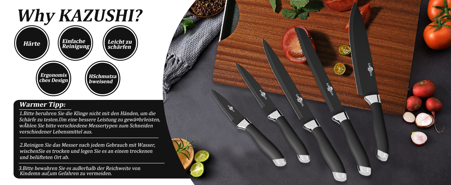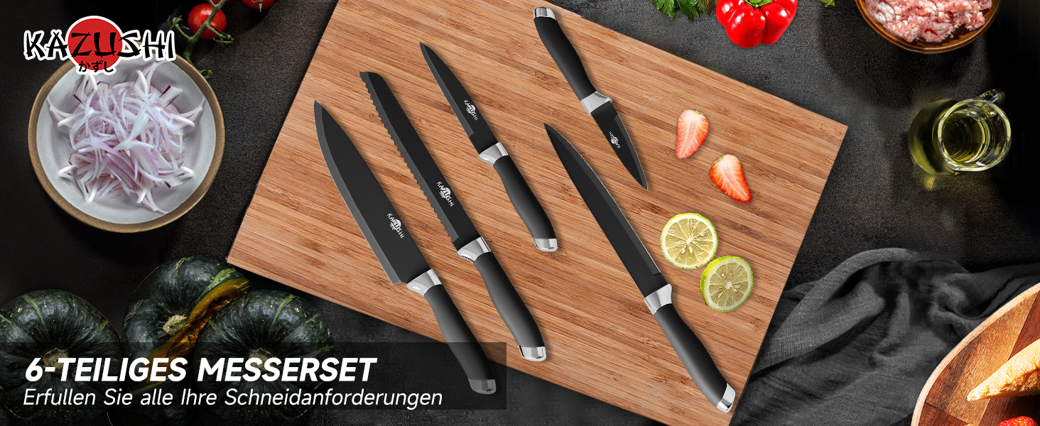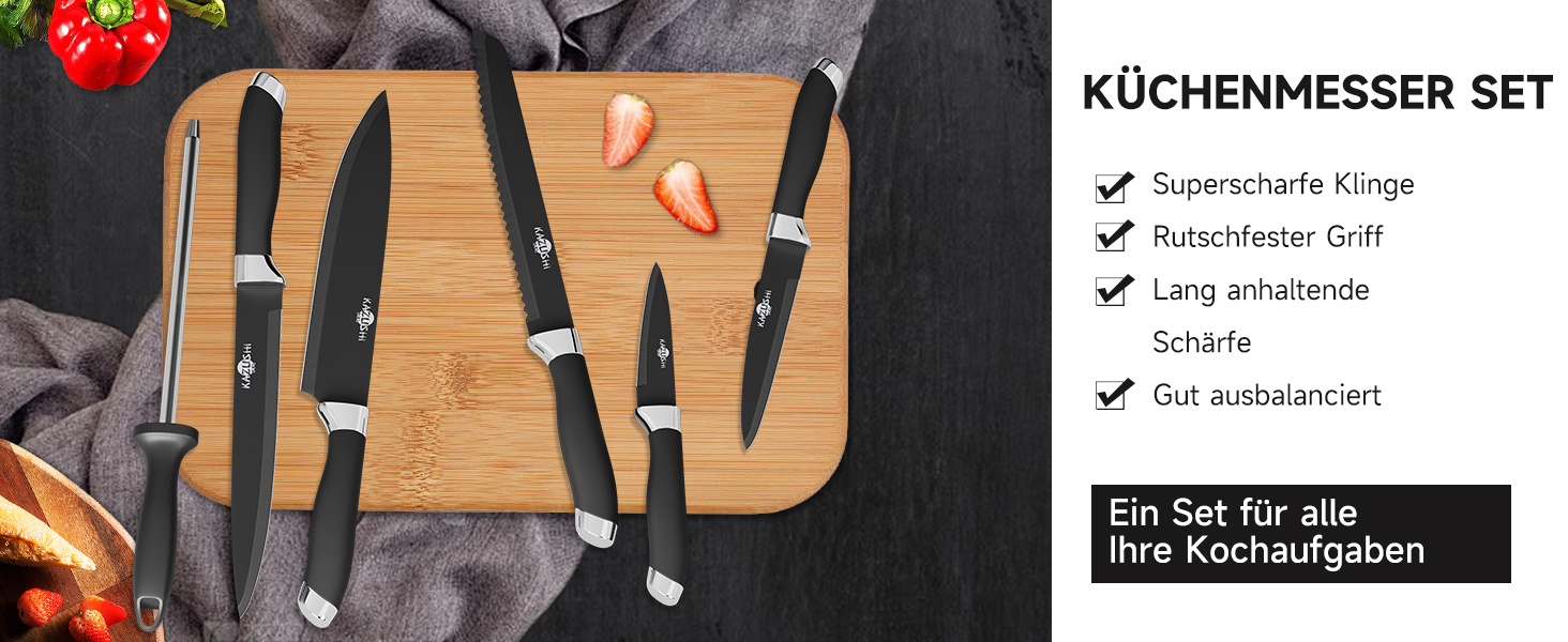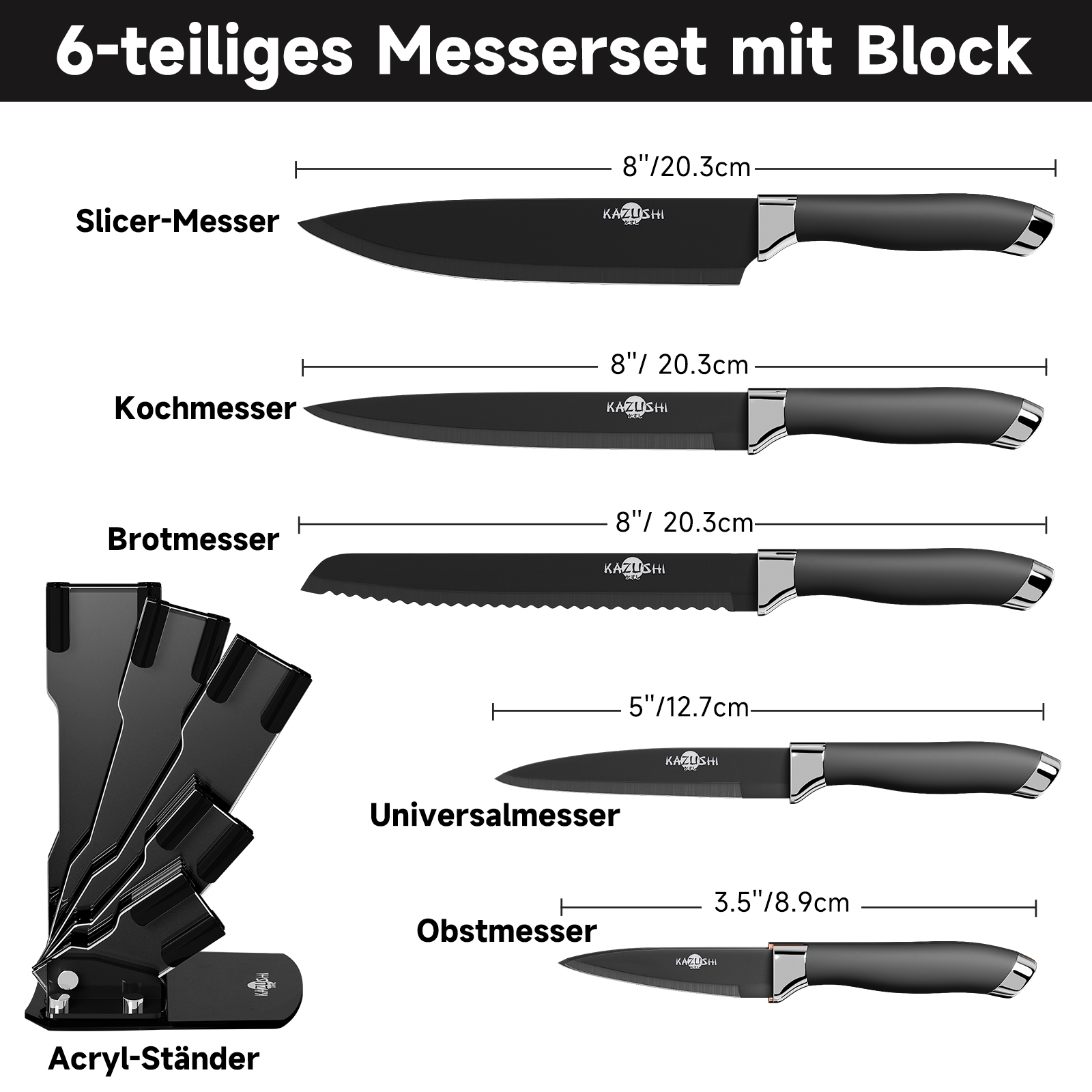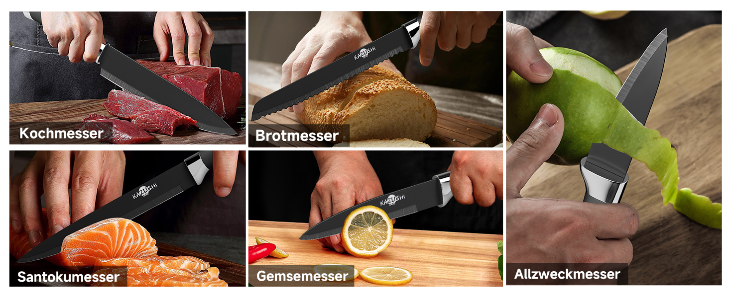 Dieses Küchenmesserset enthält 19 cm Kochmesser, 19 cm Tranchiermesser, 19 cm Brotmesser, 11 cm Universalmesser, 9 cm Schälmesser und Drehbare Messerblock. Dieses hochwertige Messerset deckt alle Ihre Bedürfnisse in der Küche ab.