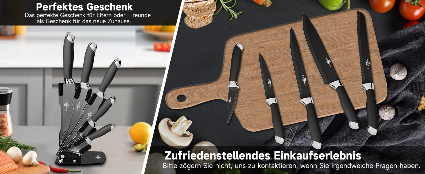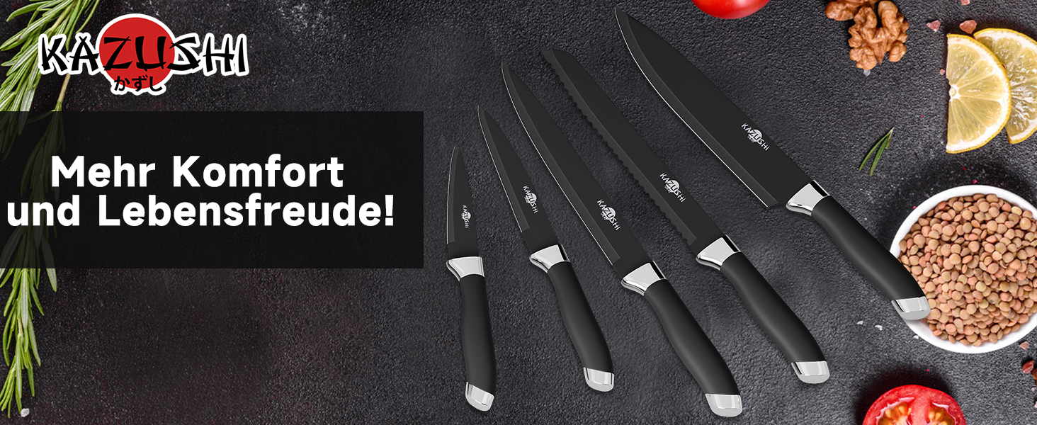 KAZUSHI Messerblock mit Messer 6-teilig, Scharfe Küchenmesser, Profi Messerset mit Block, Edelstahl Messer Set - Schwarz (KA-KN62)
