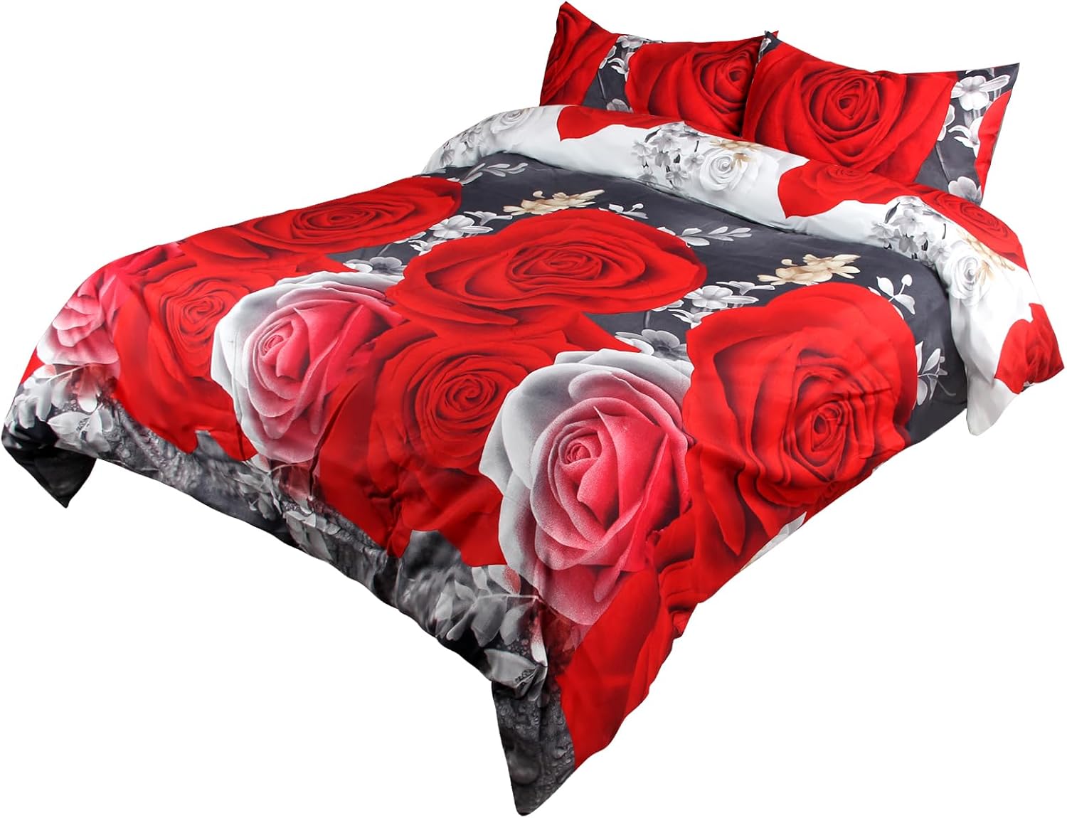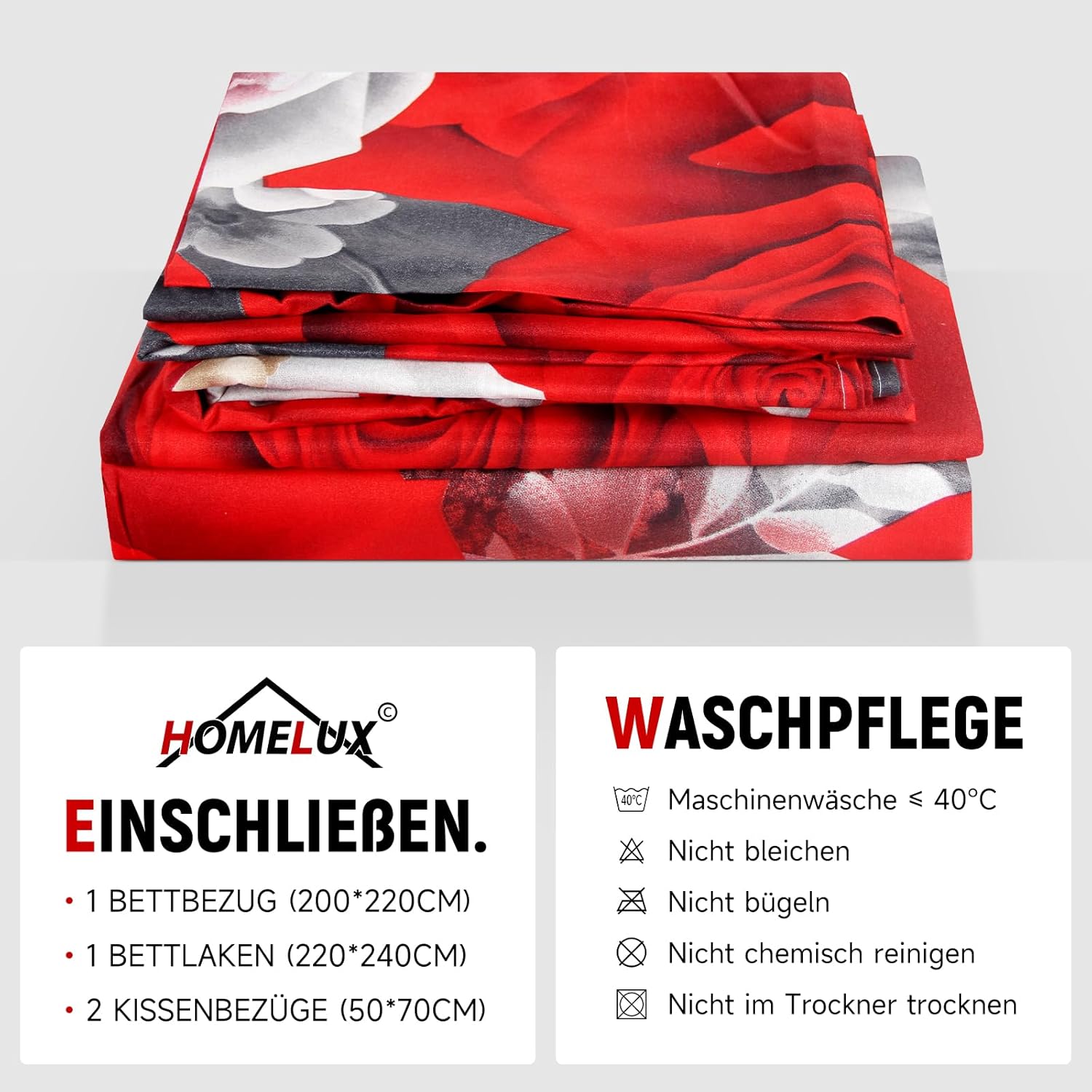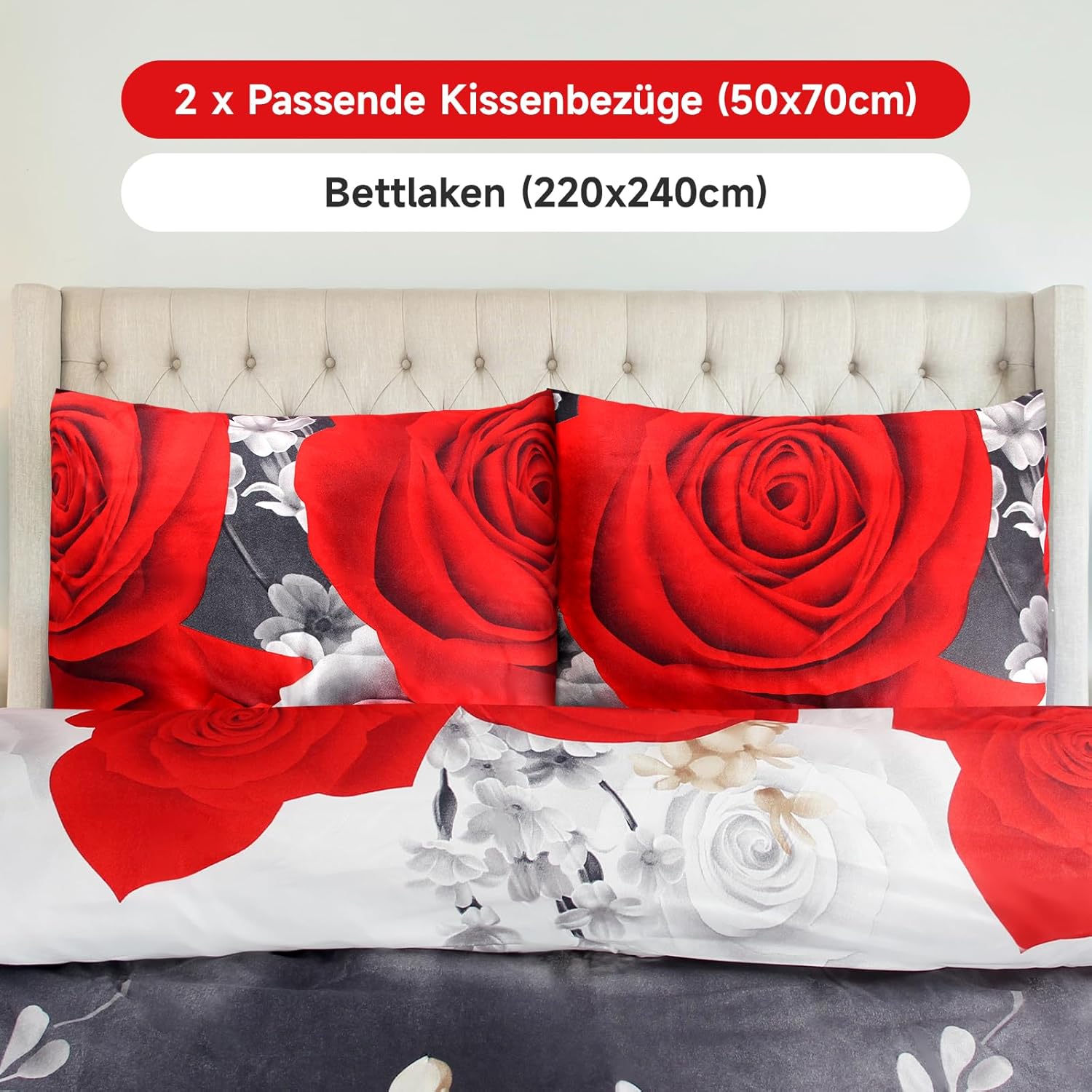 HOMELUX Bettwäsche-Sets 220x240 4teilig - 1 Bettbezüge 200x220 cm + 1 Bettwäsche 220x240 cm + 2 Kissenbezüge 50x70cm, aus Polyester Mikrofaser mit Reißverschluss, Weich und Bügelfrei, Rose Flower3(HL-4CSD168)